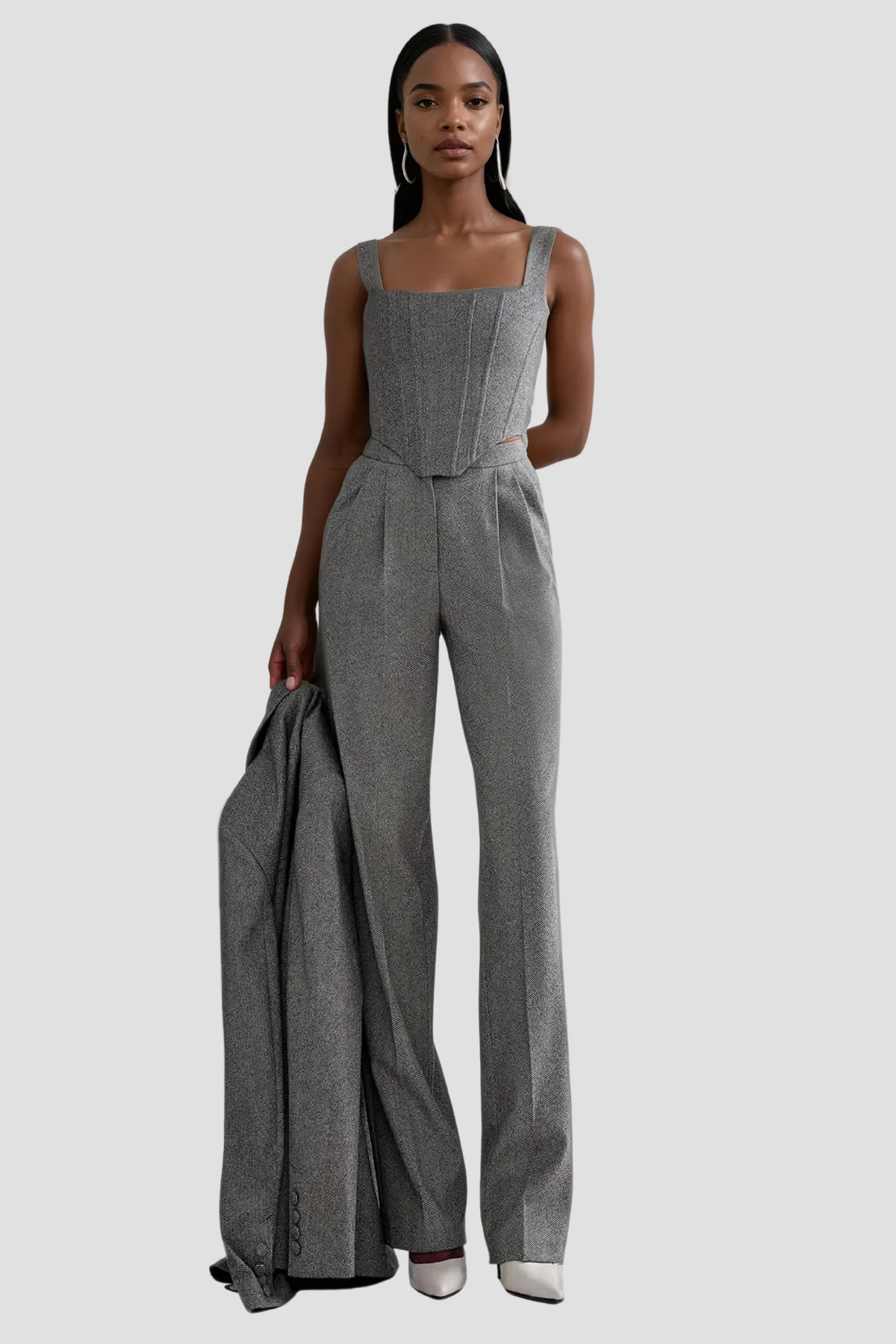 Elevate your wardrobe with the Lapel Three-Piece Grey Pants Set. This chic essential features a strapless design and modern style, offering versatility and sophistication to any outfit. Crafted from a blend of 50% Polyester and 50% Cotton, this set is both comfortable and durable, suitable for any occasion. Upgrade your look with this Rebel Office must-have that exudes confidence and elegance. Color may vary in different lighting conditions. Gentle machine wash recommended for easy cleaning. Embrace a renewed sense of style with this trendy and fashionable ensemble.
