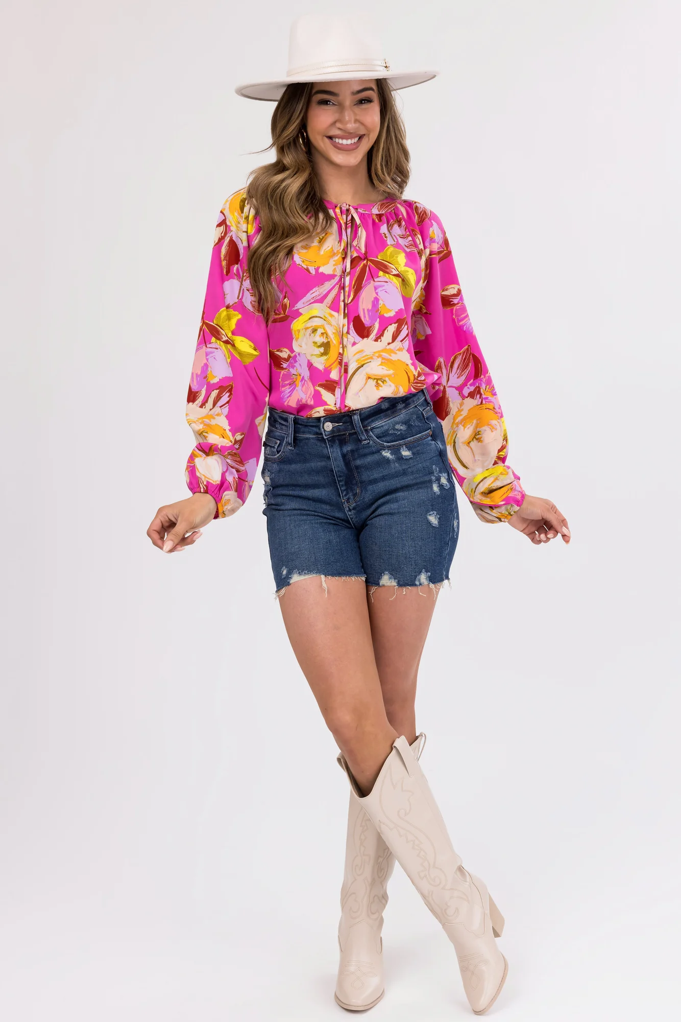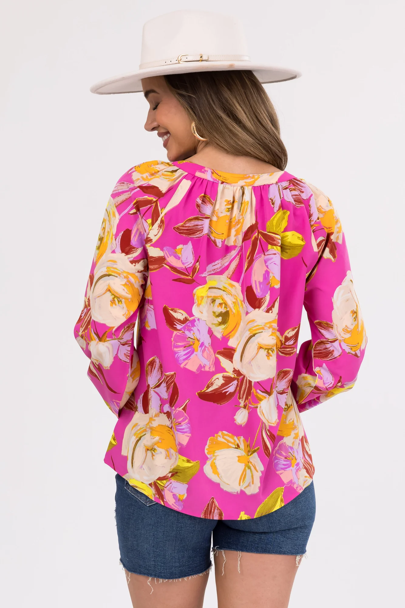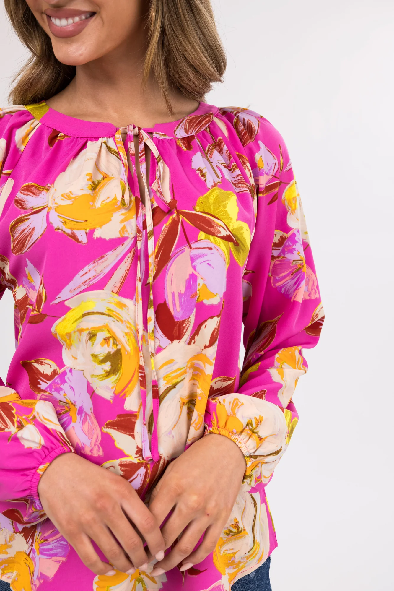 Experience elegance with our Mulberry Floral Print Blouse available in sizes S, M, L, and XL. Made of non-stretchy woven fabric, featuring long puff sleeves with an elastic cuff, V neckline with a tie option, and a stunning floral print in shades of Mulberry, Mahogany, Cream, Mango, Iris, and more. This unlined blouse is imported and crafted from 97% Polyester and 3% Spandex, ensuring a unique look for every piece. Hand wash cold for best care. Elevate your wardrobe with this chic blouse thats perfect for both daytime and work occasions.