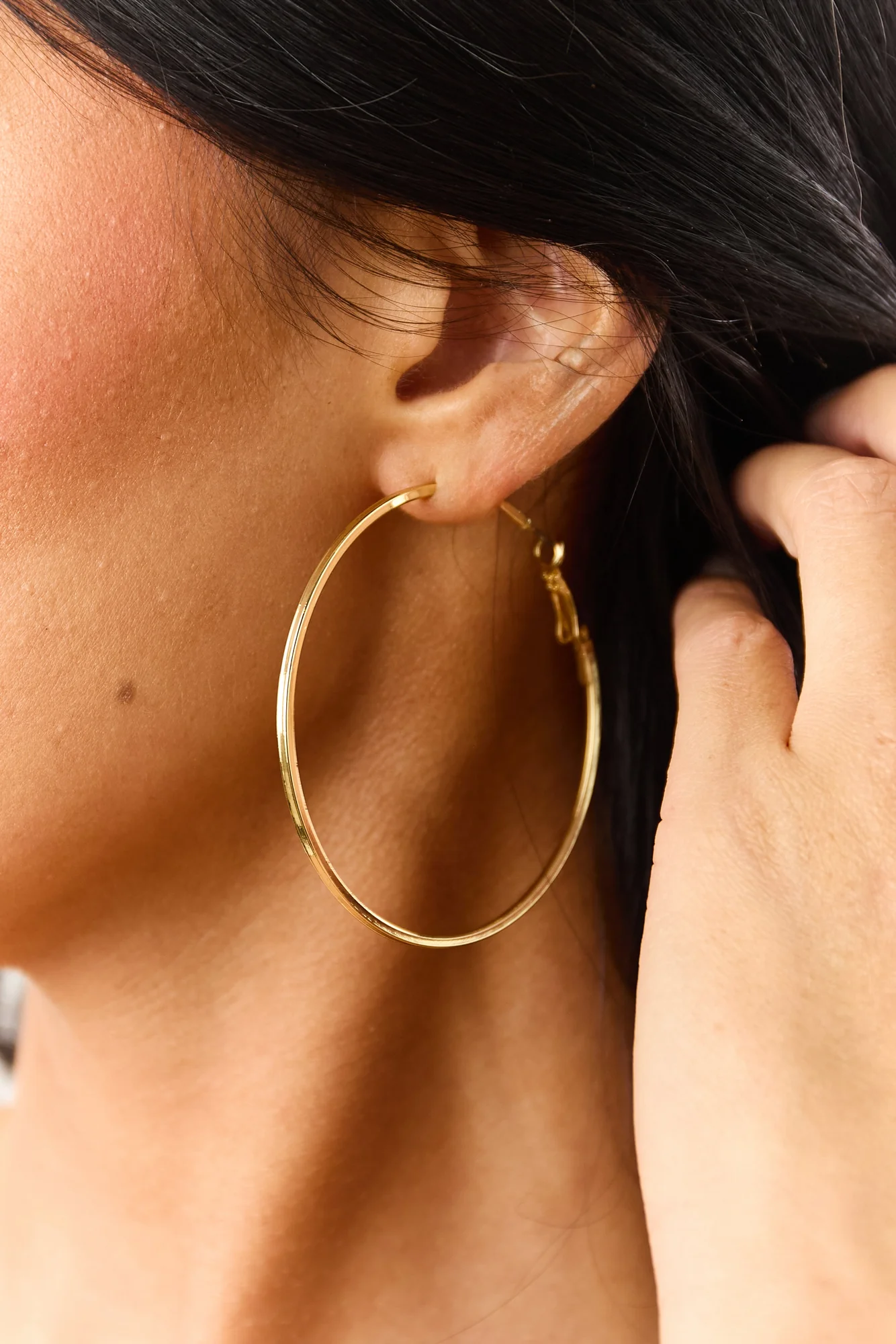 Discover the elegance of these large gold hoop earrings with a convenient latch closure. Made of gold metallic material, these earrings boast a drop length of 2.5 inches. Imported for exceptional quality. Elevate your style effortlessly with these statement earrings. This item is final sale.