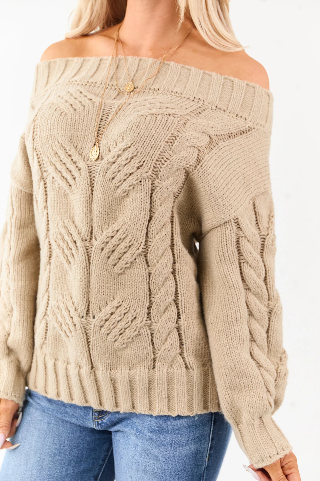Indulge in the comforting charm of our Latte Cable Knit Off-Shoulder Sweater. Available in sizes S, M, and L with bust measurements ranging from 42″ to 46″ and length from 23″ to 24″. Its feminine design features include a relaxed fit, stretchy cable knit, and banded ribbed trim for a stylish touch. Made of 100% Polyester. Perfect for the upcoming fall season, this top exudes warmth and elegance effortlessly. Model is 57″ tall, size Small, with a bust of 35″ and waist of 26″.
