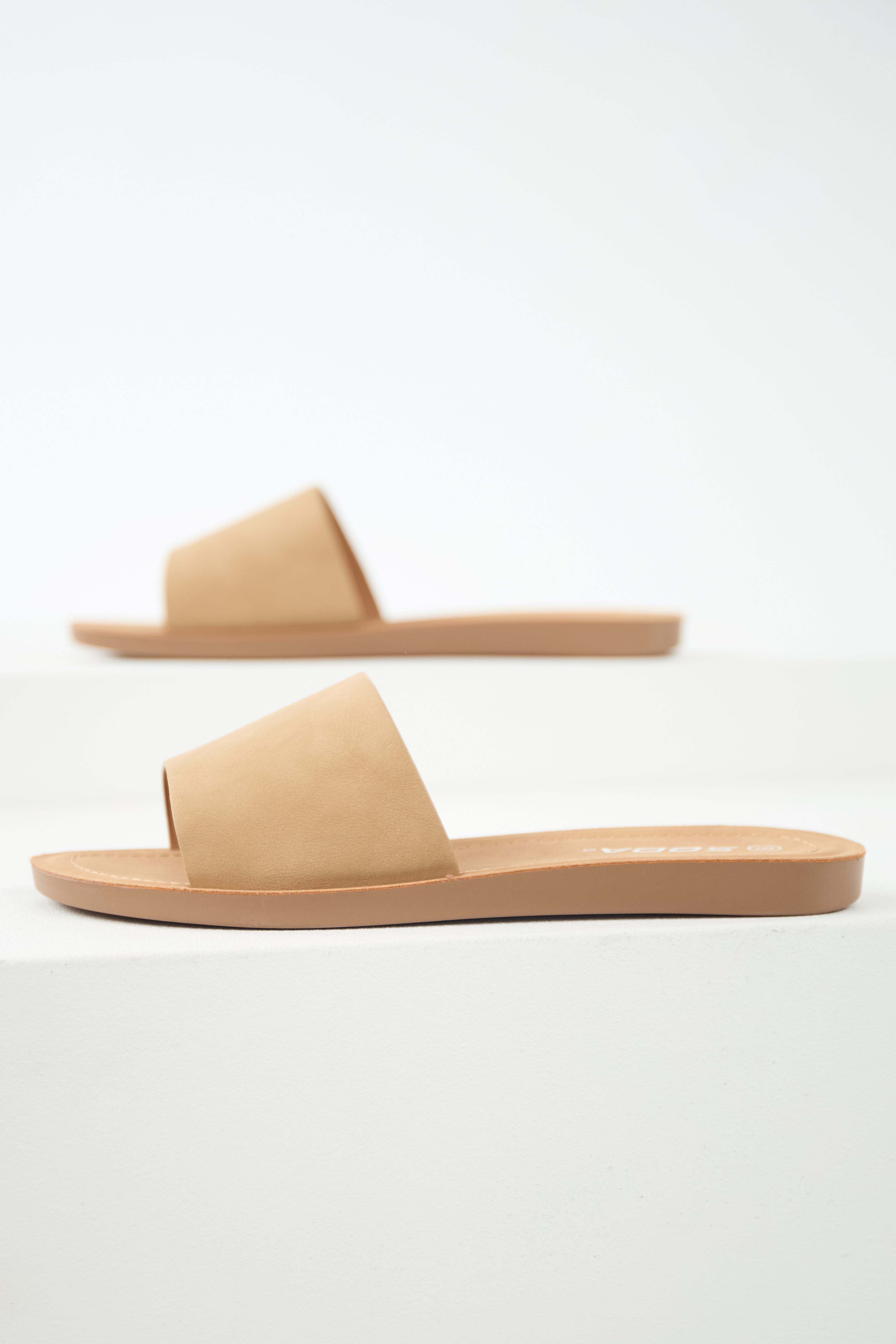 Tags: casual wear, Faux Leather, Latte Flat Slide Sandals, Open Toe, Woven Straw Band