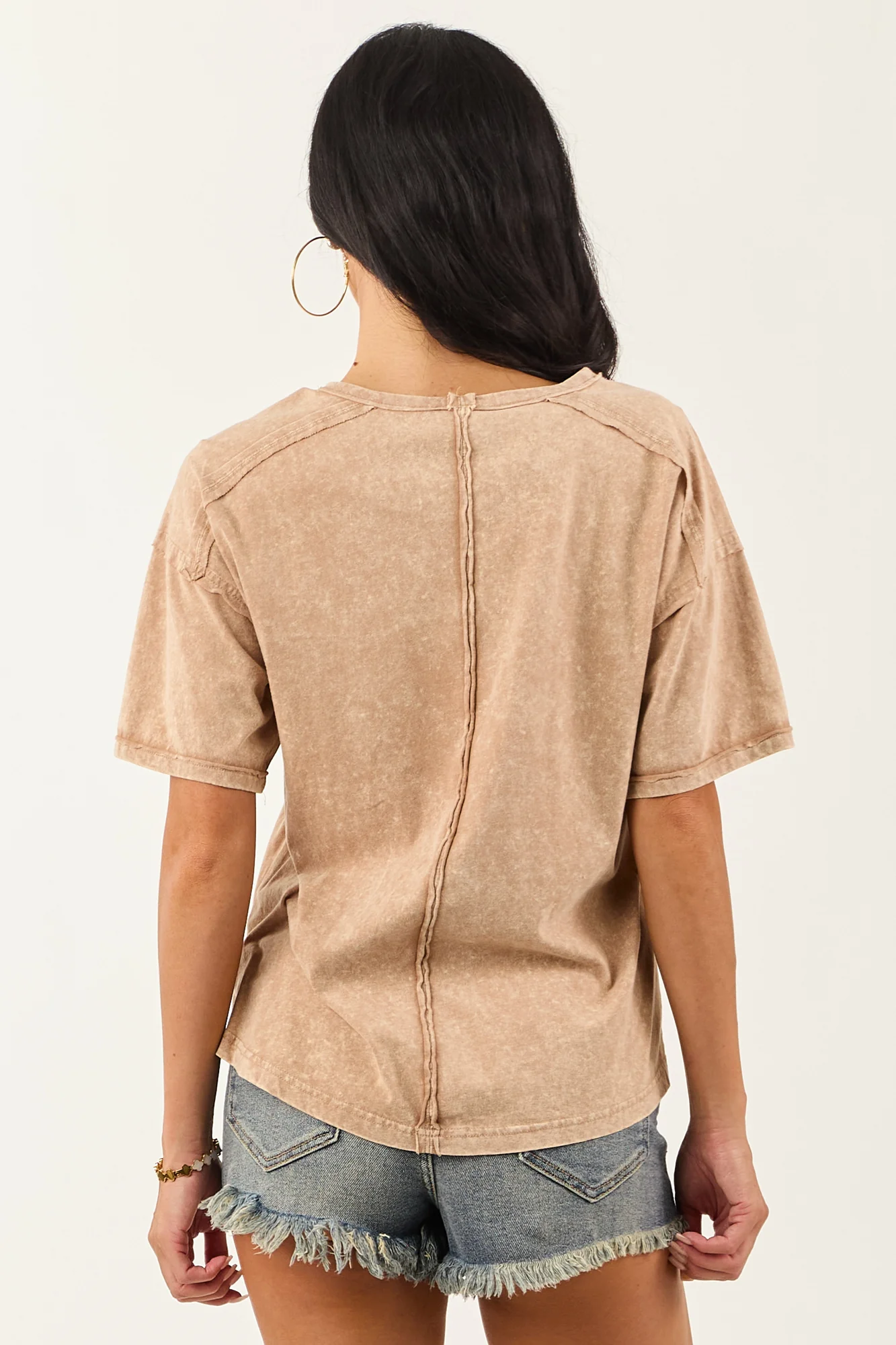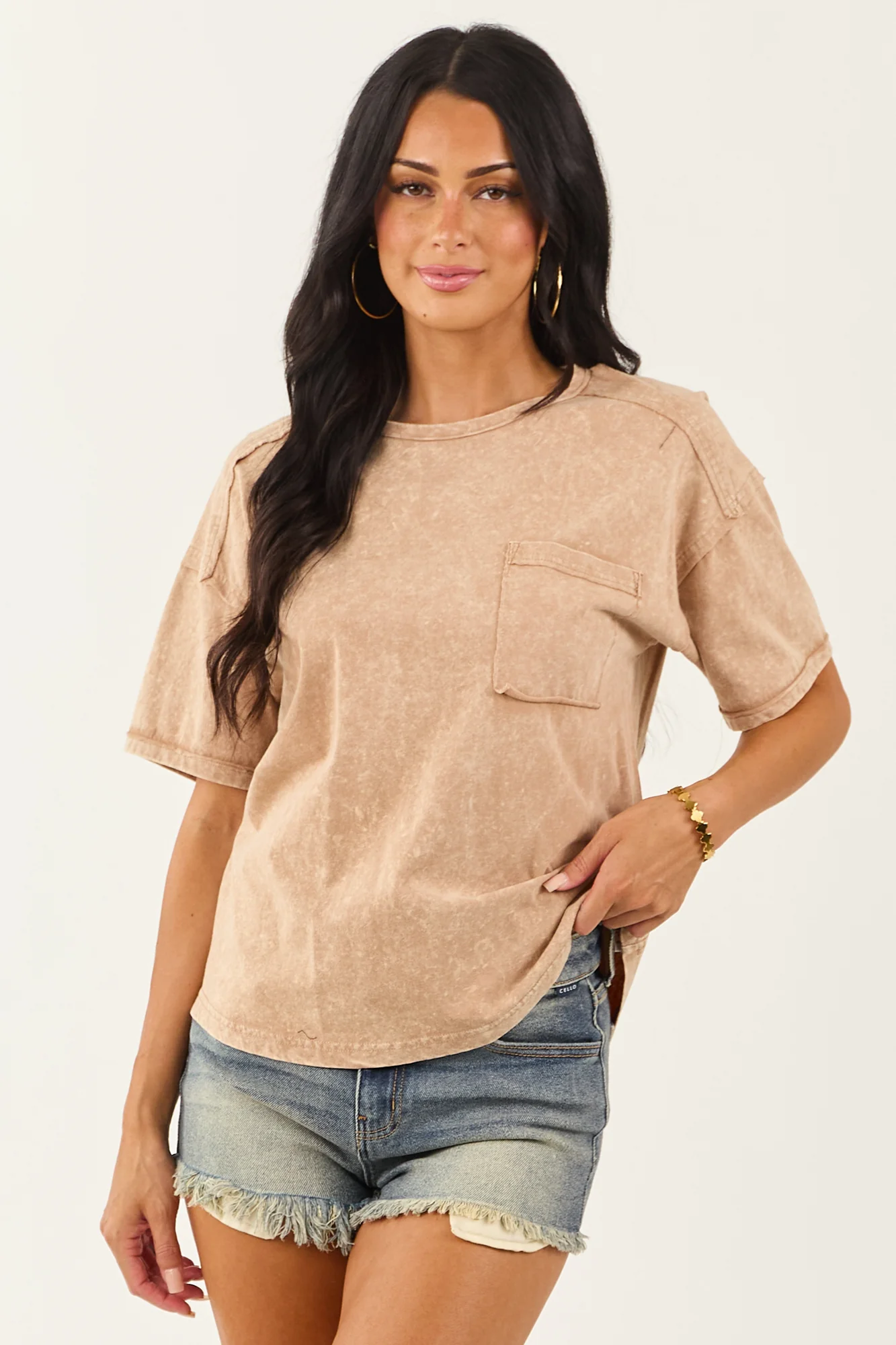 This latte mineral-washed tee offers an oversized fit and is crafted from ultra-soft cotton for unmatched comfort. Ideal for casual styling with high-waisted jeans or biker shorts, this tee features a chest pocket, drop shoulders, and stretchy soft knit fabric. Embrace the laid-back, lived-in look effortlessly. Imported. Available in sizes S, M, and L. Bust: 40-44 inches. Length: 25-26 inches. Sleeve Length: 10-12 inches.