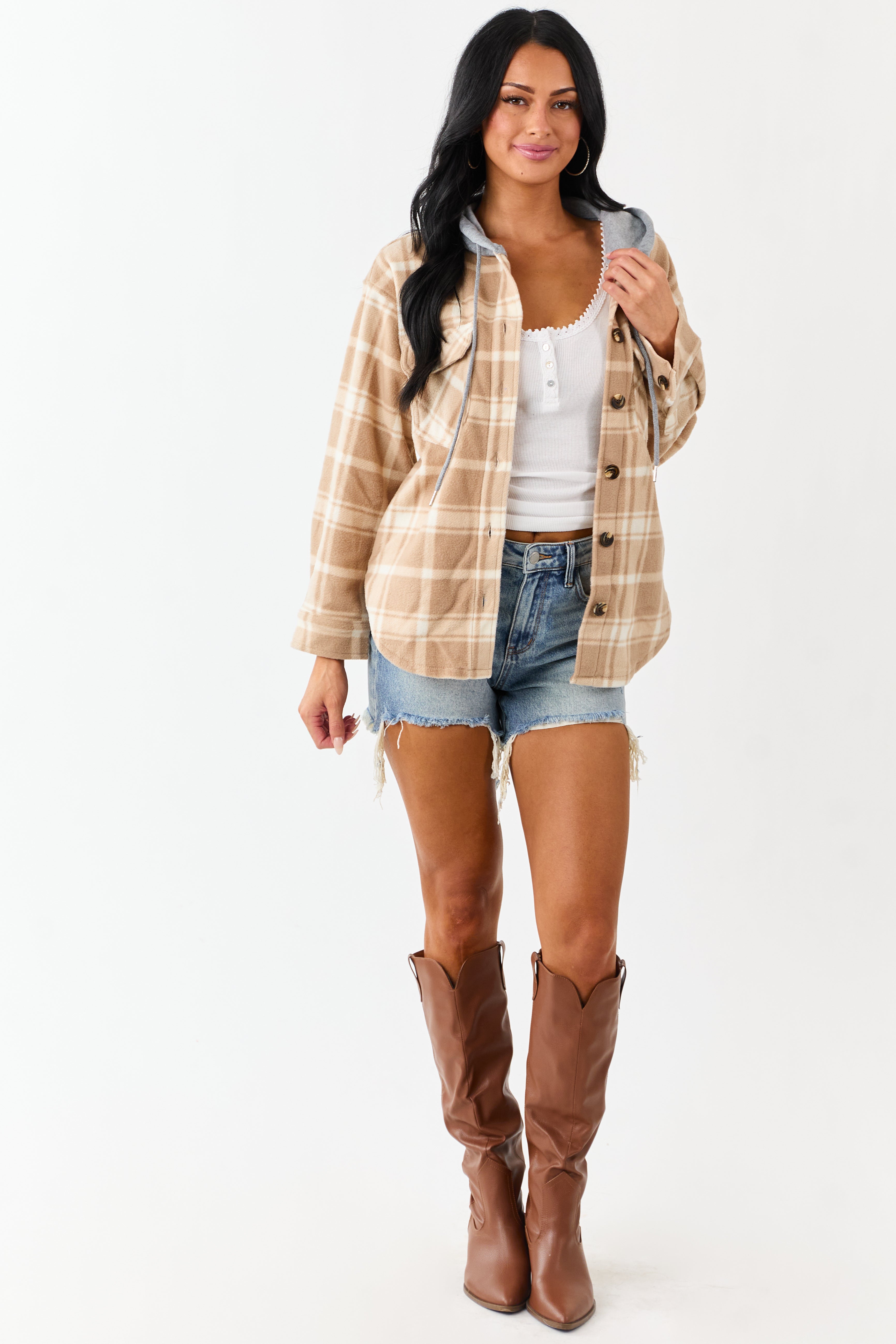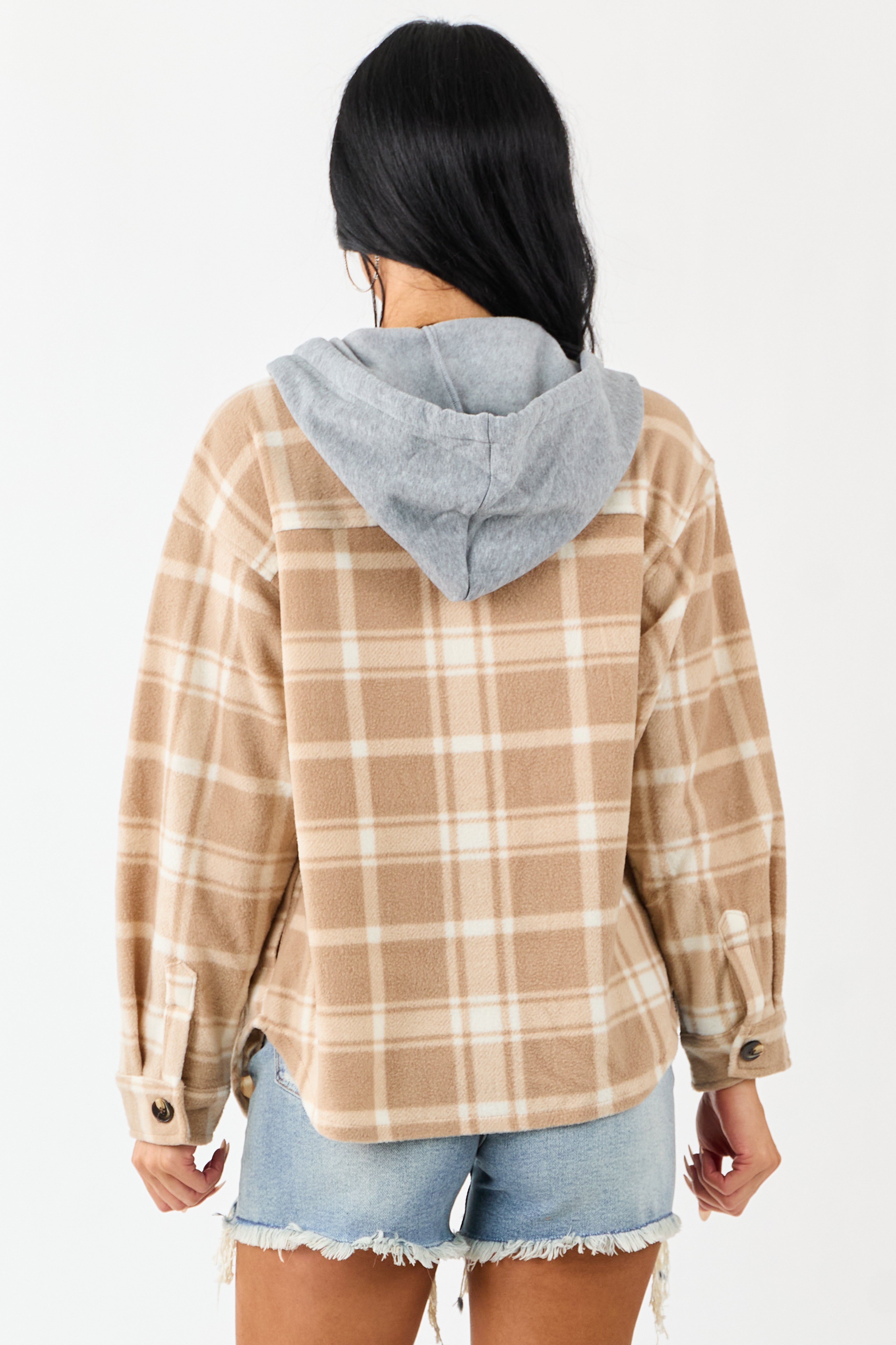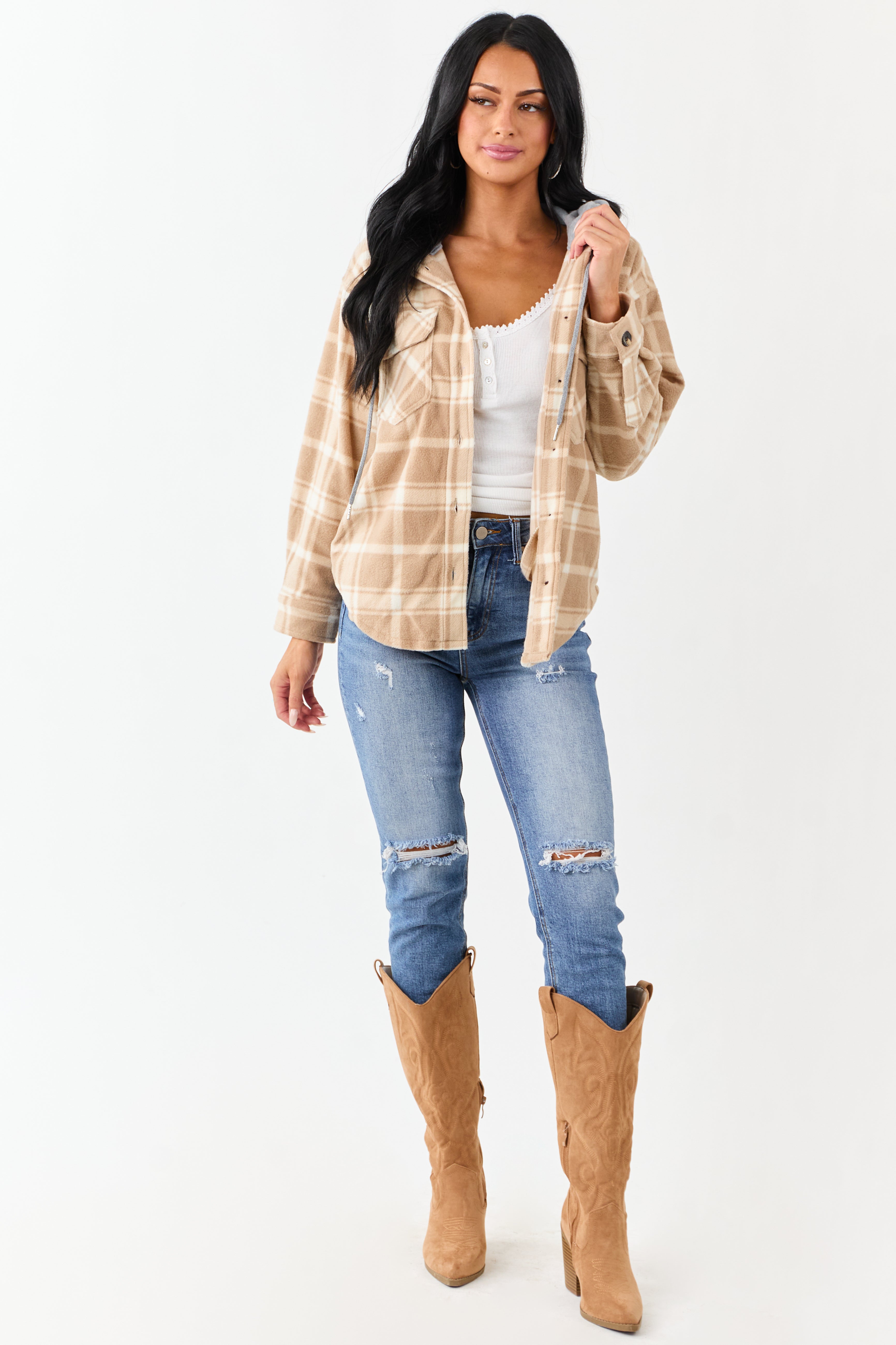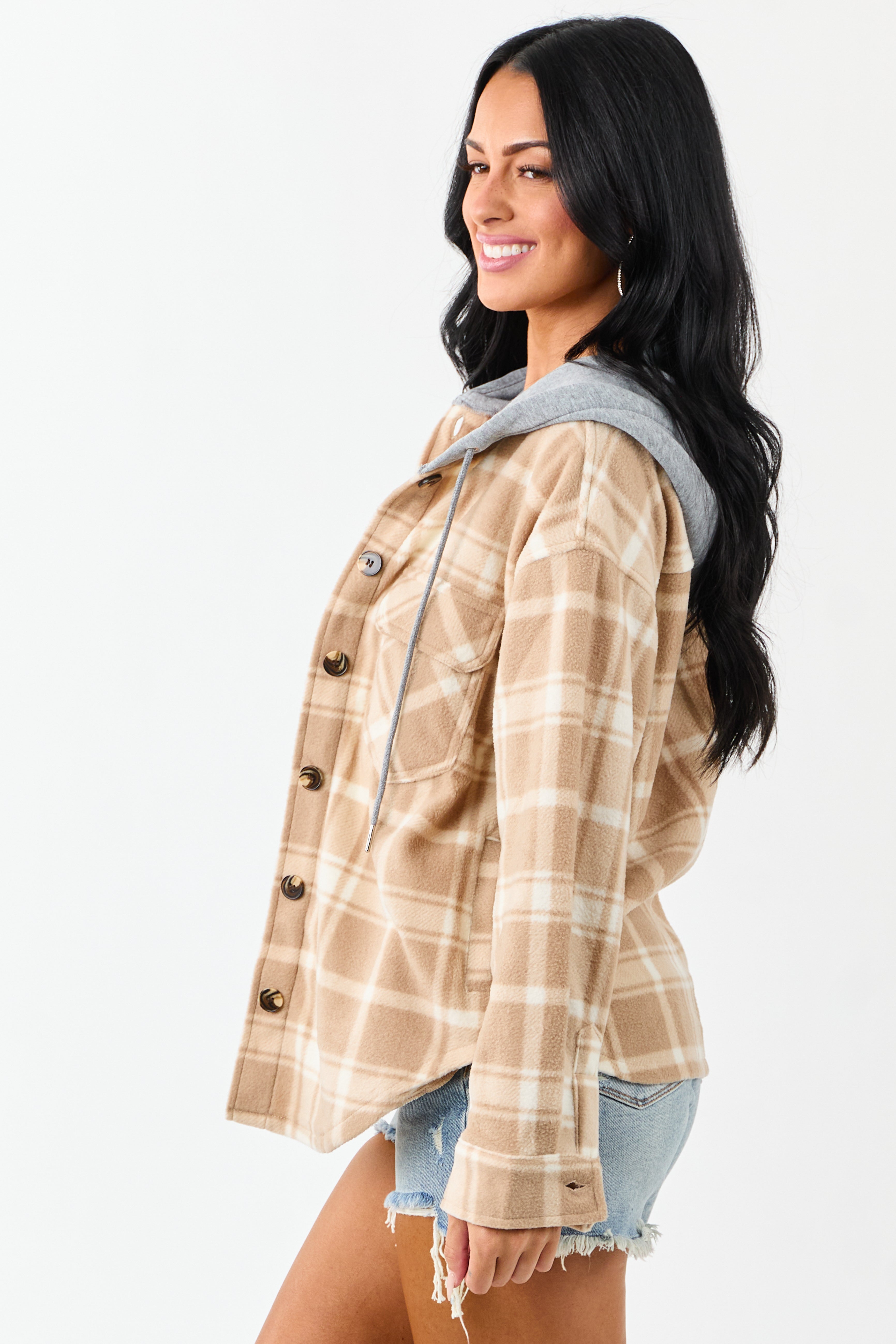 Stay stylish and warm with this soft fleece jacket in beautiful Latte, Nude, and Ivory plaid. Featuring a cozy hood with a contrasting drawstring, button cuffs, and four pockets, this jacket is perfect for everyday wear. Made of 100% polyester for comfort and durability. Please note that due to the unique cutting and sewing process, each piece may vary slightly. Model is wearing a size Small — Height: 59, Bust: 34, Waist: 26.