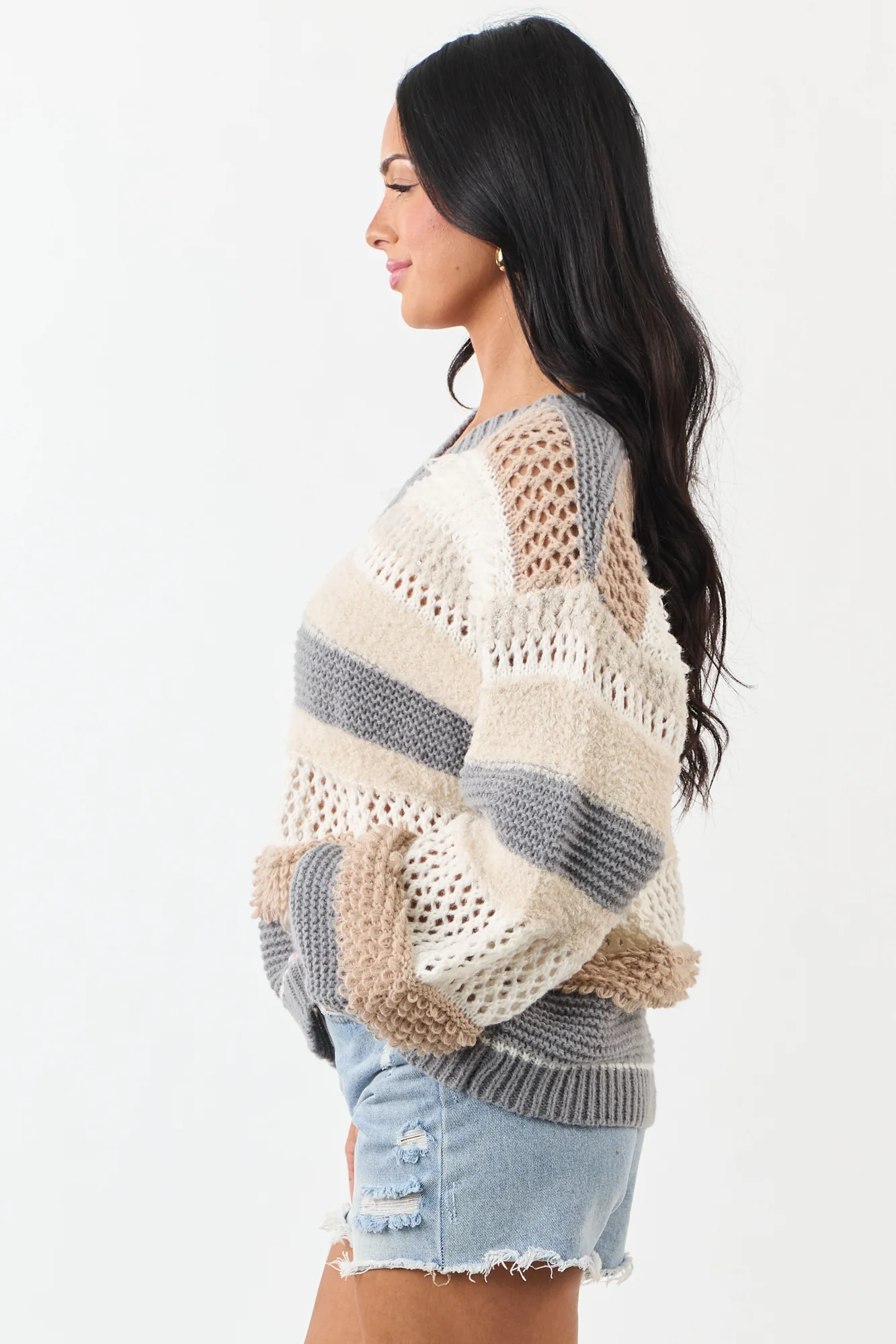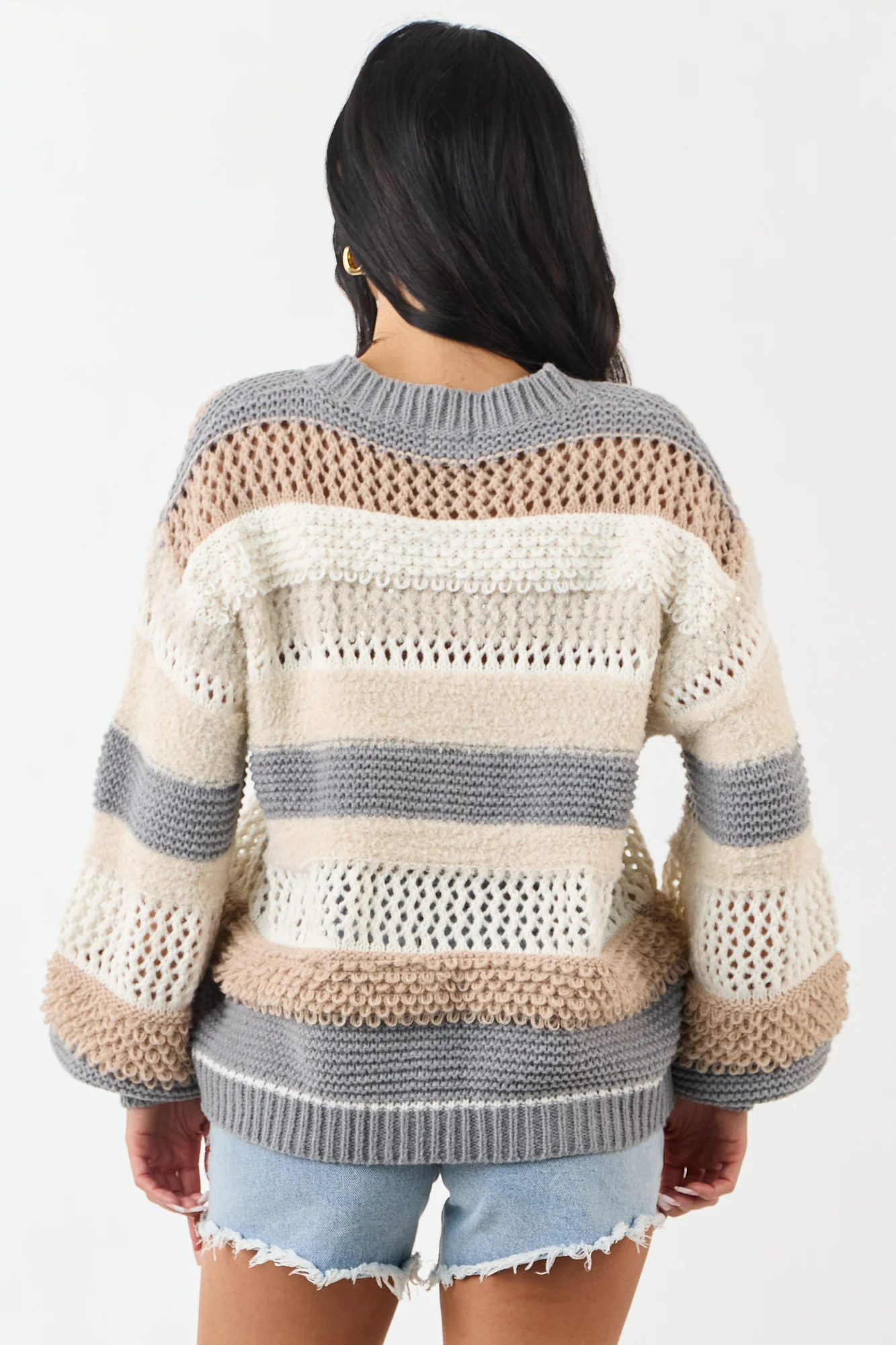 Stay cozy and stylish in our Latte Striped Knit Oversized Sweater with Sequin Accents. This sweater features ultra-soft knit textures, open knit panels, and a charming combination of neutrals including Latte, Cream, Stormy Grey, and Oatmeal. The oversized fit and stretchy ribbed knit offer ultimate comfort and style. Adorned with silver sequins on the contrast stripes, it includes long bubble sleeves for a fashionable touch. Made of 100% polyester. Please note that due to the nature of the fabric, the print, cutting, and sewing process, slight variations may occur. Model is wearing a size Small.