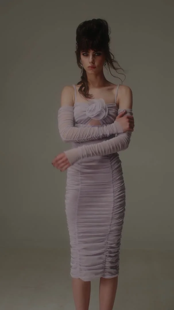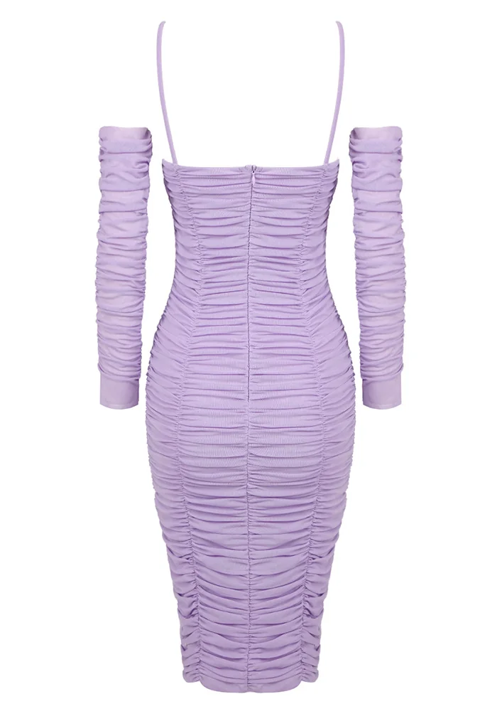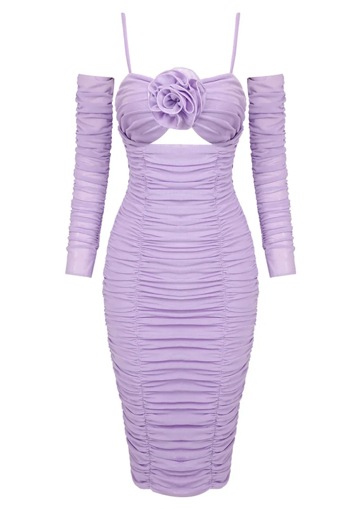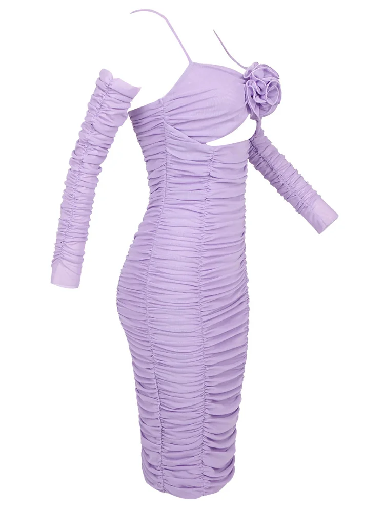 Indulge in the elegance of our Lavender Floral Long Sleeve Ruched Midi Dress, featuring a flattering V-neck, exquisite flower detailing, and ruched design for a sophisticated look. Crafted from a blend of Polyester, Cotton, and Silk, this dress ensures comfort and style. Delicately sewn with precision and a YKK zipper, this garment exudes durability and quality. Embrace the beauty of this piece with gentle dry cleaning, and enjoy its versatile mid-calf length.