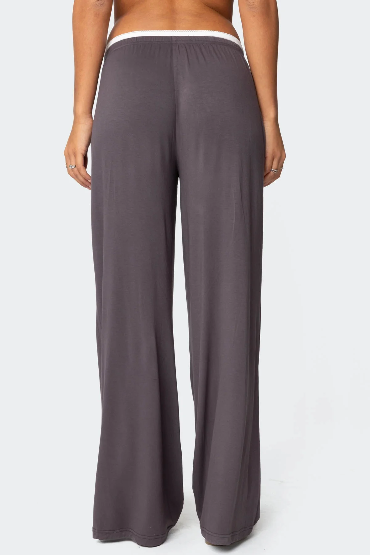 Indulge in luxurious comfort with these layered gray sleepwear pants for women. Featuring an elastic waistband and center rose detail, these pants are crafted from rayon and spandex blend for a perfect blend of style and comfort. The model is wearing size S and is 58 tall. Care instructions: Machine wash with similar colors.