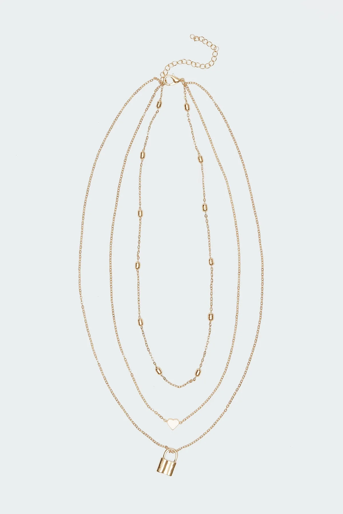 Discover the elegance of our triple-layered Lock Necklace crafted from high-quality gold tone metal. Featuring assorted shapes and a stunning lock pendant, this necklace exudes sophistication and style. Measurements: Length 24.4 inches, Width 0.4 inches. Care Instructions: To maintain its luster, avoid direct contact with perfume, soap, or creams.
