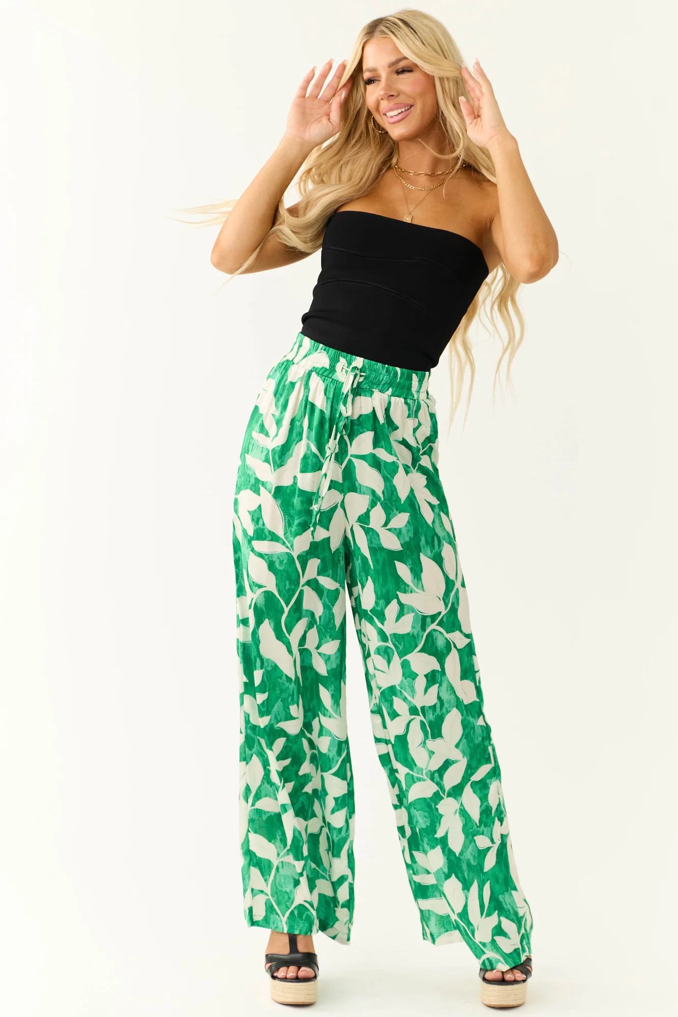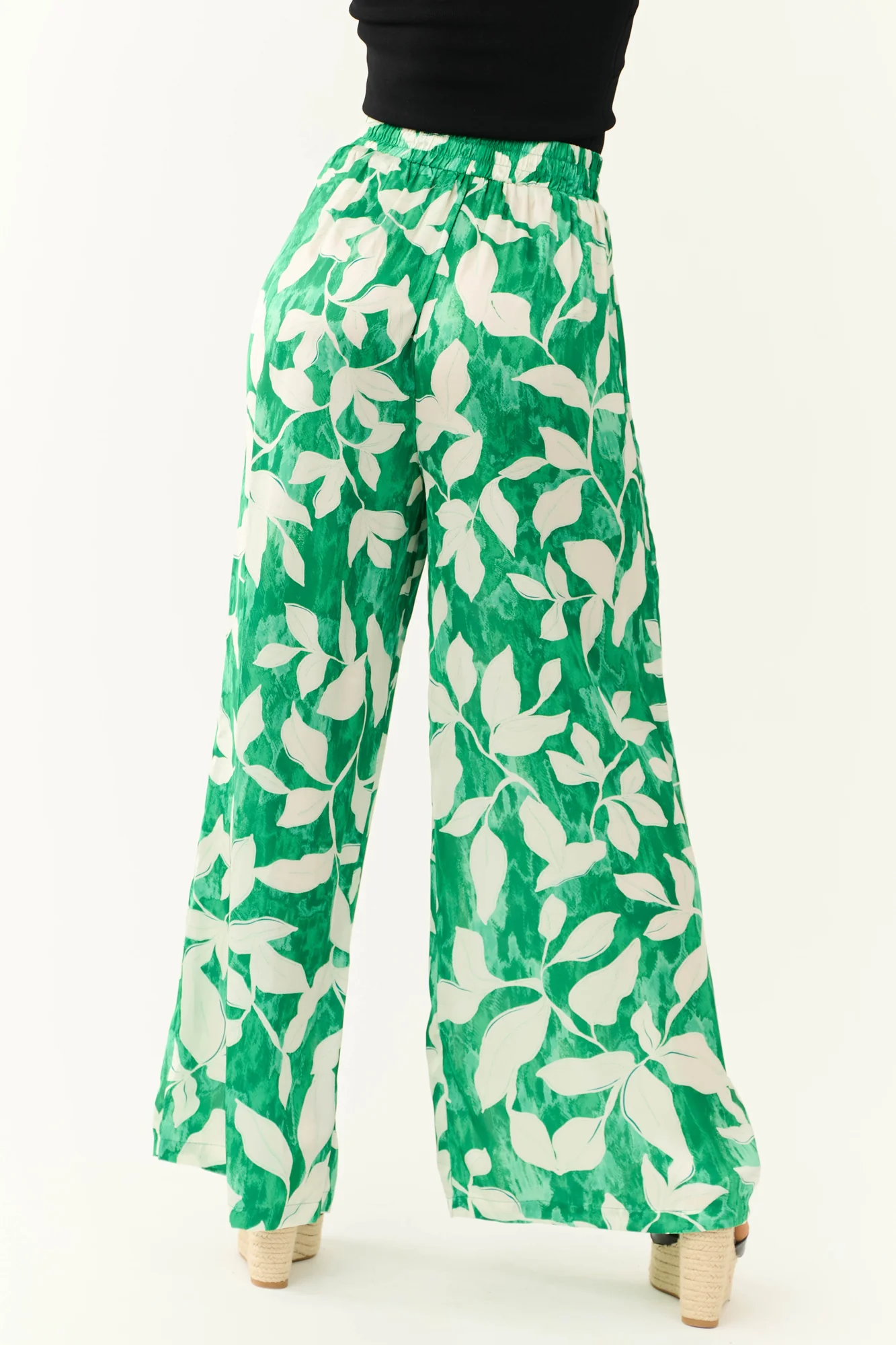 Step out in style with these elegant Leaf Print Satin Wide Leg Pants in Jade Green . Crafted with non-stretchy woven satin material, these pants feature a wide leg design, an elastic drawstring waist for a comfortable fit, and a high-waisted silhouette. The off-white leaf print adds a touch of nature-inspired charm, making these pants perfect for daytime outings or parties. They are unlined and made of 100% polyester. Please note that due to the unique print and manufacturing process, each piece may have slight variations. Pair them with the matching Flying Tomato Jade Leaf Print Satin Shirt for a coordinated look. Care instructions: Hand wash cold, wash separately, do not bleach, lay flat to dry, do not iron, do not dry clean. Model is wearing a size Small. Model’s Measurements: Size 1, Height 57″, Bust 34″, Waist 26″.