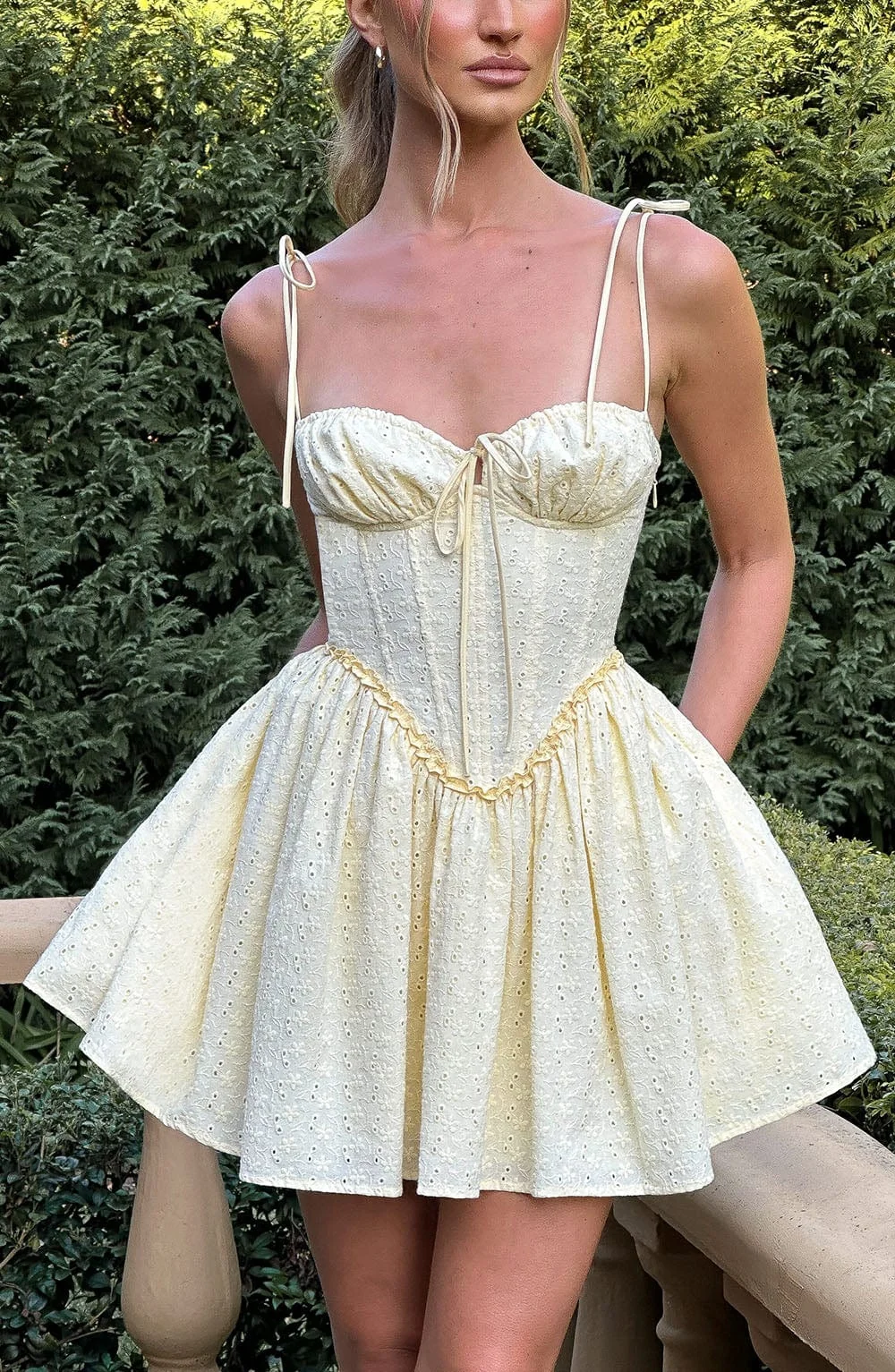 The Lemon Cotton Broderie Anglaise Mini Dress is ideal for various occasions like garden parties, date nights, and more. It features a super-full feminine skirt, a figure-enhancing boned bodice with underwired cups, delicate tie details, and adjustable straps. Made from premium cotton broderie anglaise, this mini dress includes boning in the bodice, a lace-up back, and an invisible zipper. Complete your look with pointed heels and softly waved hair. Available in XS to XXL sizes.