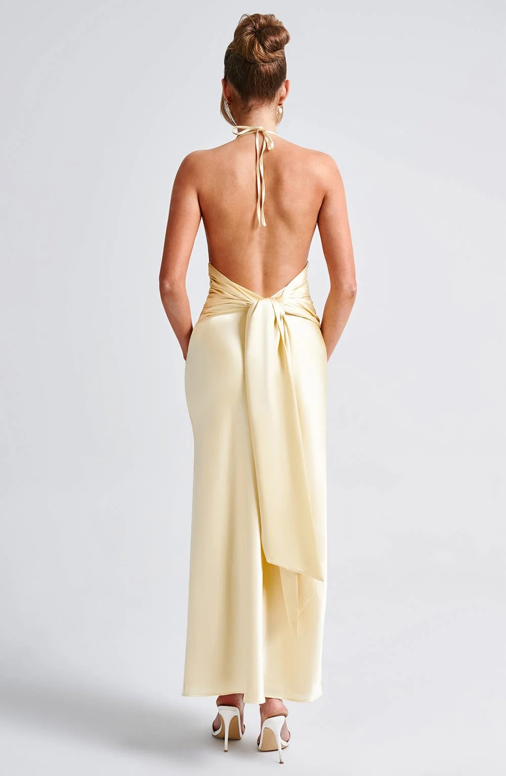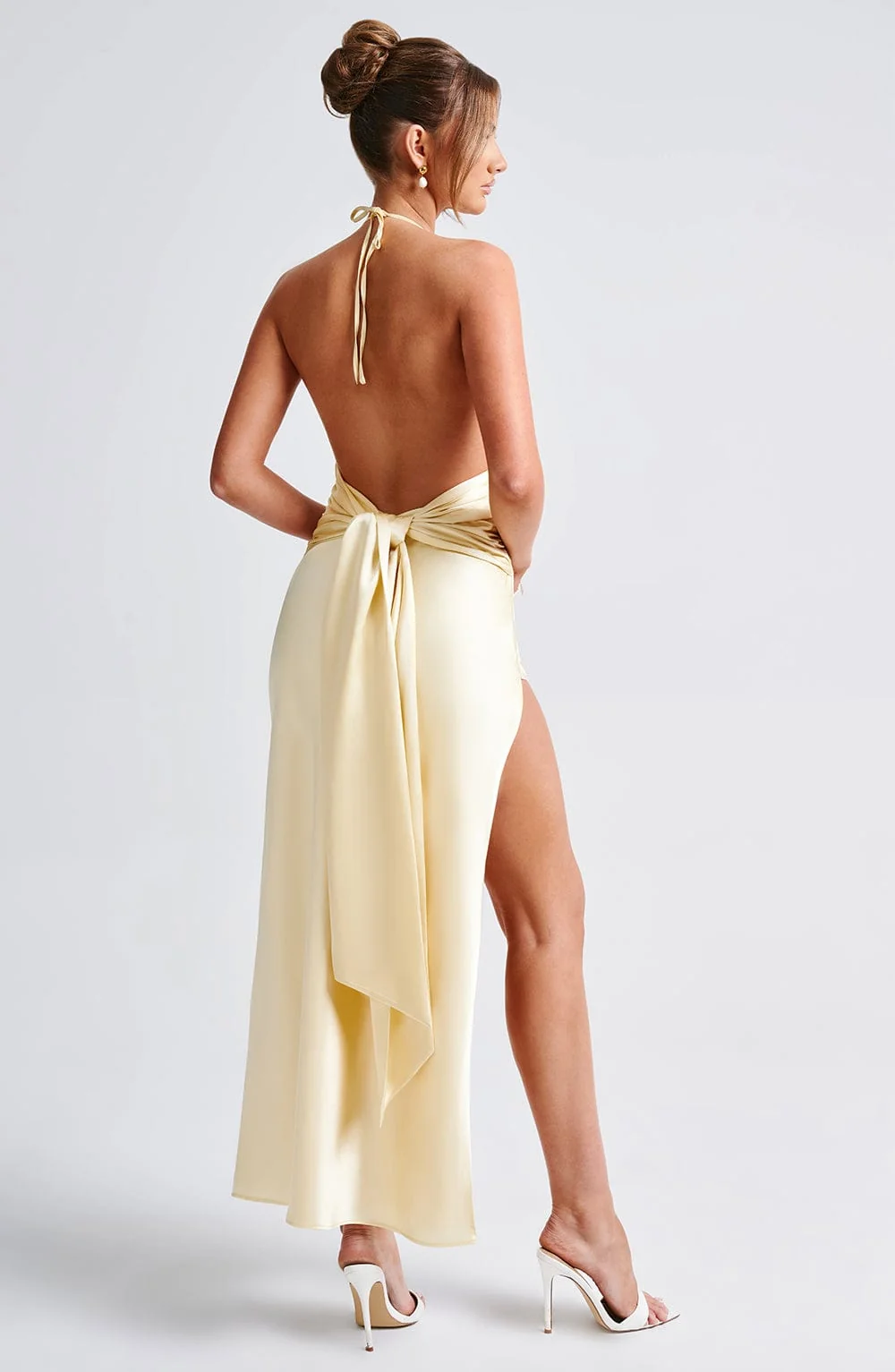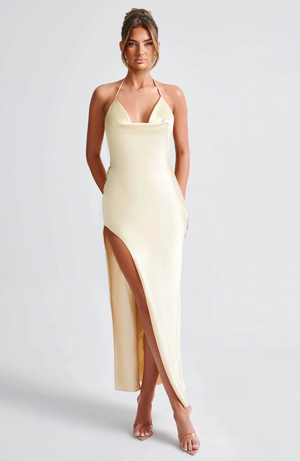 Elevate your evening with Kiandra Maxi Dress in Lemon. This formal evening gown features a cowl neckline, a low scoop back, and a thigh-high split, adding a dramatic touch to your look. Crafted from premium non-stretch satin, it glides over your figure effortlessly. Complete the ensemble with statement earrings and a glossy lip to captivate the crowd all night long. Indulge in luxury with this radiant Lemon Maxi Dress. Fully lined for comfort. Ideal for weddings, parties, formals, and special events. Available in sizes XS to XXL.