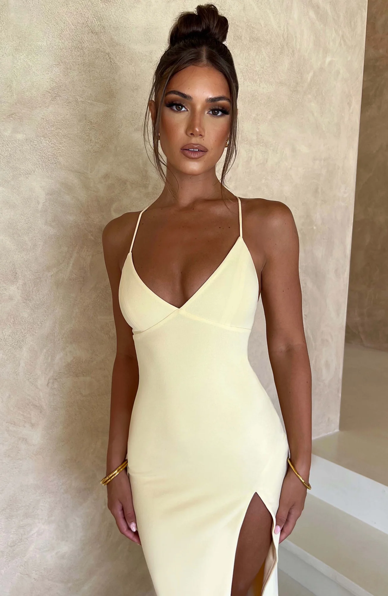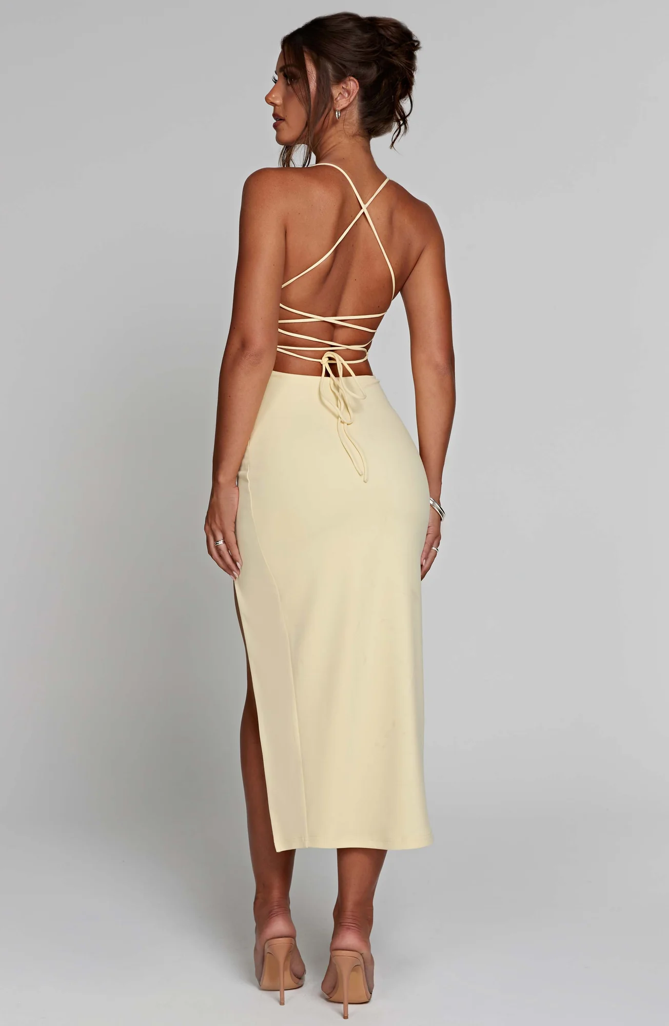 Elevate your style with the Lemon Double Layered Midi Dress, crafted in our signature fabric for a snug fit. Featuring a plunging neckline, thigh high split, and a captivating low back with cross over tie straps. This dress is perfect for all your special occasions. The stretch double layered fabric ensures comfort and style. Ideal for daytime, evening, formal events, or holiday celebrations. Available in sizes XS to XXL.