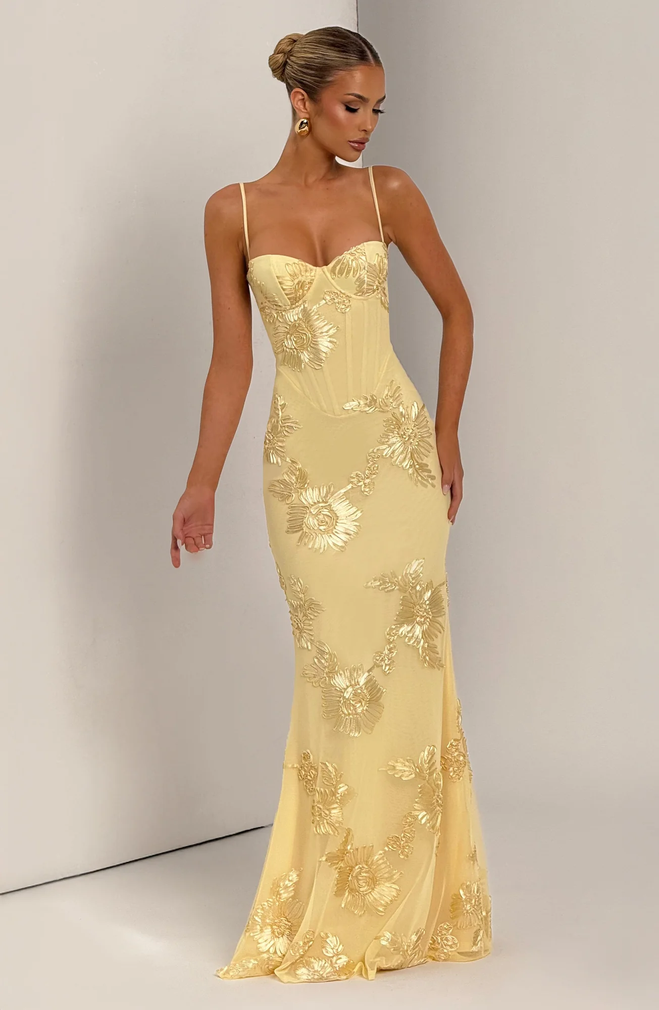 Experience elegance with our Lemon Floral Ribbon Applique Maxi Dress. Crafted from stretch mesh fabric, this stunning dress features underwired cups, spaghetti straps, and an open lace-up back. The internal corset with boning accentuates your silhouette, while the fit-and-flare skirt adds a touch of glamour. Ideal for formal occasions, evening events, weddings, or proms. Available in sizes XS to XXL.