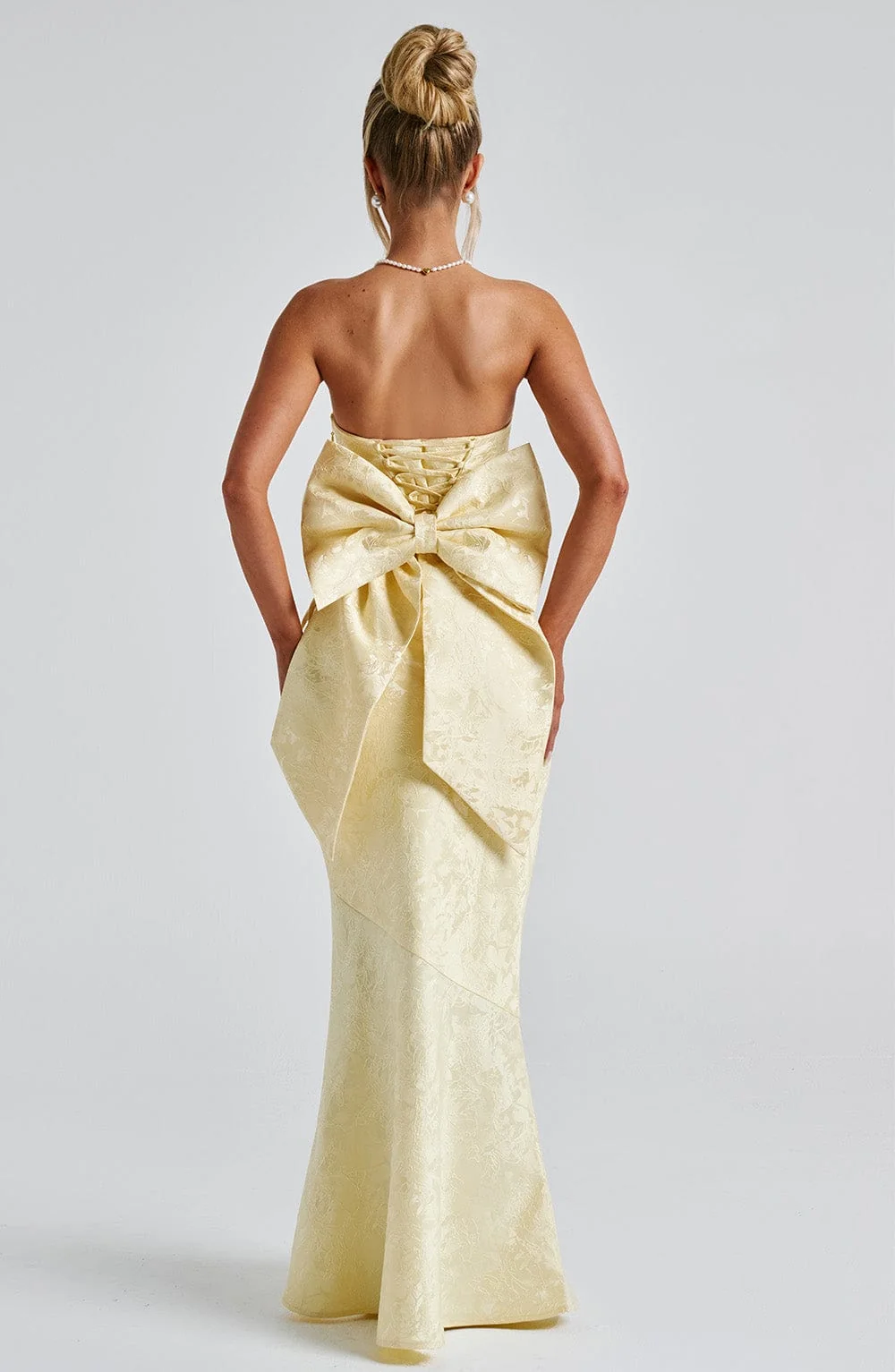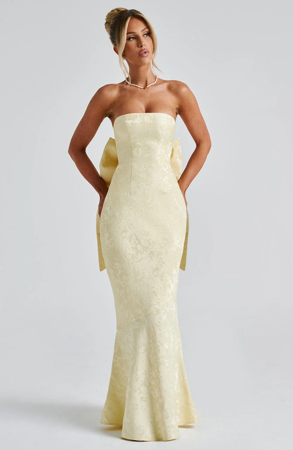 Lemon Jacquard Fit and Flare Maxi Dress with Oversized Bow – Womens Elegant Strapless Dress