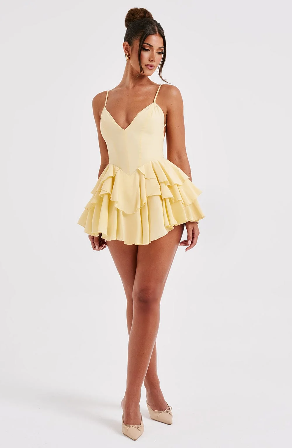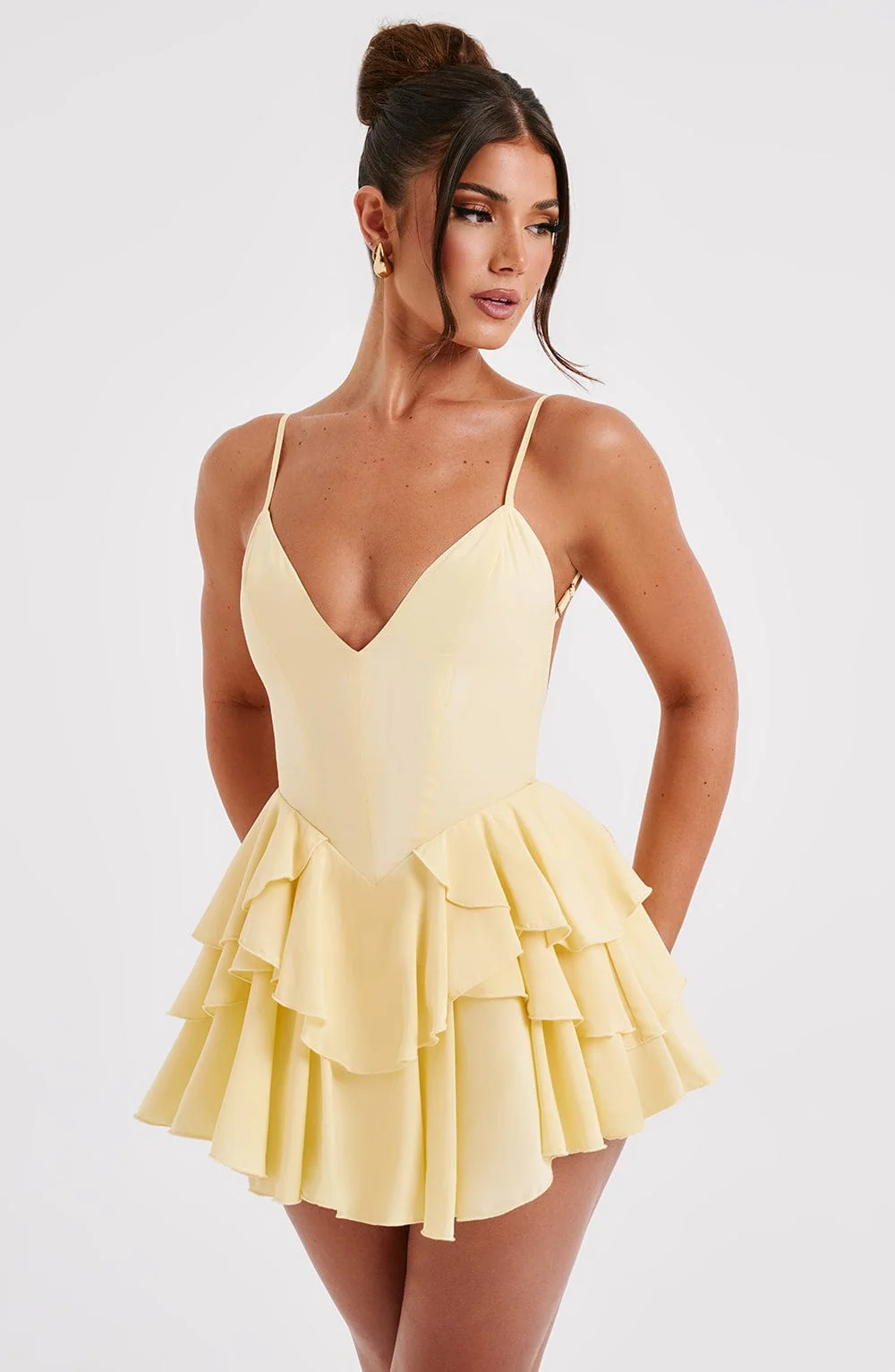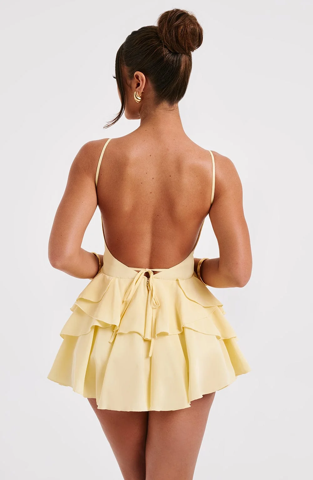 Elevate your style with our lemon yellow jumpsuit crafted from premium non-stretch chiffon. This backless design features a plunging neckline, layered ruffle skirt with built-in shorts, and adjustable straps for a perfect fit. Whether its a brunch or evening event, this mini-length jumpsuit paired with heeled sandals is a must-have for your wardrobe. Fully lined and adorned with internal tie at waist, this jumpsuit exudes elegance and comfort. Embrace the sunny vibes and stand out effortlessly. Available in sizes XS to XXL.