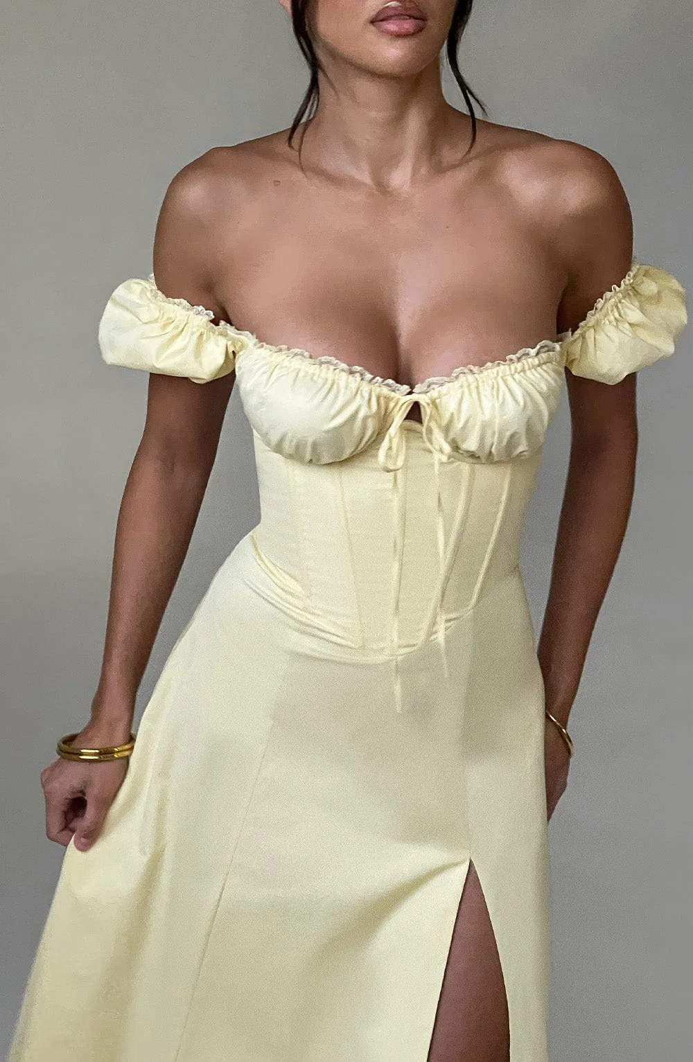 Elevate your style with our Lemon Puff Sleeve Midi Dress. Featuring dreamy puffed sleeves that can be worn on or off the shoulders, a snatched waist with a pretty tie detail, voluminous skirt, and thigh-high split. Made of premium non-stretch cotton blend fabric, fully lined, underwired bust, elasticated puff sleeves, corset style bodice, shirred lace-up back, and more. Perfect for weddings, birthdays, brunches, parties, and proms. Length: Midi. Model in XS.