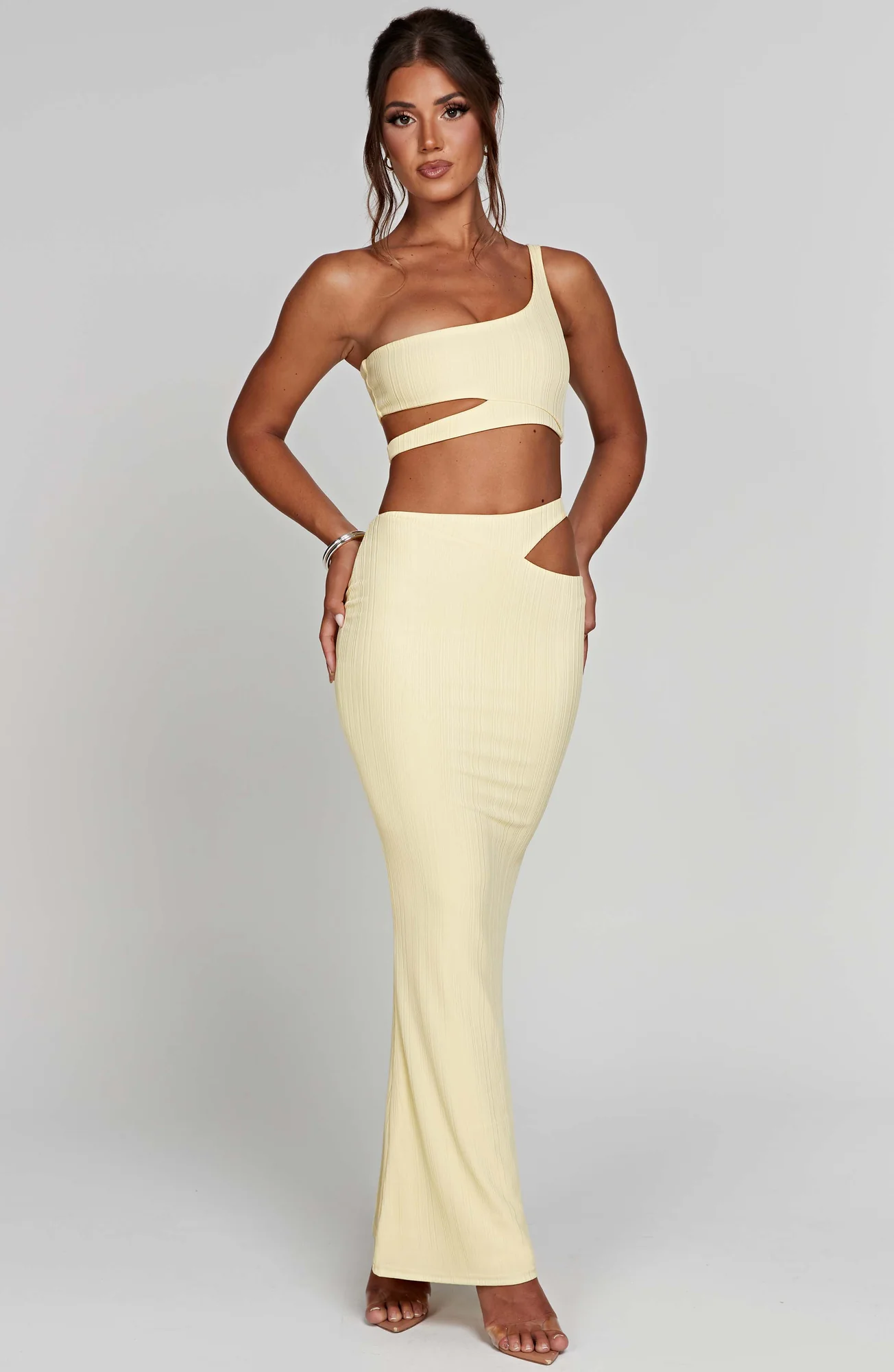 Indulge in the modern allure of the Lemon Ribbed One Shoulder Crop Top in Kaela style. Crafted from luxurious textured rib fabric, this body-hugging top features an asymmetric design with a chic cut-out detail at the hem. Elevate your look with sleek gold hoops and the matching Kaela maxi skirt. Designed for a perfect fit that molds to your curves. Ideal for various occasions and sizes from XS to XXL.