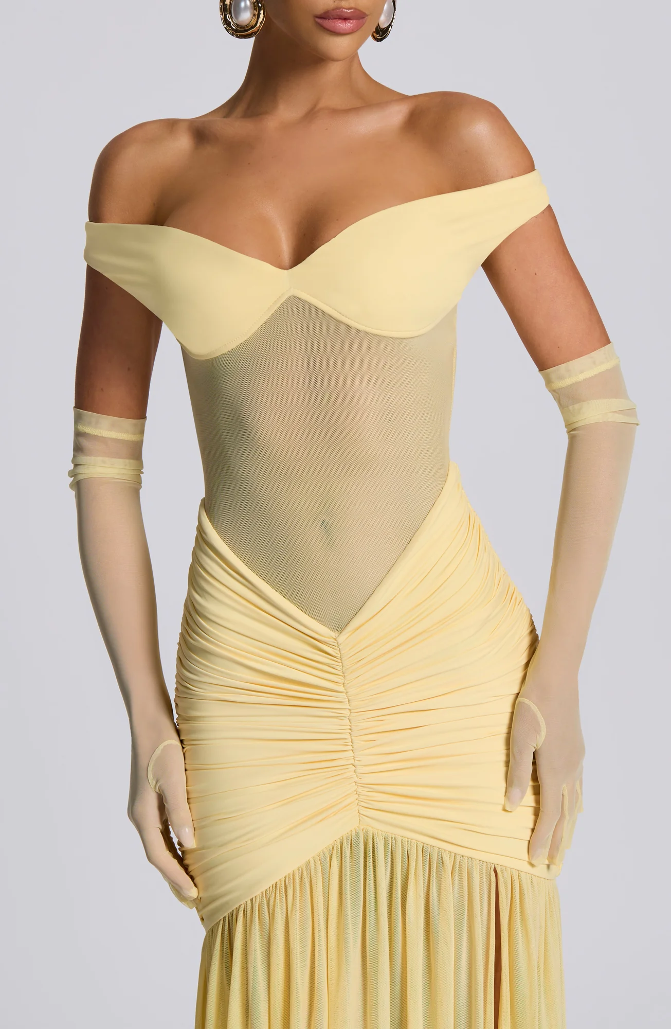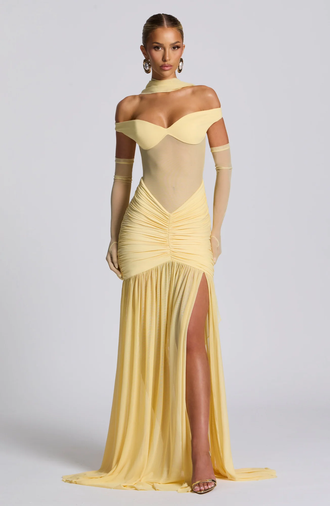 The Lemon Stretch Mesh Elbow-Length Gloves offer sophisticated allure with their above-elbow silhouette. Crafted from soft stretch mesh and elegantly unlined, these gloves add a refined touch to any ensemble. Elevate your style with this versatile accessory that pairs beautifully with various outfits. Perfect for adding a chic and elegant flair to formal occasions, parties, or summer events. Ideal for styling with dresses like the Alaia Maxi Dress and beyond. Embrace luxury and sophistication with these stunning lemon gloves. Please note that this item is non-returnable.