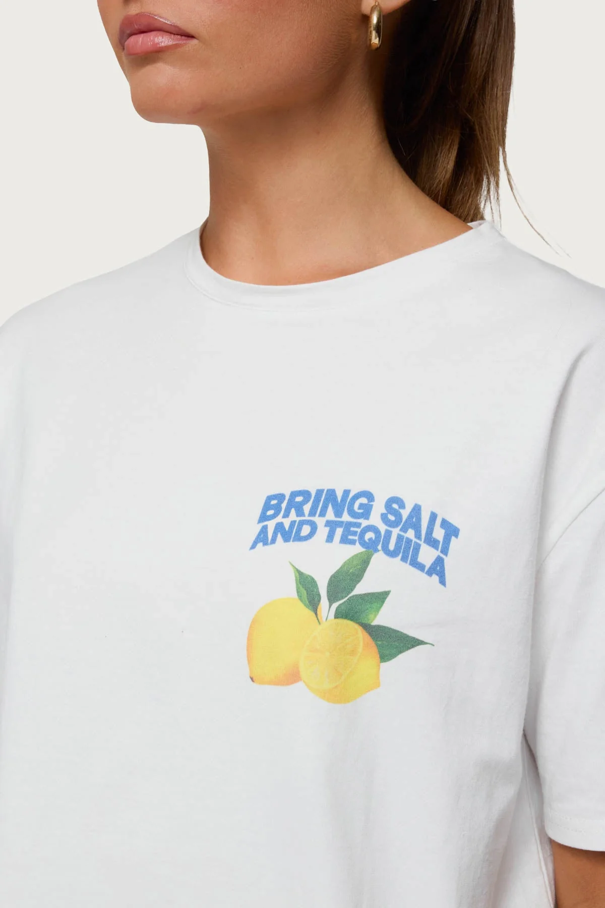 This Oversized White T-Shirt features a vibrant Lemons graphic print for a fun and trendy look. Made from 100% Cotton, it offers comfort and style. Get ready to make margaritas with a touch of humor and fashion. Machine washable for easy care. Available in sizes XS to XL.