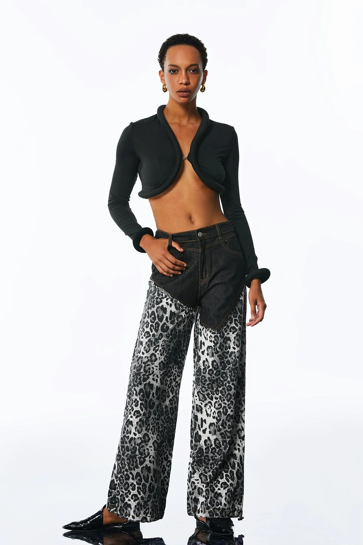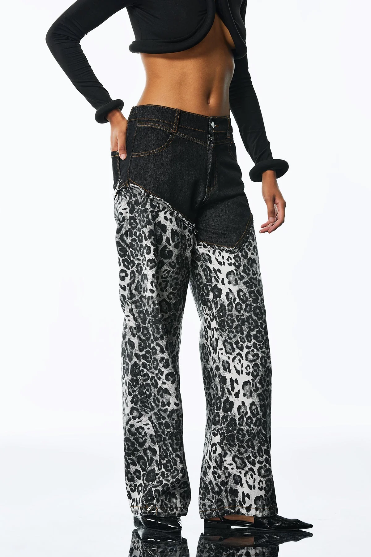 Step up your fashion game with these Leopard Print Asymmetric Black Pants . Perfect for style-conscious individuals, these edgy pants combine deconstructed elements with a classic print for a trendy yet bold look. The unique asymmetric cut ensures a stylish fit for various occasions, crafted from 50% Polyester and 50% Cotton for comfort. Make a statement in these sleek black pants that guarantee both style and comfort. Material: 50% Polyester, 50% Cotton. Stretch Factor: Non-Stretch. Care Instructions: Gentle machine wash. Please note that color may vary due to lighting during photography.