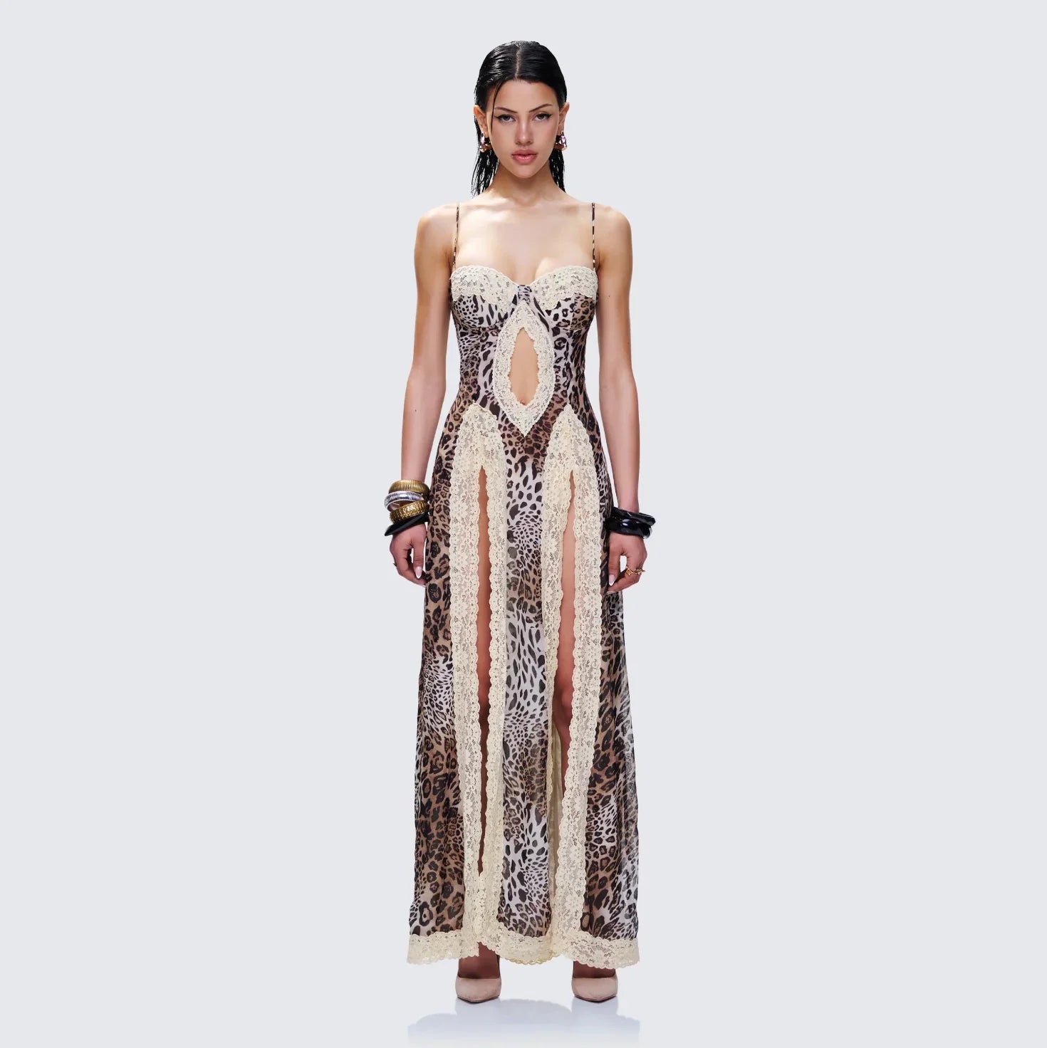 Make a bold statement with this fierce leopard print chiffon maxi dress. The fit-and-flare silhouette offers a dramatic double front slit, statement cut-outs, and delicate lace trim for a touch of elegance. Crafted from 100% polyester with a trim of cotton and nylon blend, this dress commands attention effortlessly. Embrace your wild side in style. For more styling tips and fashion inspiration, visit @mermaid_way on Instagram. Enjoy a complimentary size exchange if needed.