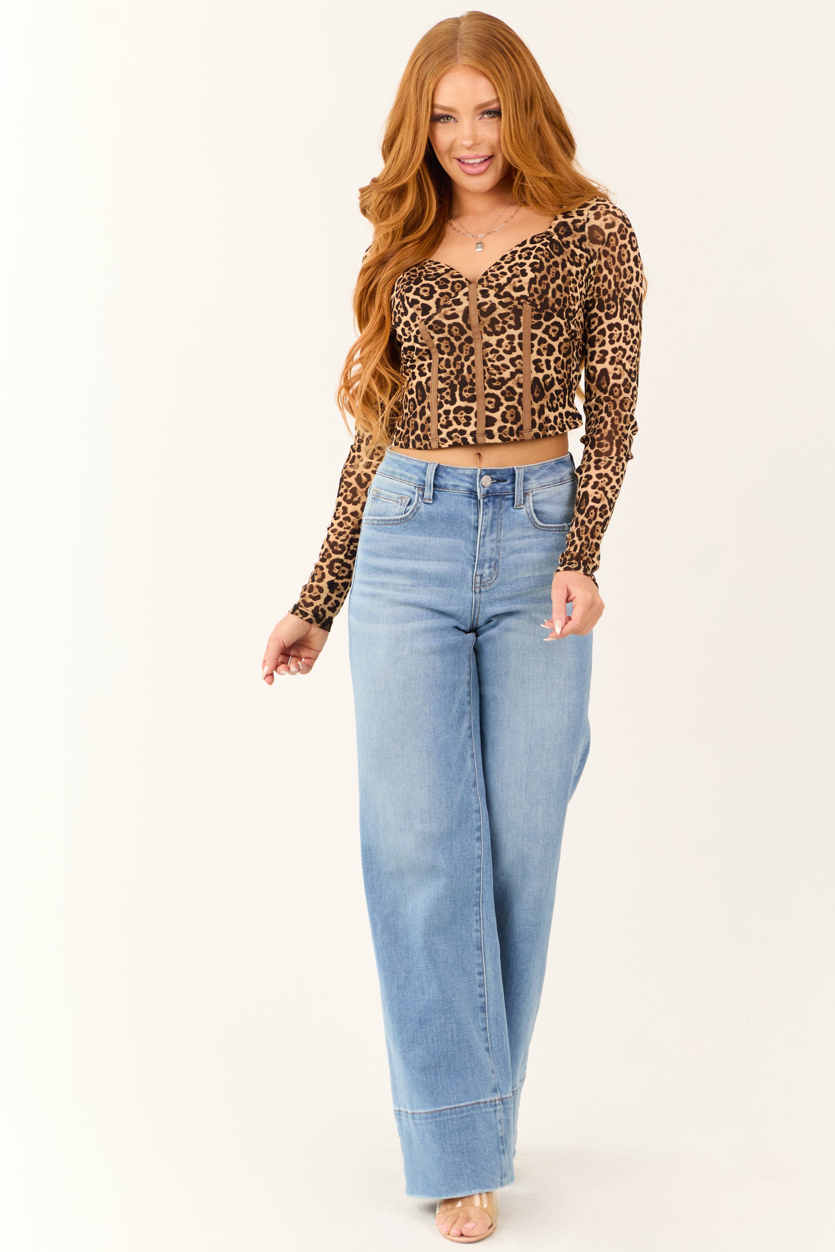 Indulge in the exotic allure of our Leopard Print Corset Crop Top in camel, cocoa, and coffee shades. This top features a sweetheart neckline, front stripe details, and a non-stretchy woven fabric for a chic and sensual look. The cropped length adds a flirtatious vibe, while the lining in cocoa tones ensures comfort and style. Care instructions: Hand wash cold separately, do not bleach, hang dry. Model is wearing a size Small. Elevate your wardrobe with this statement piece.