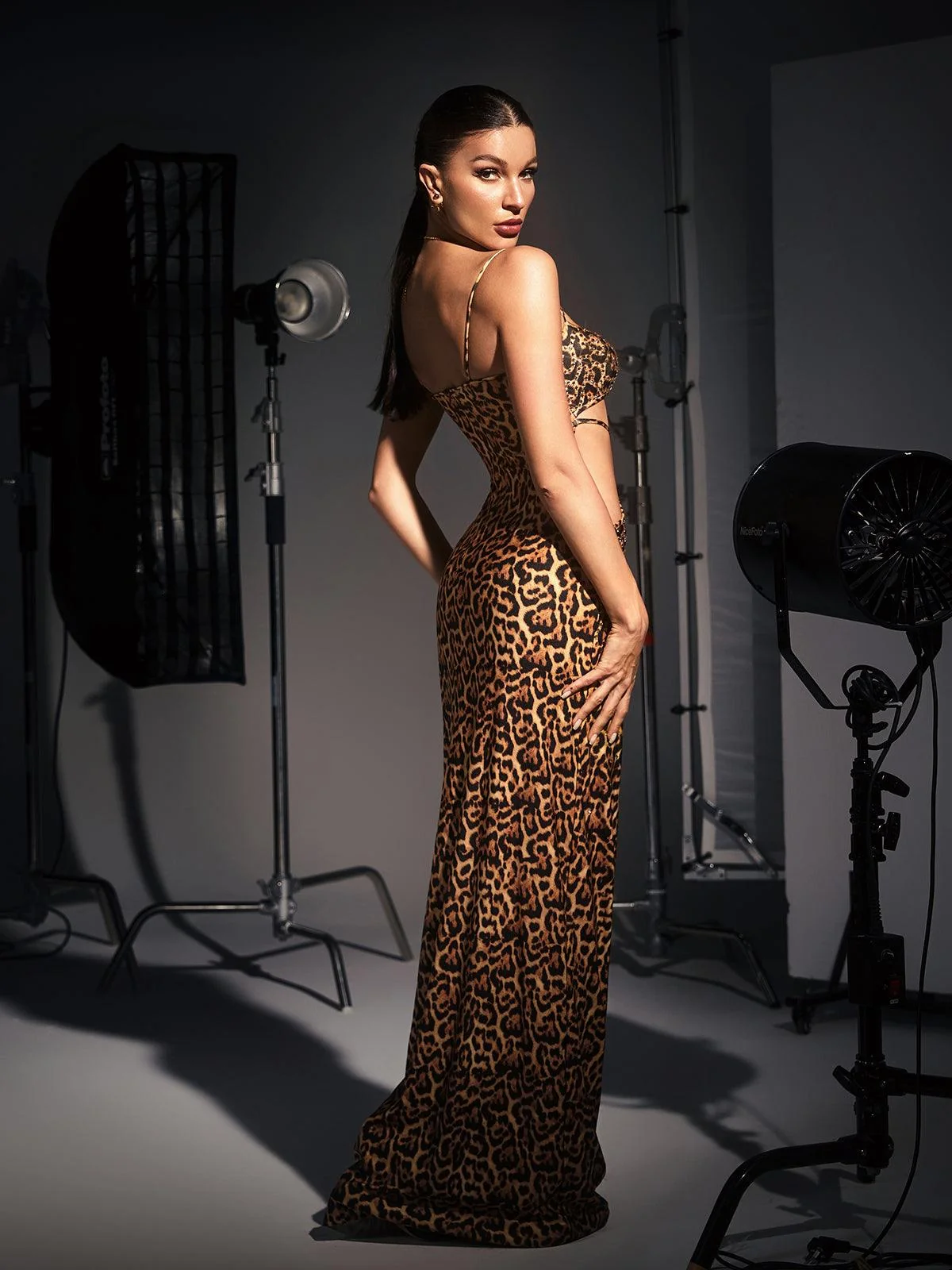 Elevate your style with our stunning Leopard Print Crystal Embellished Maxi Dress. This luxurious dress is designed with intricate crystal embellishments, adding a touch of glamour to your look. Made from 100% Polyester, this dress features an invisible zipper at the back. Whether youre attending a party or heading off on vacation, youll exude confidence and beauty in this exquisite piece. Please note, color may vary slightly due to lighting. For best care, hand wash cold. Model is shown wearing size S. Available in XS, S, M, L, and XL sizes.