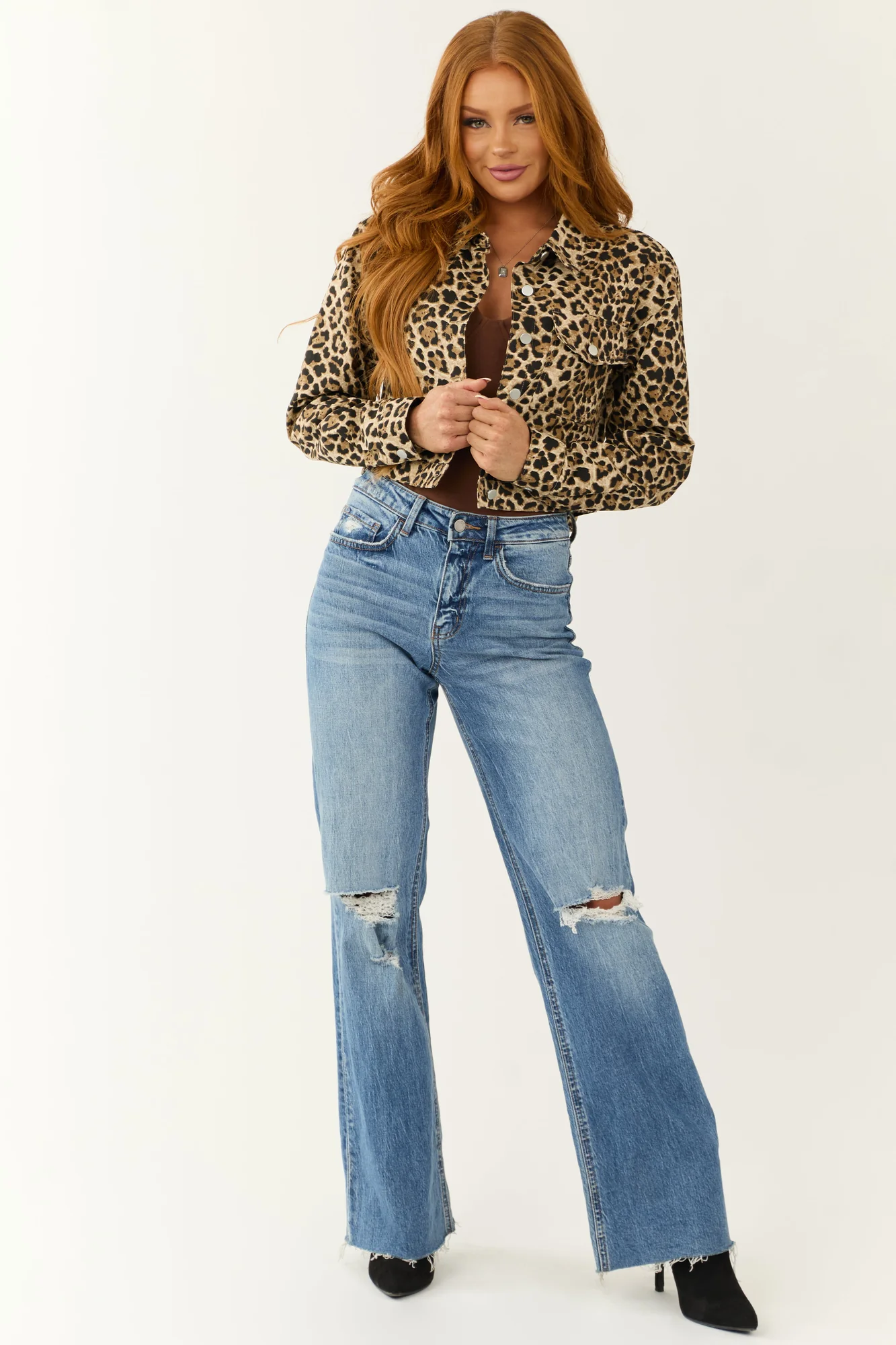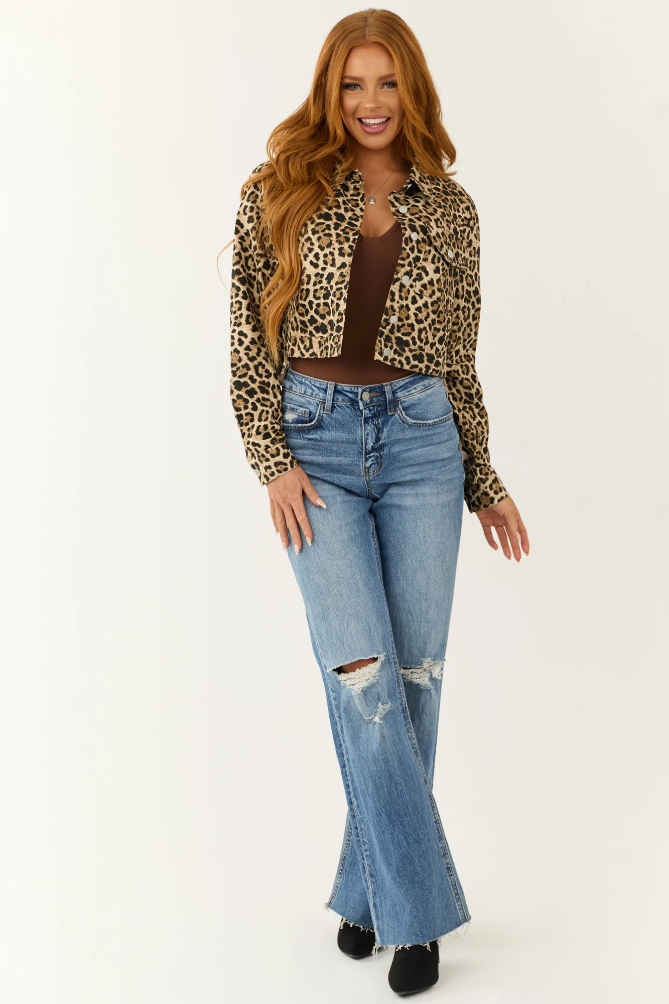 Indulge in timeless style with our Leopard Print Denim Cropped Jacket in Camel Brown. Crafted from 100% Cotton, this jacket features Long Sleeves, a Collared neckline, and a flattering Button-Down front. The Leopard print in shades of Camel, Peanut, and Black adds a playful edge to your outfit. Perfect for daytime wear, this jacket can be styled effortlessly for a chic Fall or Winter look. Pair it with your favorite jeans for a casual yet fashionable ensemble that is sure to turn heads. Note: Hand wash cold, do not bleach, line dry, iron low.
