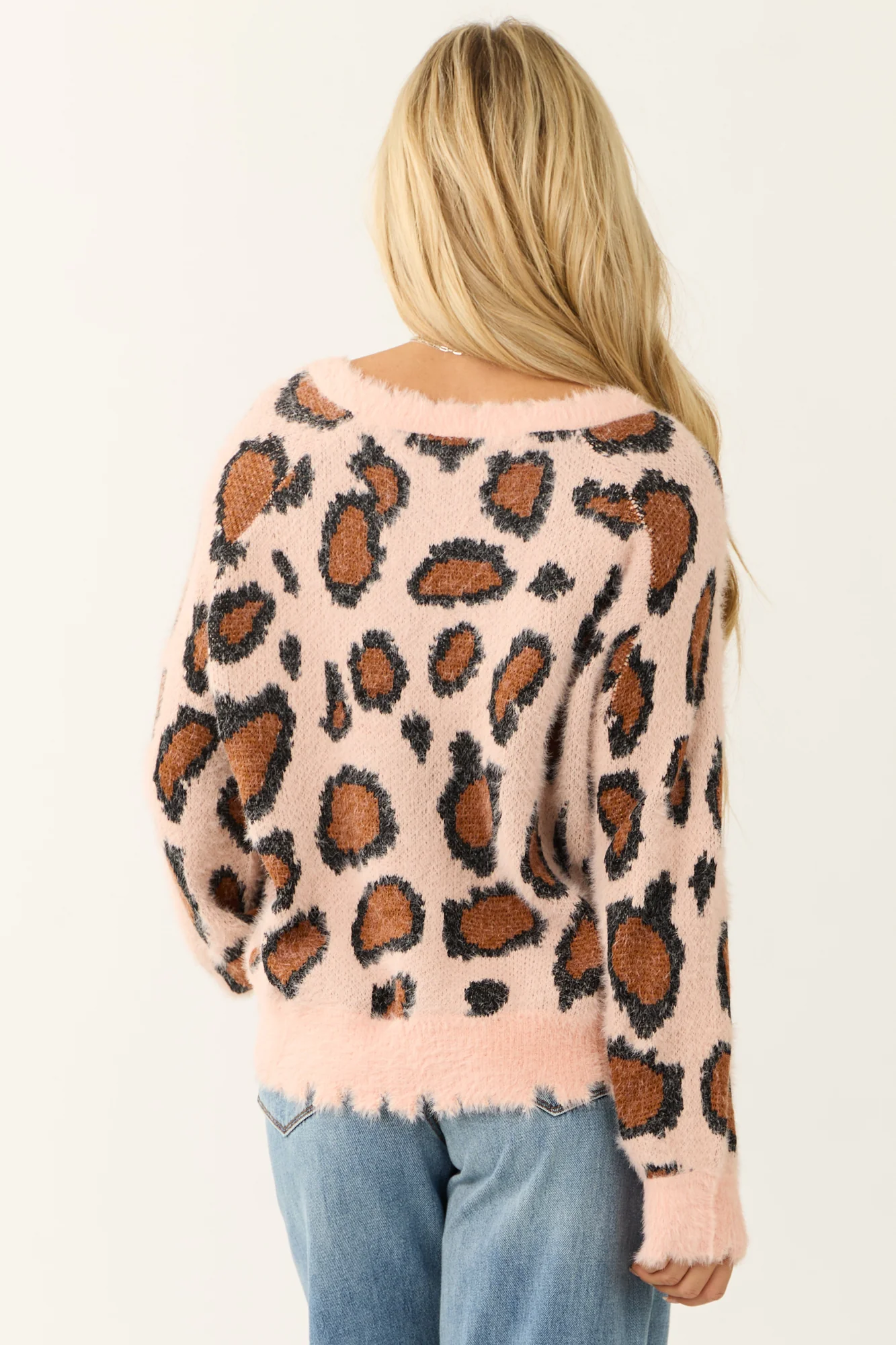 Indulge in style and comfort with our Leopard Print Fuzzy Sweater in Blush, Cognac, and Black. This stretchy ribbed knit sweater features a trendy leopard print, long sleeves, and distressed banded trim for a chic look. Crafted from 60% Nylon and 40% Acrylic, this sweater offers both warmth and a touch of luxury. Ideal for casual outings or cozy nights in, this imported sweater adds a touch of wild to your wardrobe. Care instructions: Dry clean only to prevent color bleeding. Embrace uniqueness, as slight variations in print placement may occur. Model is wearing a size Small.