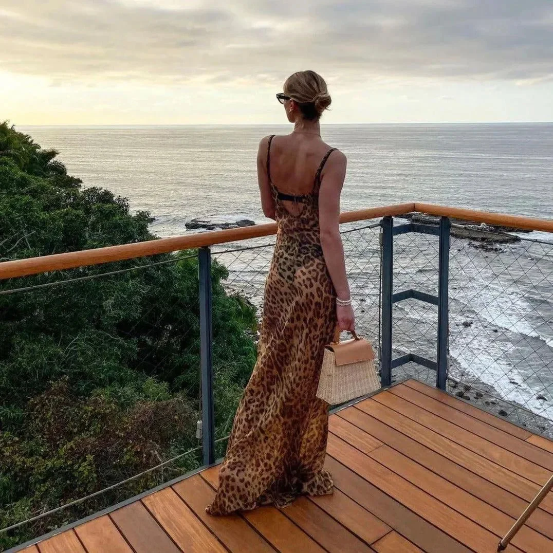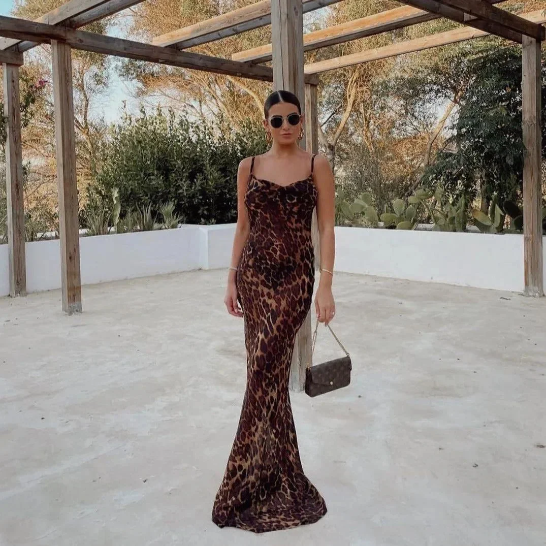 Elevate your wardrobe with this elegant leopard print Maxi Dress which features a sophisticated high split design. Made from high-quality chiffon, polyester, and spandex, this dress drapes beautifully to enhance your silhouette and offers a comfortable, tailored fit with adjustable straps. Perfect for special occasions or evenings out, this dress promises a stylish impression. Pair with sleek heels for added glamour and confidence. Explore endless fashion possibilities with this timeless piece .