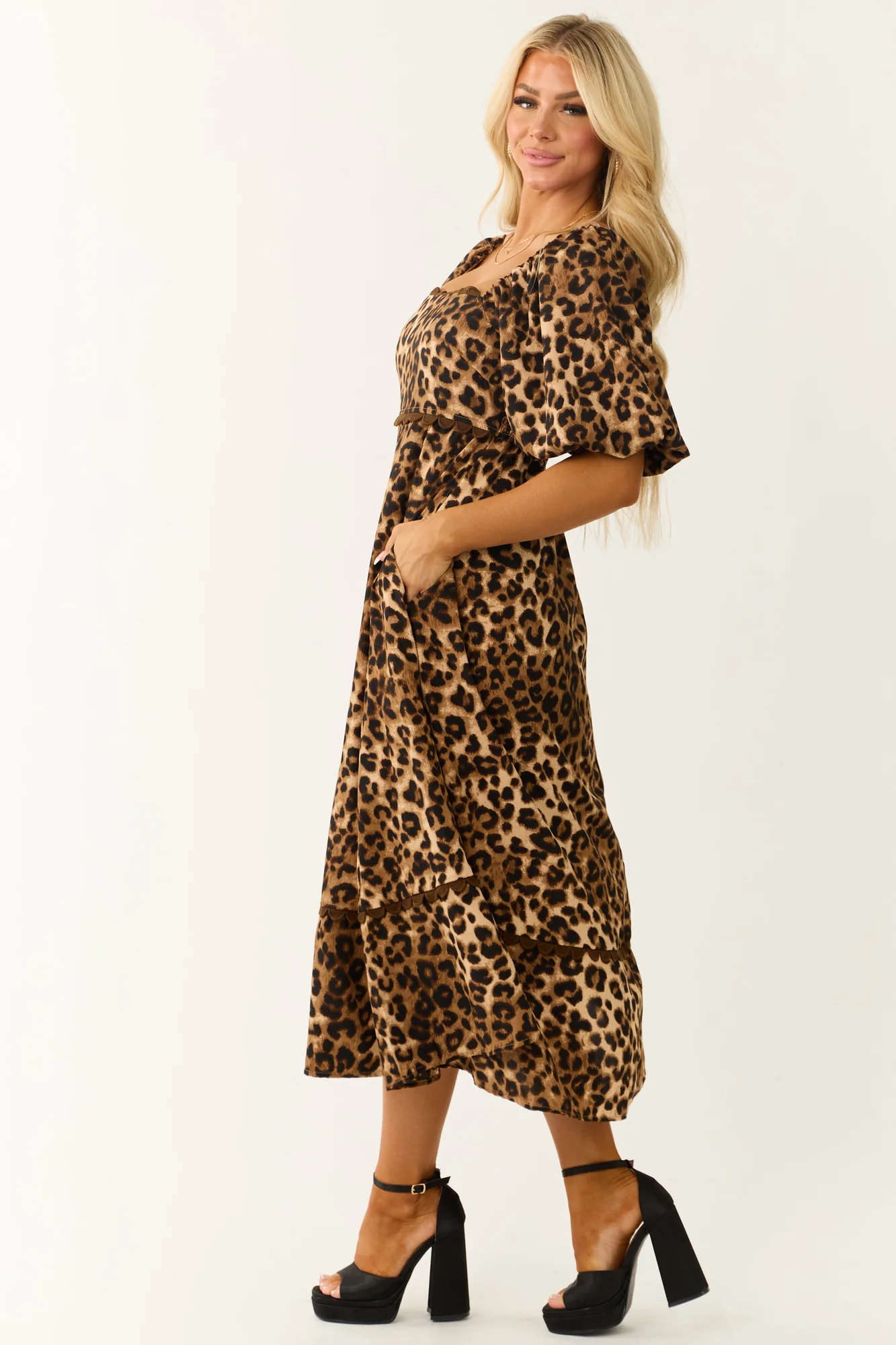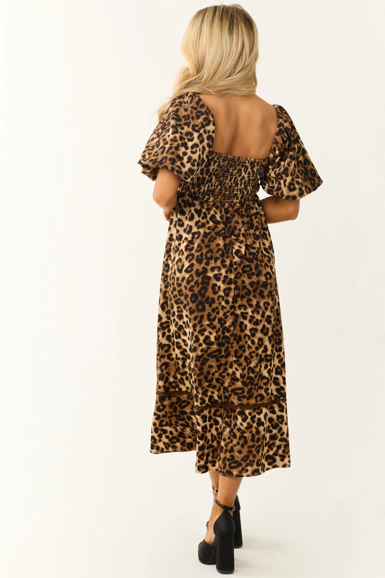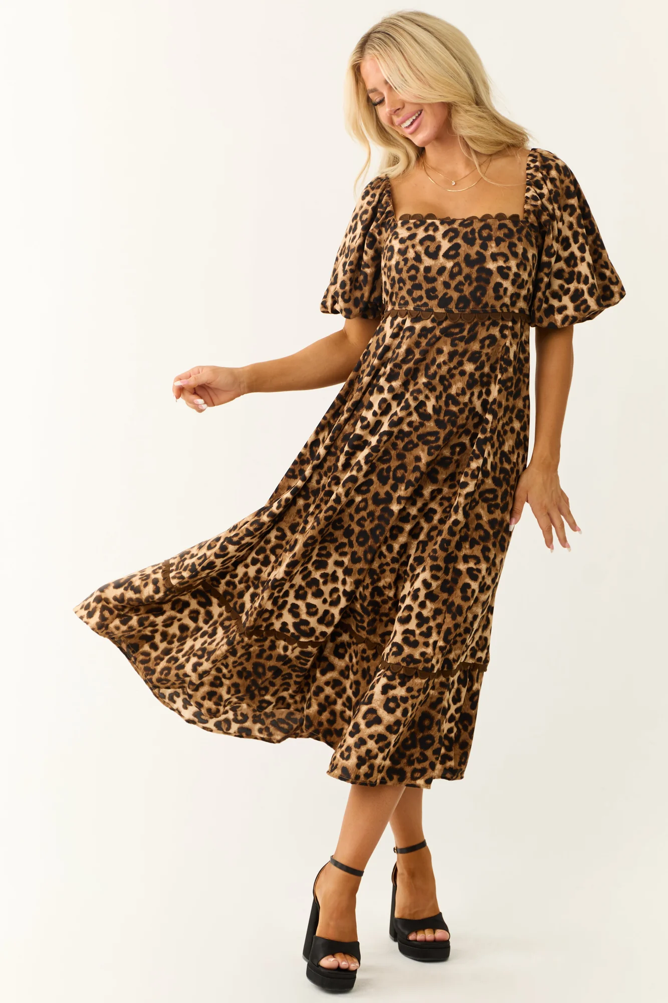 Elevate your style with our Leopard Print Puff Sleeve Midi Dress in shades of Camel, Black, Peanut, and Sepia. This babydoll-fit dress features short sleeves, smocked back, and scalloped trim details for a chic look. Crafted from 100% Polyester with a non-stretchy woven texture. Perfect for a date night or evening out. Hand wash cold separately to maintain color vibrancy. Available in sizes S, M, and L.