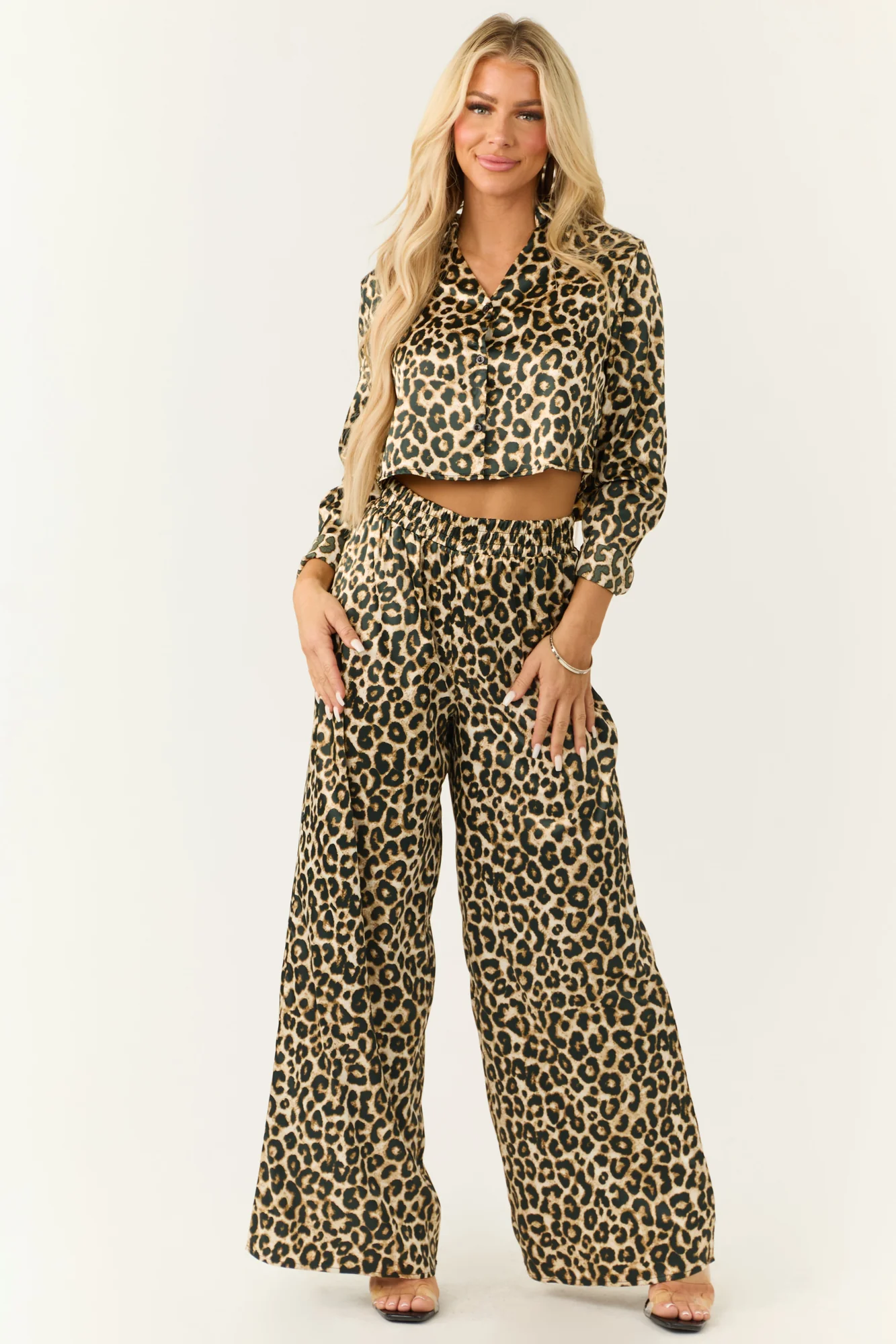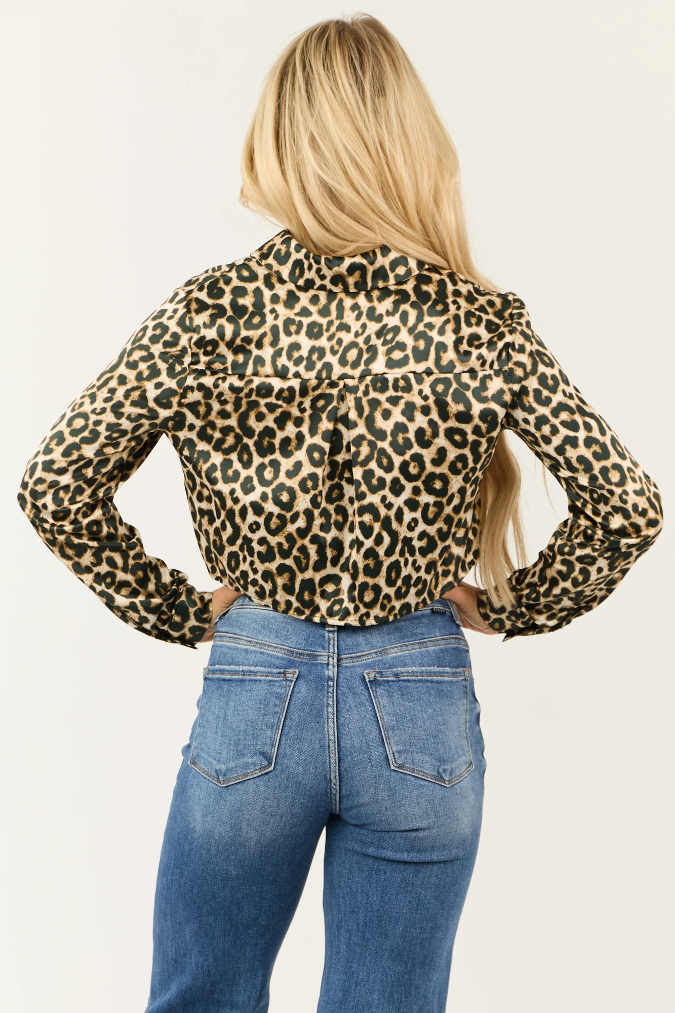 Embrace wild elegance with our Leopard Print Satin Long Sleeve Crop Top in Camel. Designed with a charming print in shades of Camel, Black, and Coconut, this non-stretchy woven satin top features a collared button-down style with banded button cuffs. Made of 97% Polyester and 3% Spandex, it offers a versatile addition to your wardrobe suitable for various occasions. Pair it perfectly with our matching Wide Leg Pants for a complete look. Please note that each piece may vary slightly due to the unique cutting and sewing process, ensuring a one-of-a-kind garment every time. Hand wash cold, dry flat, and use a low-iron setting to maintain its quality. Model is wearing a size Small. Model’s Profile: Size 1, Height 57″, Bust 34″, Waist 26″.