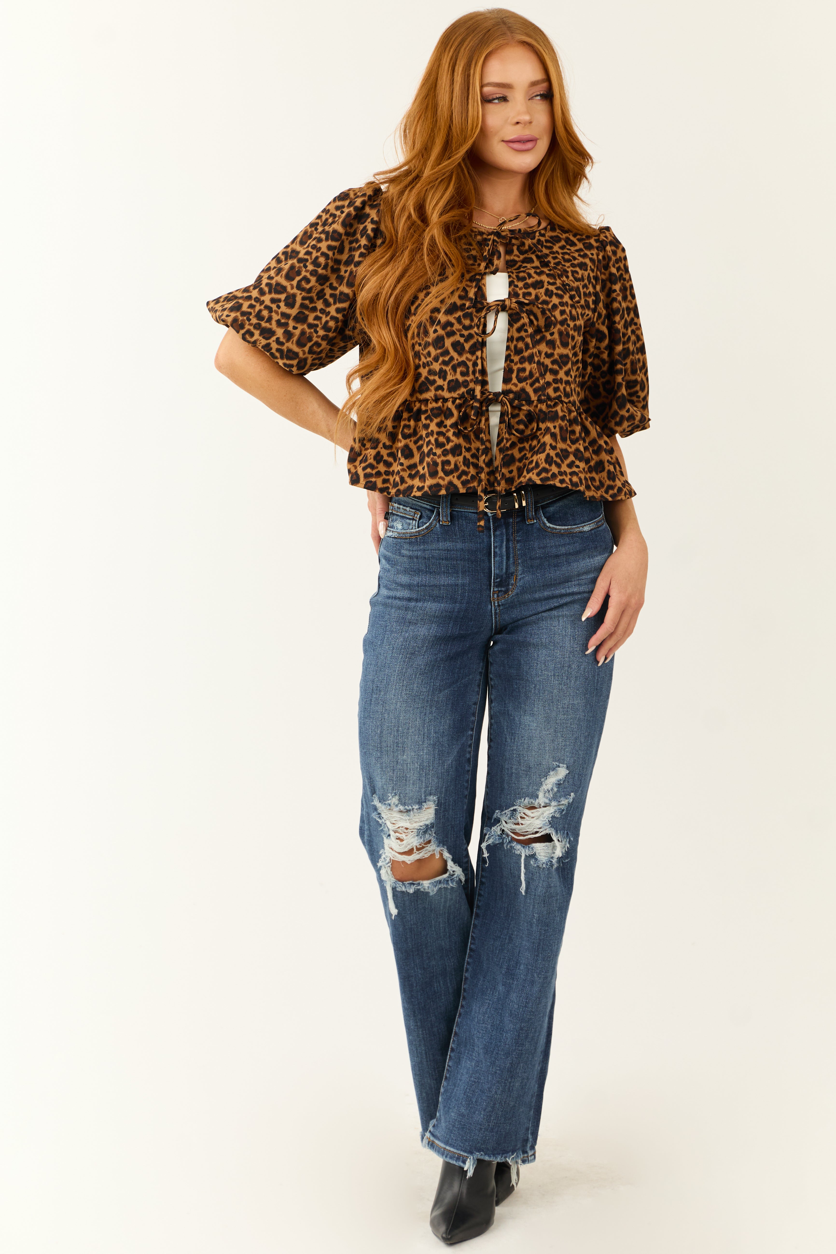 Indulge in the luxurious Leopard Print Tie Front Top in rich Brown Sugar, Cocoa, and Black shades. This textured woven top features a round neckline, half puff sleeves, and a charming ruffle hem. Expertly crafted from 98% Polyester and 2% Spandex, with lining made of 97% Polyester and 3% Spandex. Look effortlessly chic in this must-have piece, perfect for any occasion. Hand wash cold for best care. Model is wearing a size Small. Size guide: S (Sleeve 13″, Length 20″, Bust 38″), M (Sleeve 13.5″, Length 20.5″, Bust 40″), L (Sleeve 14″, Length 21″, Bust 42″).