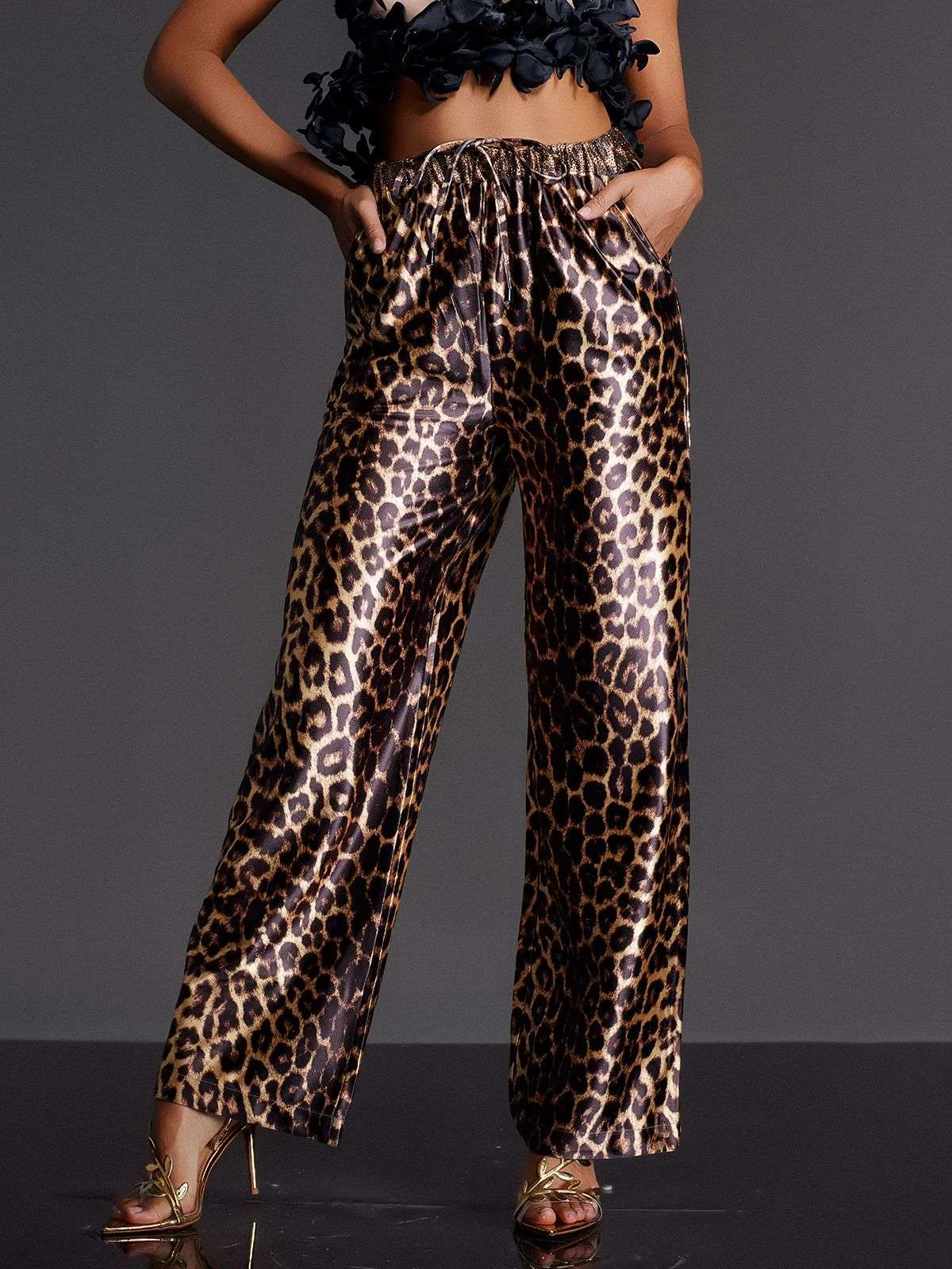 Elevate your wardrobe with these Leopard Satin Pants in Brown by Wang Kuan. The bold leopard print and sleek satin fabric add a touch of sophistication to your look, whether its a night out or a casual day. Made of 100% Polyester with a slight stretch for comfort. Dry clean only. Please note: Color may vary due to lighting. Available in sizes S, M, and L. Become a trendsetter with these stylish pants!