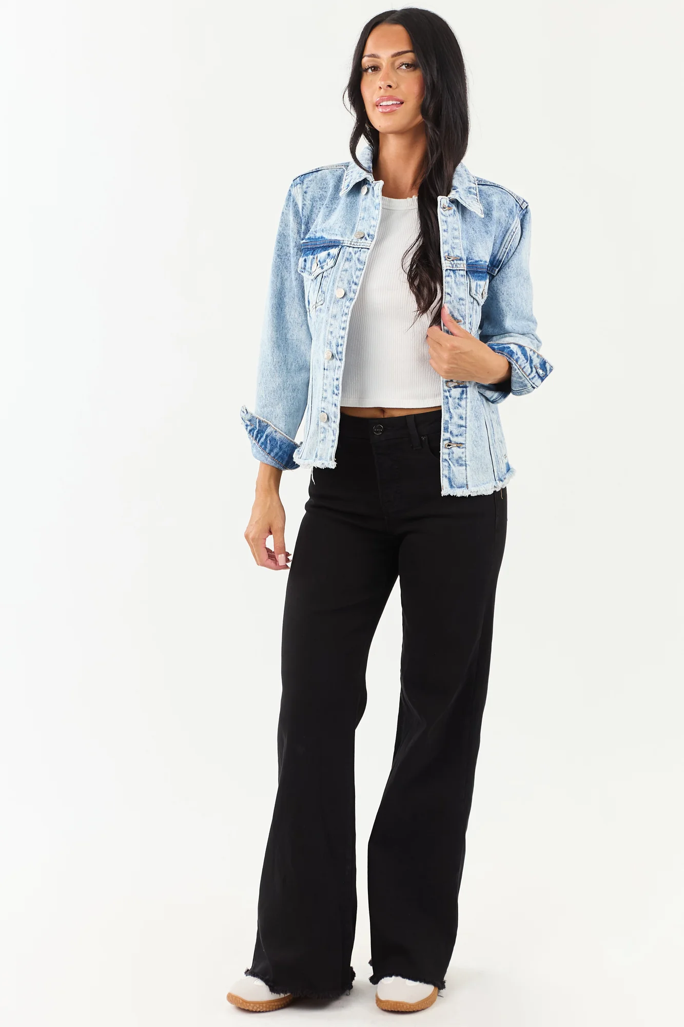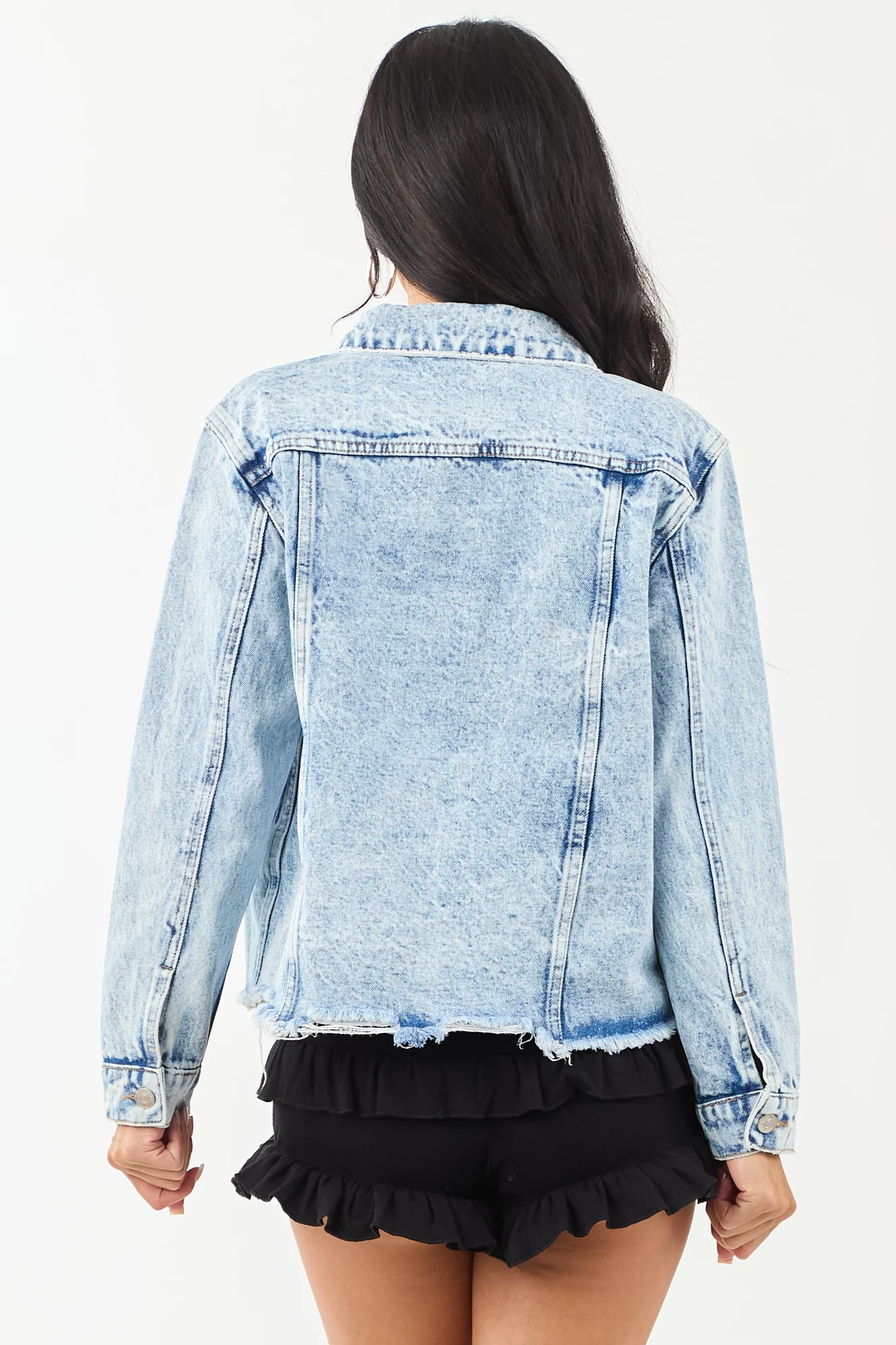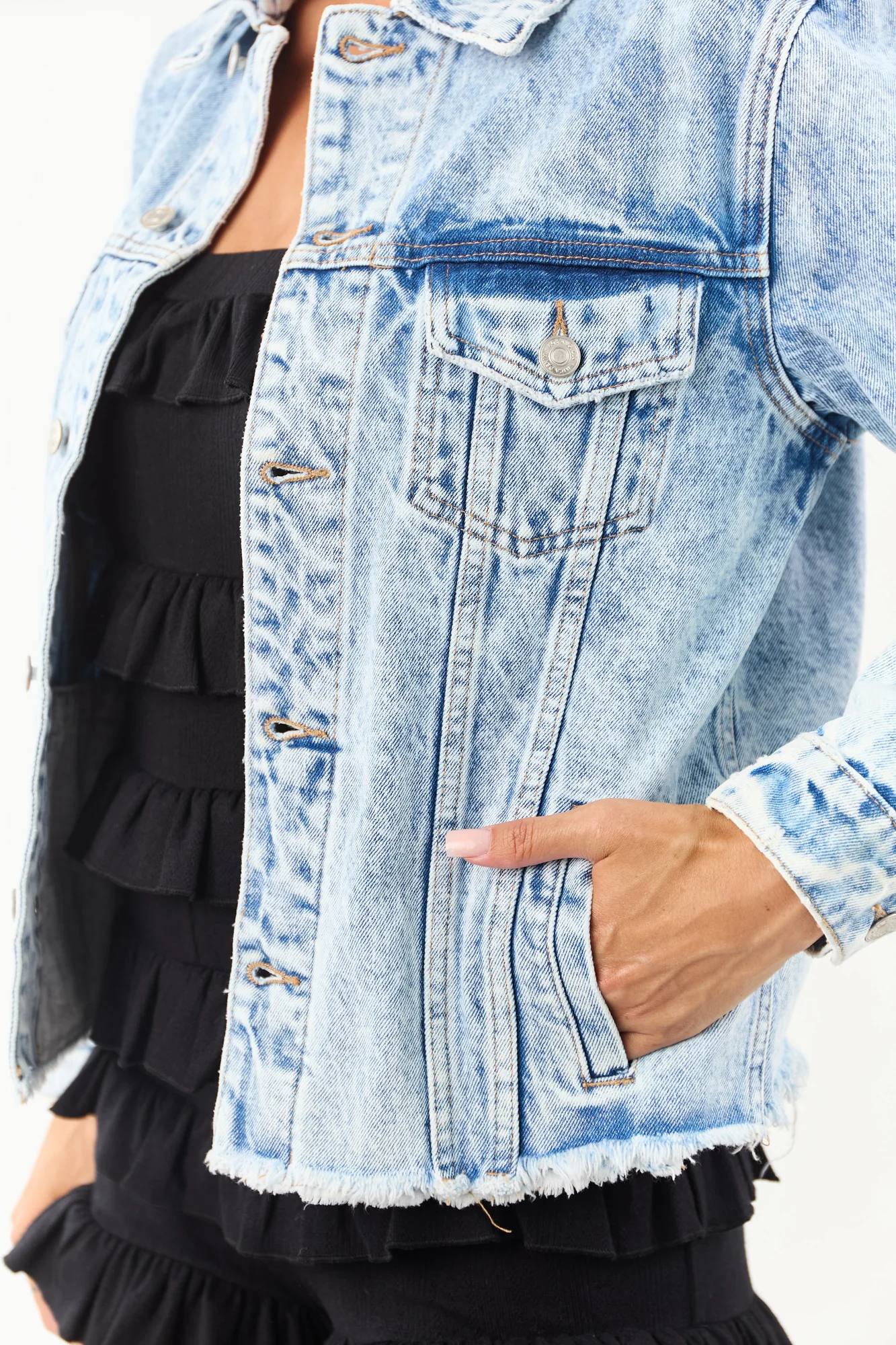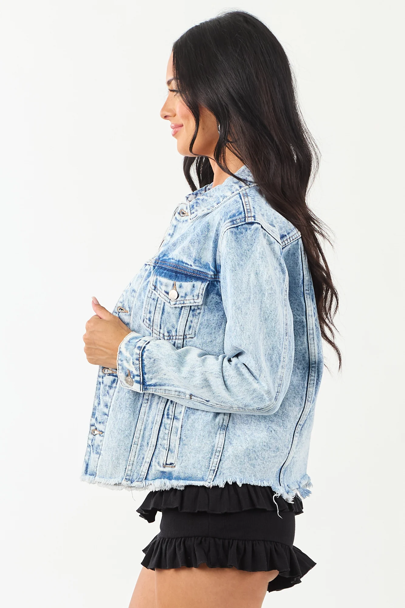 Embrace retro style with our Light Acid Wash Denim Button Down Jacket. Crafted from 100% cotton, this non-stretchy denim jacket features a raw distressed hem, banded button cuffs, and 4 pockets for a chic yet functional look. The collared neckline adds a classic touch, making it perfect for any casual outing. Feel effortlessly cool and stylish with this lived-in design. Available in sizes S, M, and L. Bust: 38-42. Length: 23-24. Sleeve Length: 22-24. Imported.