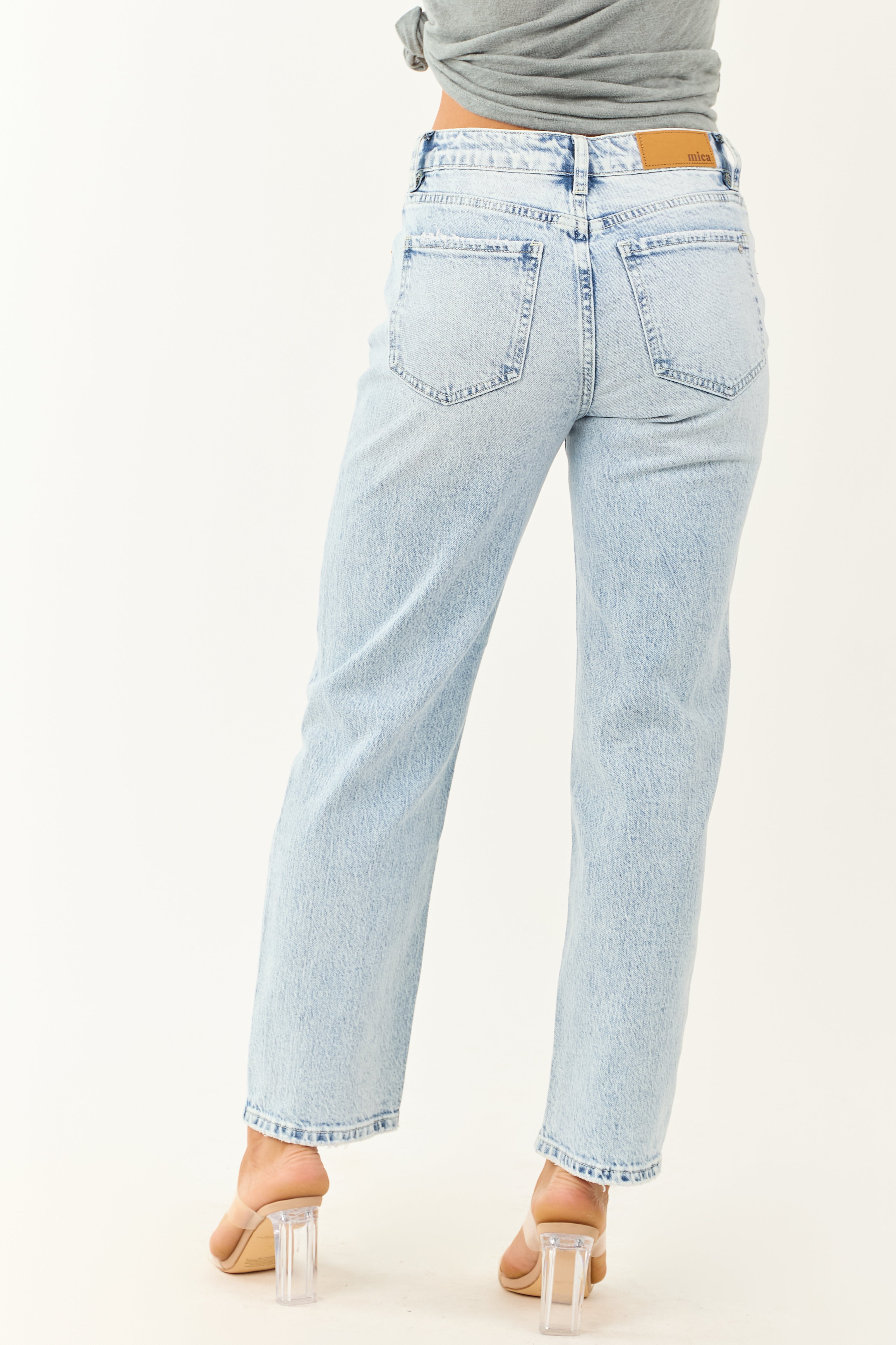 Step back in time with these light acid wash high rise straight leg jeans. Crafted from semi-stretchy denim with distressed knees and light distressing throughout, these ankle-length jeans feature 5 functional pockets, belt loops, and a zipper fly with button closure. Pair them with sneakers, boots, or a vintage tee for a retro vibe. Available in waist sizes 24 to 32 with a 28″ inseam. Imported. Model is wearing size 26.