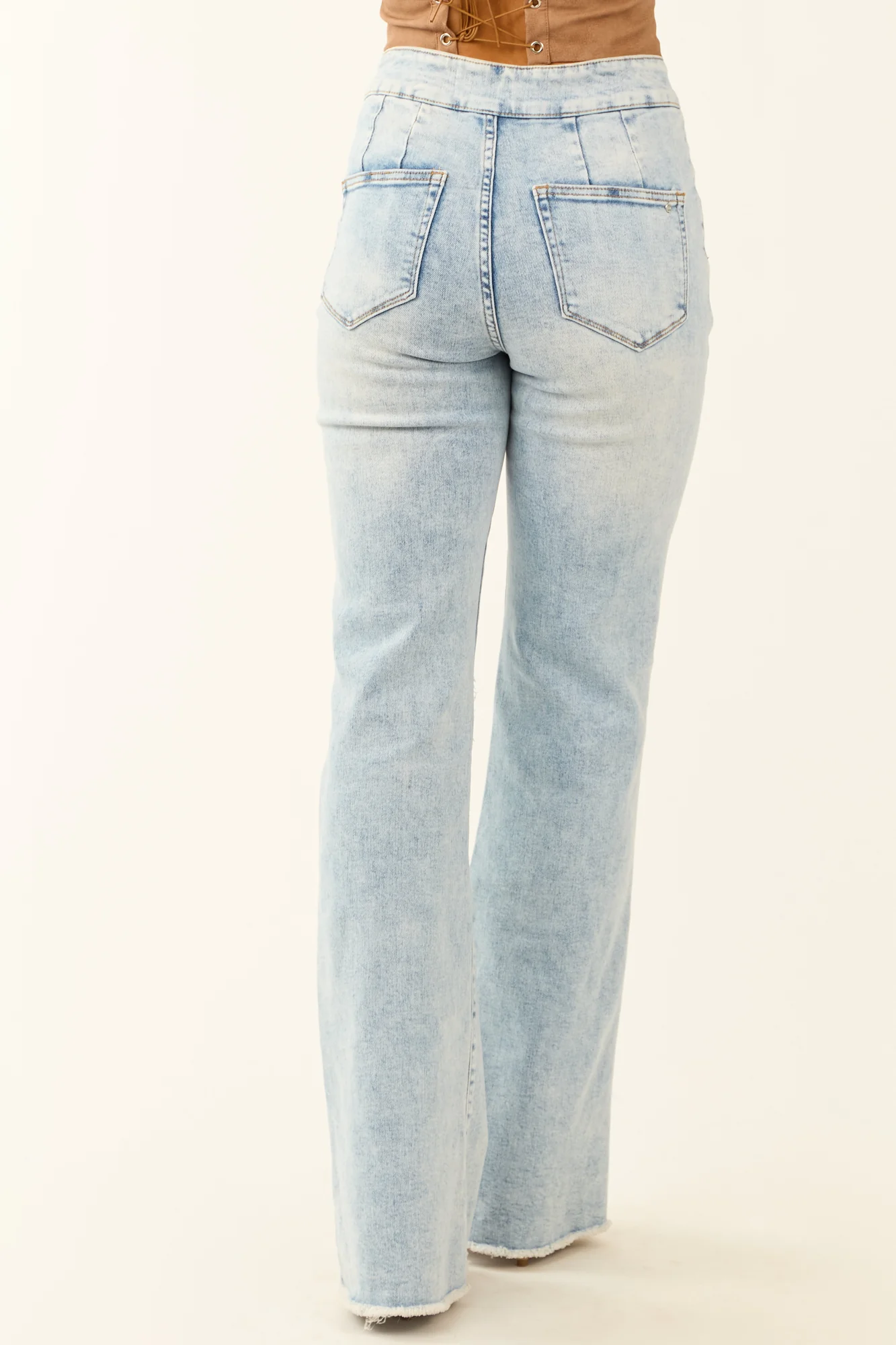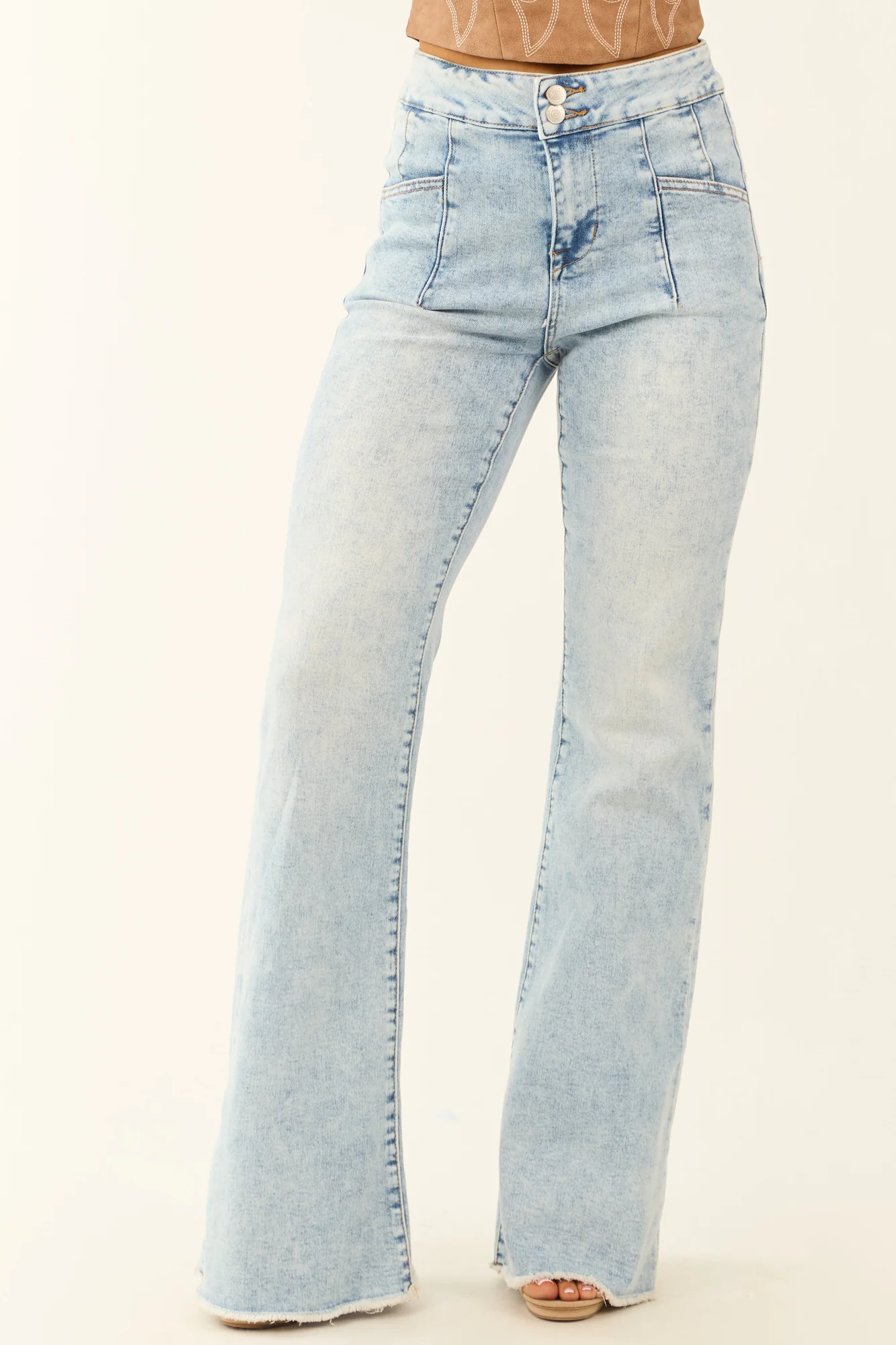 Upgrade your denim collection with these Light Acid Wash Stretchy Flare Jeans for women.The super high rise and relaxed flare style offer a flattering fit. Featuring diagonal side pockets, back pockets, and a frayed hemp for added style. Made with a stretchy blend of 92.5% Cotton, 5.5% Polyester, and 2% Spandex. Pair them with a Light Cognac Faux Leather Western Corset Top for a trendy look. These tall length jeans have a waistband that runs large, so we recommend sizing down. Feel bold and stylish in these imported jeans with incredible details.