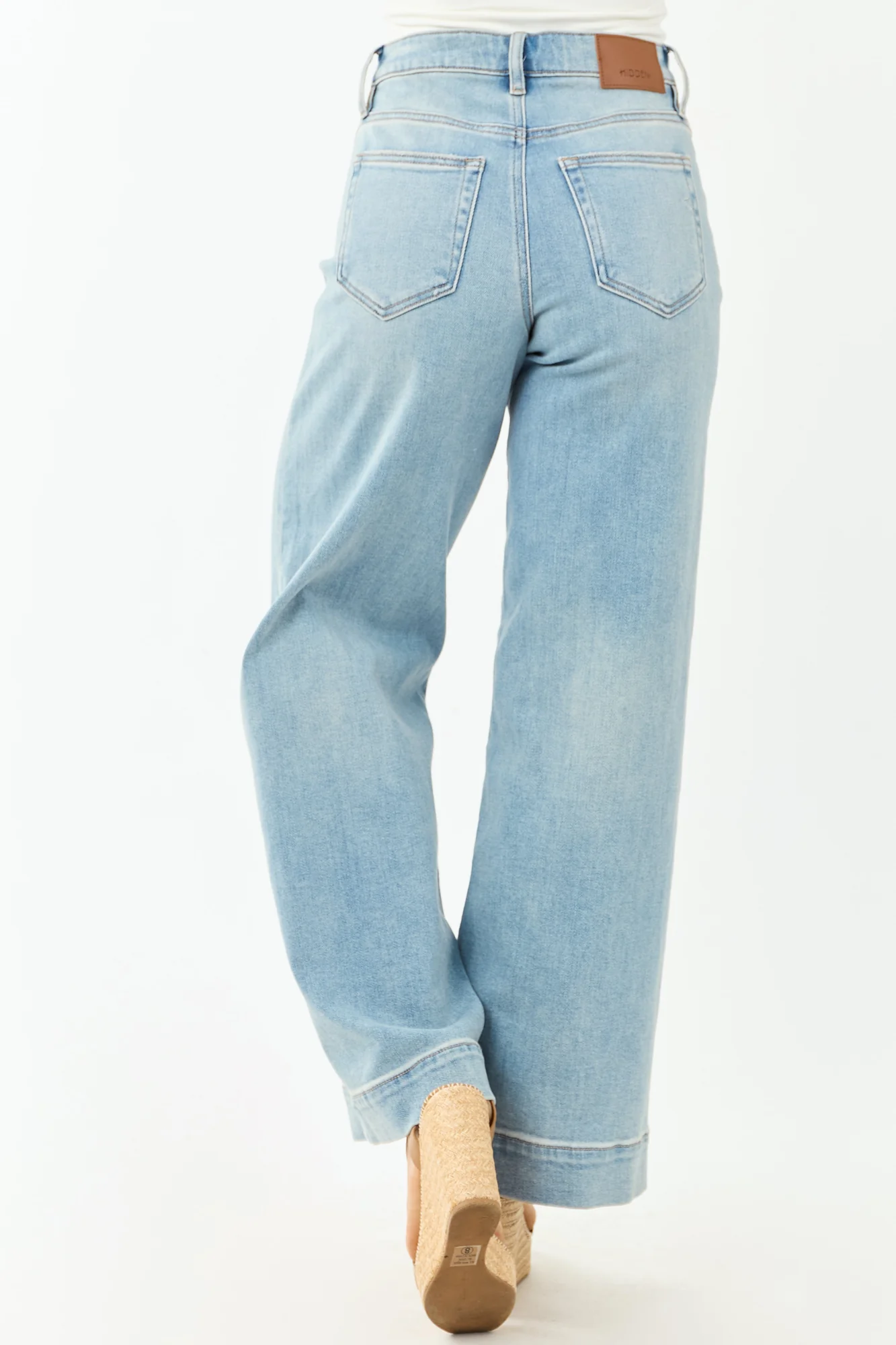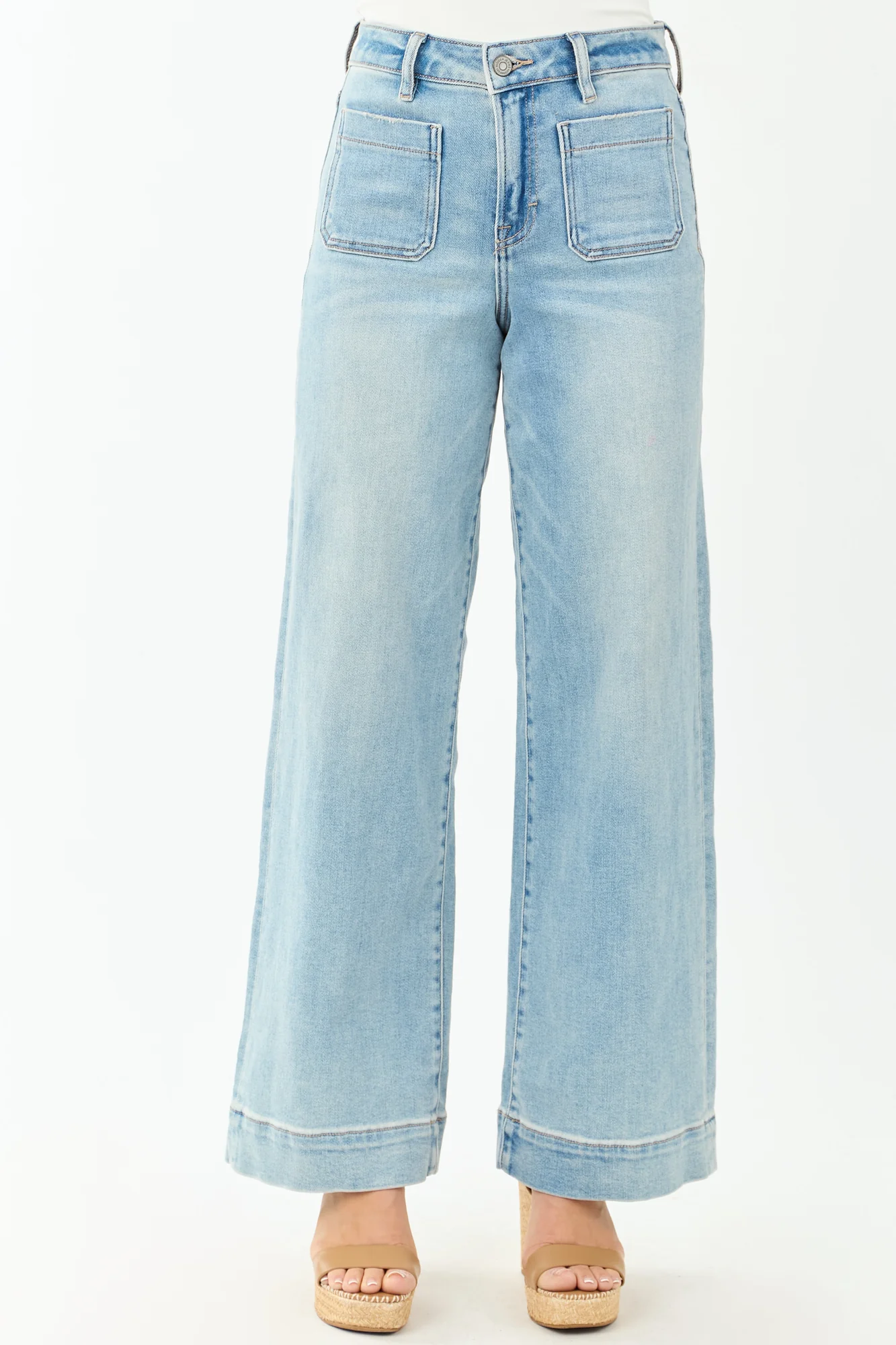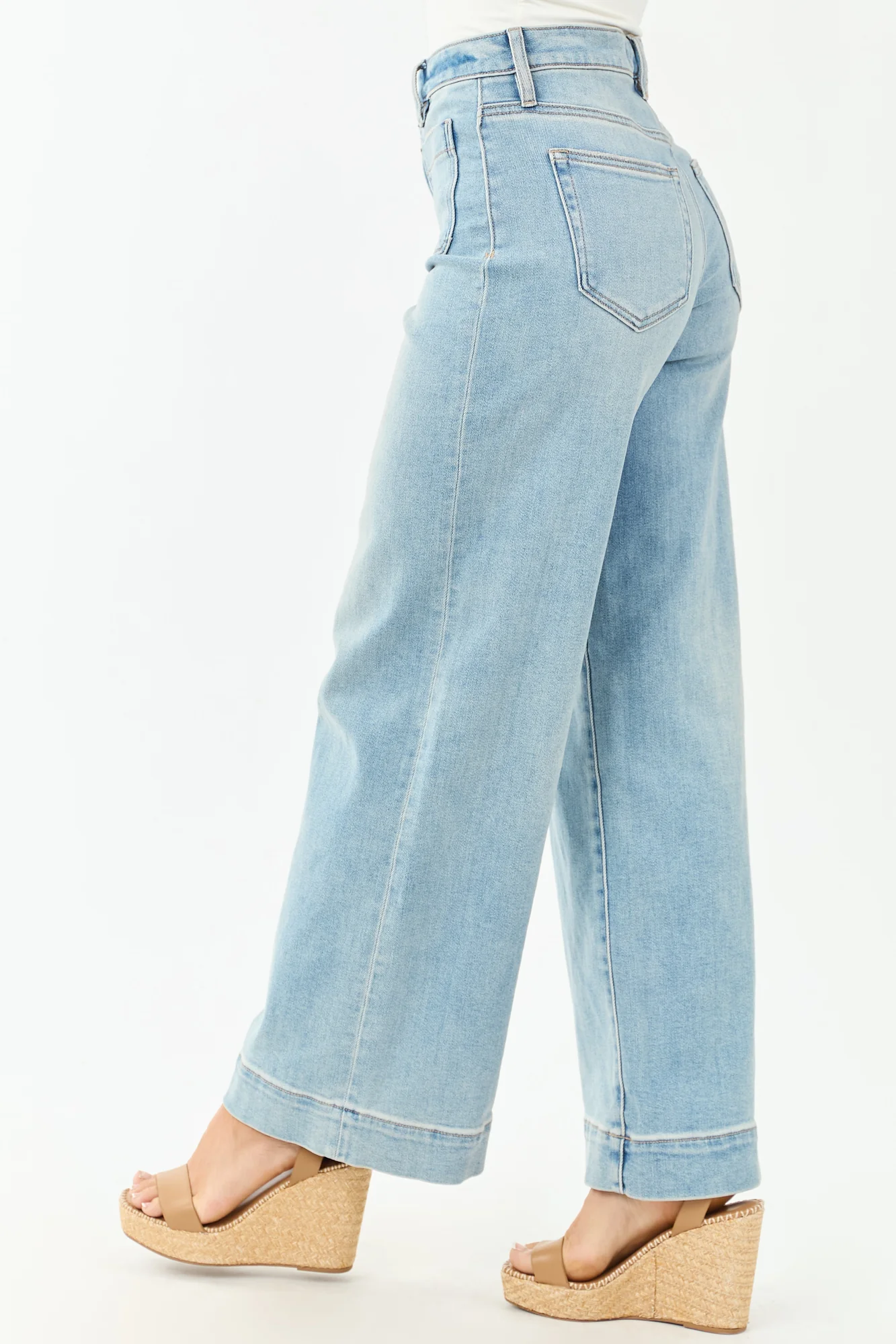 Experience ultimate comfort and style with our high-quality stretch denim jeans featuring an ultra-high rise design. These premium jeans have very light pocket distressing, belt loops, zipper fly with button closure, back pockets, banded hem, and a flattering fit. The fabric composition of 93% Cotton, 5% Polyester, and 2% Spandex provides the perfect blend of stretchiness and durability. Available in sizes 24 to 31, true to size in hips, with a stretchy waistband for an extra 1-2 inches. Update your wardrobe with these must-have wide leg jeans that offer both sophistication and ease. Model is wearing size 25 – Height: 57″, Bust: 34″, Waist: 26″.