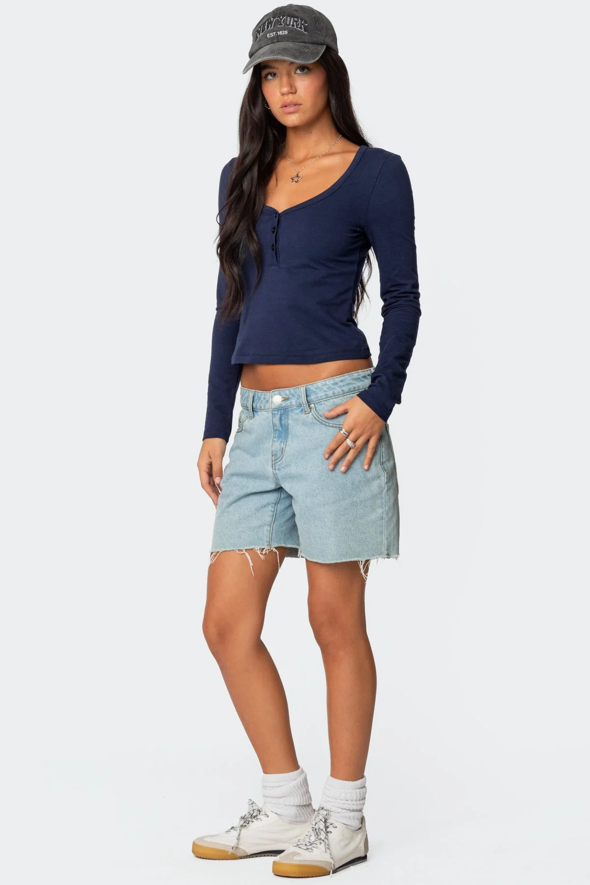 Discover the perfect blend of style and comfort with our light blue low rise denim shorts. Crafted from 100% cotton denim fabric, these shorts feature a flattering low-rise waist for a trendy look. Ideal for various occasions, the model showcases the size S inseam of 5.9 inches. With easy care instructions including machine wash at maximum of 30ºC, these shorts are essential for your wardrobe. Elevate your casual ensemble with these chic denim shorts!