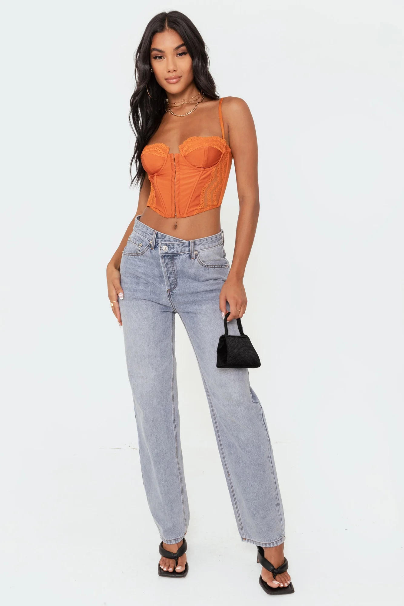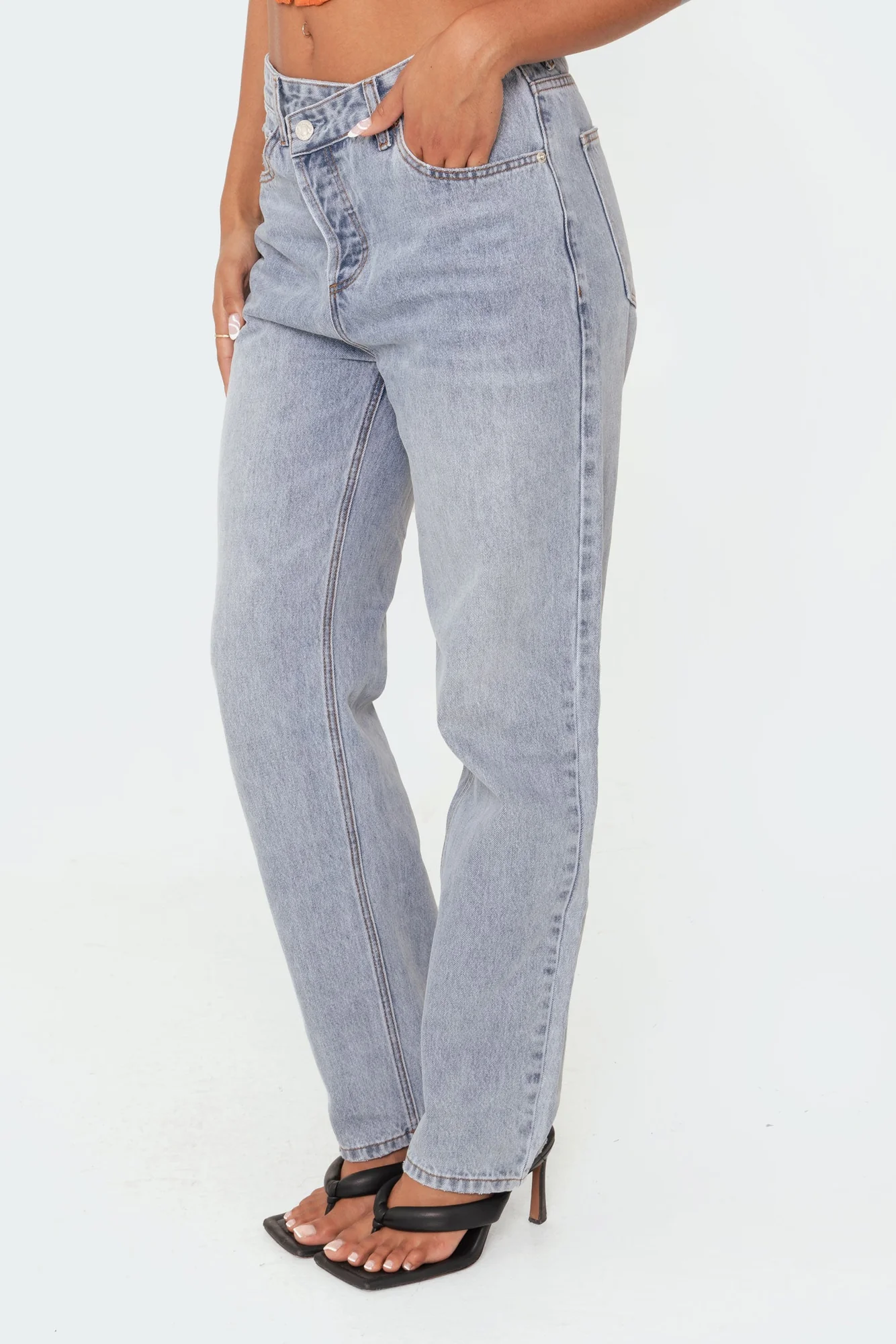 This pair of light blue boyfriend jeans is made from 100% cotton, offering a relaxed fit for ultimate comfort. Featuring a trendy crossover button detail, these jeans are perfect for casual outings or everyday wear. The model wears size S and stands at 57″ tall. Care instructions: Machine wash with similar colors.