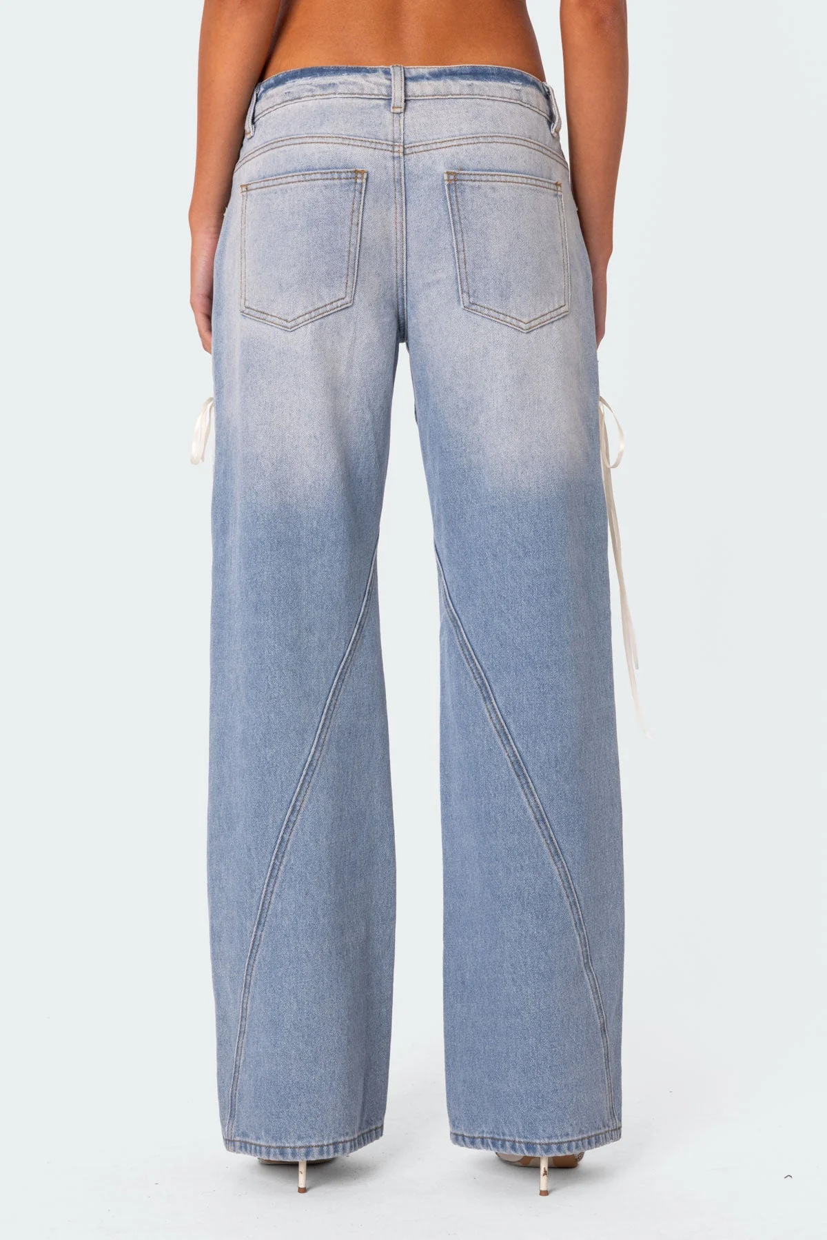 These light blue jeans feature a low rise waist and straight fit design, adorned with stylish ribbon lace-up detailing for a fashion-forward look. Made from high-quality denim fabric crafted from 100% cotton, these jeans offer both style and comfort. Available in sizes XS, S, M, L, and XL. Model wears size S; Model height is 58. Care instructions: Machine wash with similar colors.