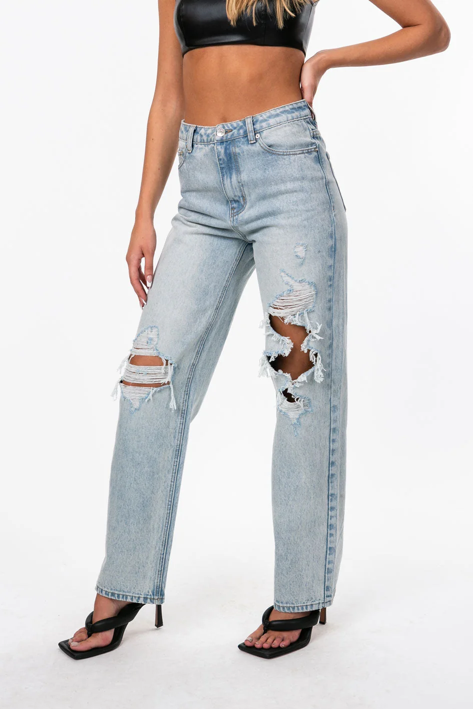 Discover your new go-to denim with these light blue wide-leg ripped jeans made of 100% cotton. The high-rise fit and distressed rip detailing add a touch of edge to your wardrobe. Available in sizes XS to XL. Model height is 57. Care instructions: machine wash with similar colors.