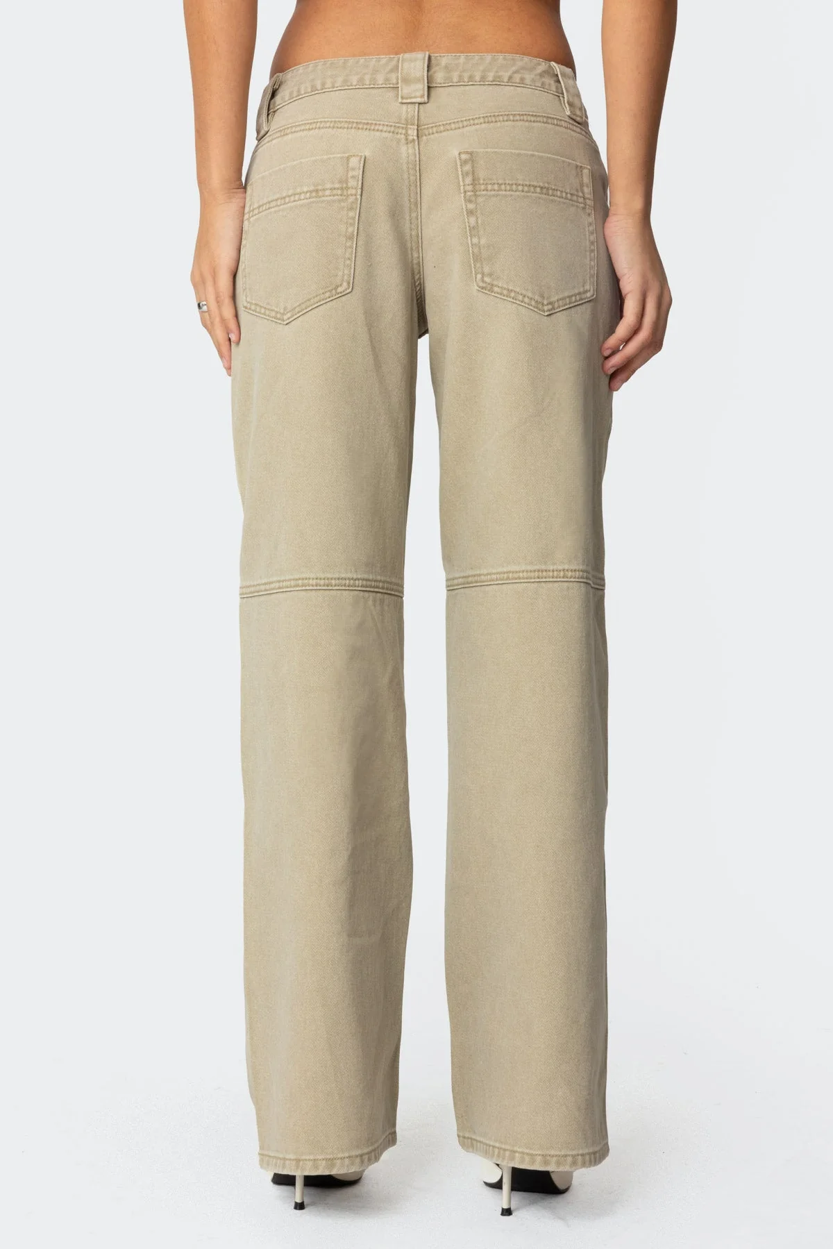 Discover casual elegance with our light brown wide leg carpenter jeans. Crafted from denim fabric that offers superior comfort and style, these jeans feature a low-rise waist and panel detailing for a fashionable touch. Made of 100% cotton for a soft feel against your skin. Available in sizes XS, S, M, L, and XL. Machine washable for easy care.