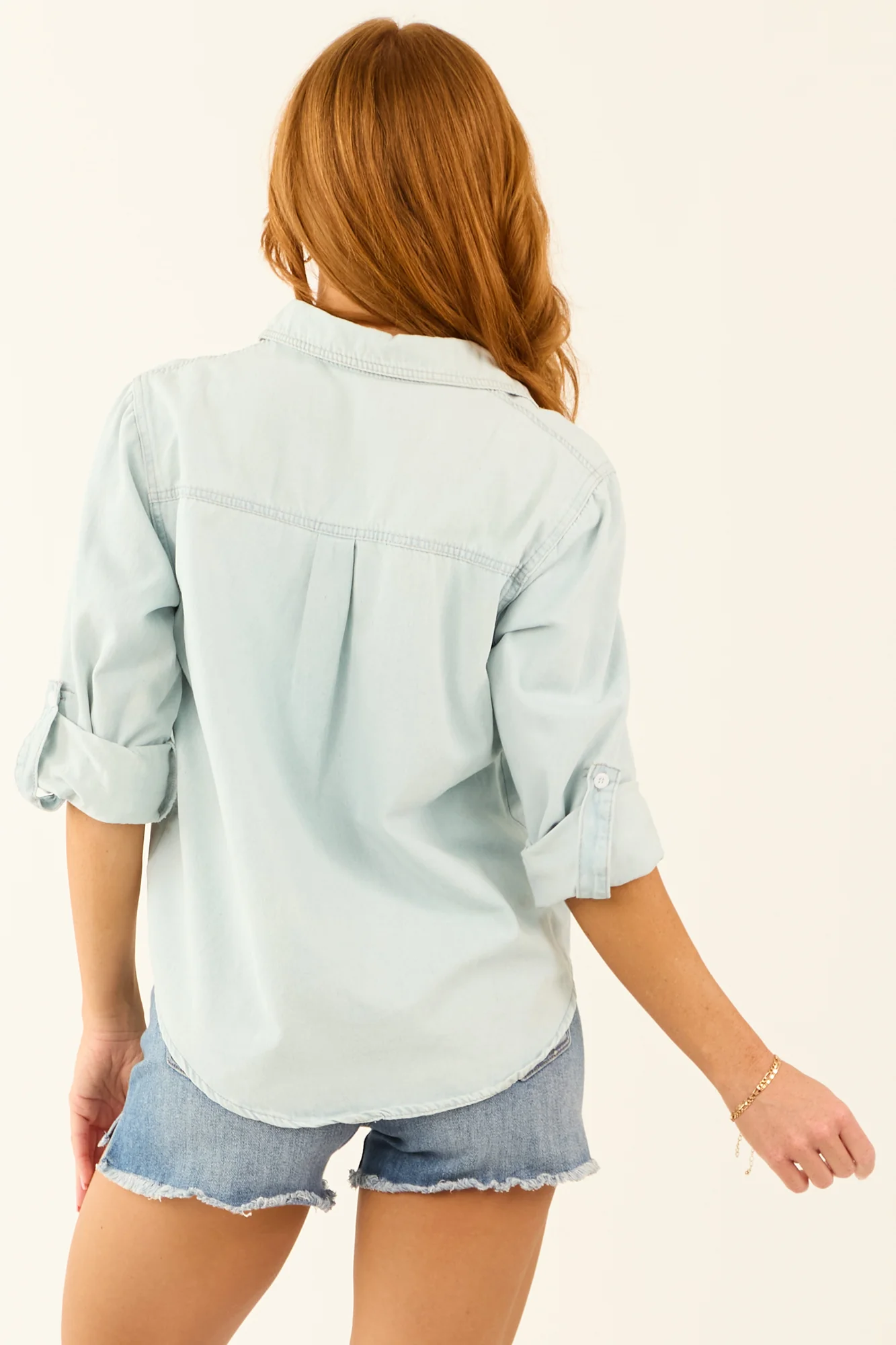 Embrace casual sophistication with our Light Denim Button Up Shirt for women. Crafted from non-stretchy lightweight denim, this shirt features a collared neckline, 3/4 sleeves with banded buttoned cuffs, and functional chest pockets. The long-length design and elbow buttons add a unique touch to this versatile piece. Made of 85% Cotton and 15% Polyester. Machine wash cold, hang to dry for best care. Available in sizes S, M, L, and XL. Model is wearing a size Small.