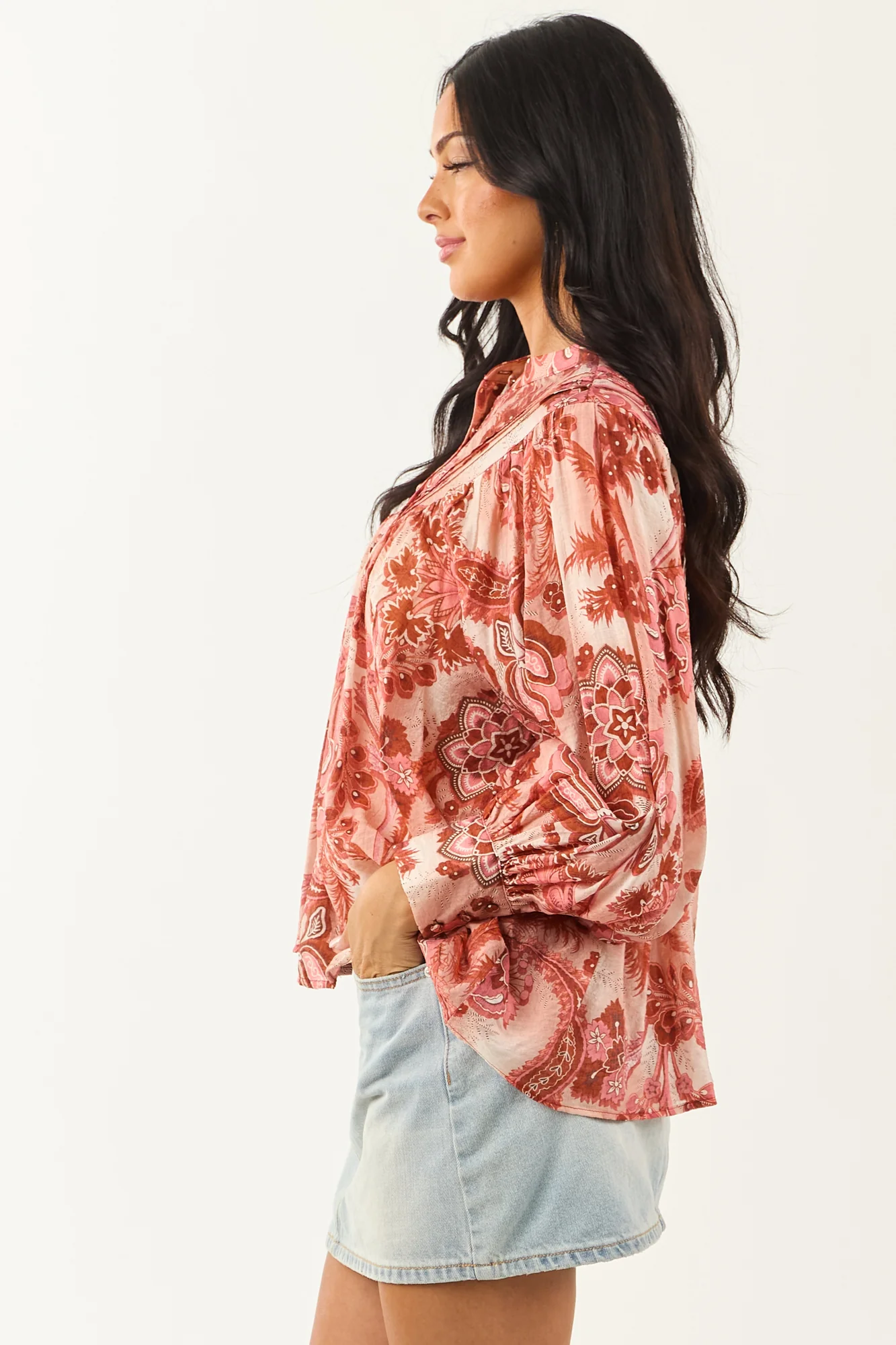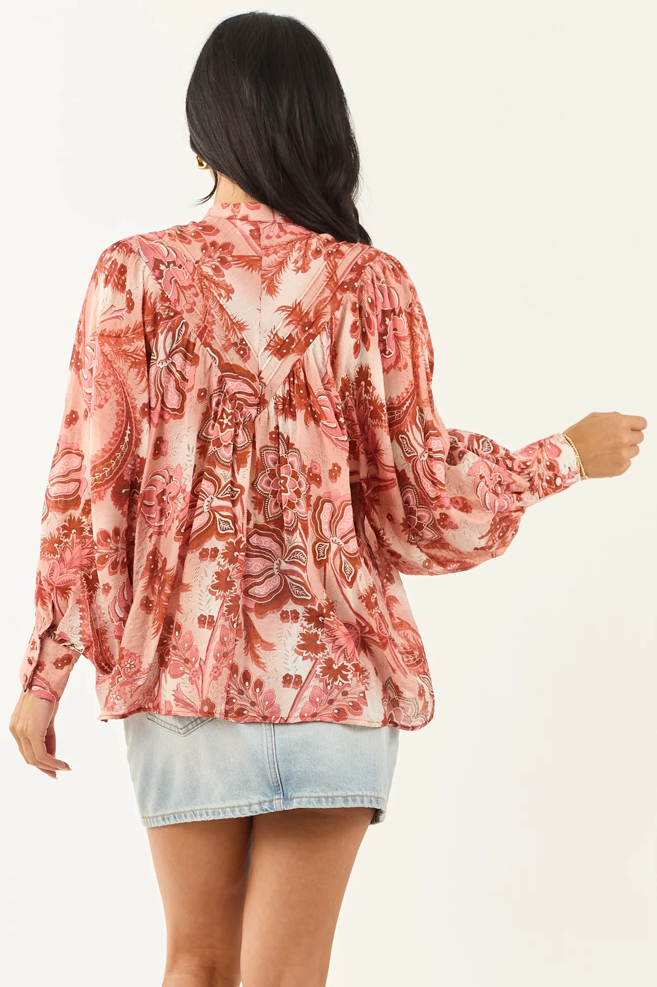 Elevate your look with this gorgeous blush blouse featuring a breezy light feel and a flowy silhouette. Perfect for a stylish brunch date, this top boasts an oversized fit, banded triple button cuffs, and a slightly sheer fabric. The floral print in shades of Blush, Watermelon, Hibiscus, Rust, and Ivory adds a touch of elegance. Crafted from 70% Rayon and 30% Polyester with no stretch. Embrace uniqueness, as each piece may vary slightly due to the cutting and sewing process. Model is wearing a size Small. Model’s measurements: 59″ in height, Bust 34″, Waist 26″.