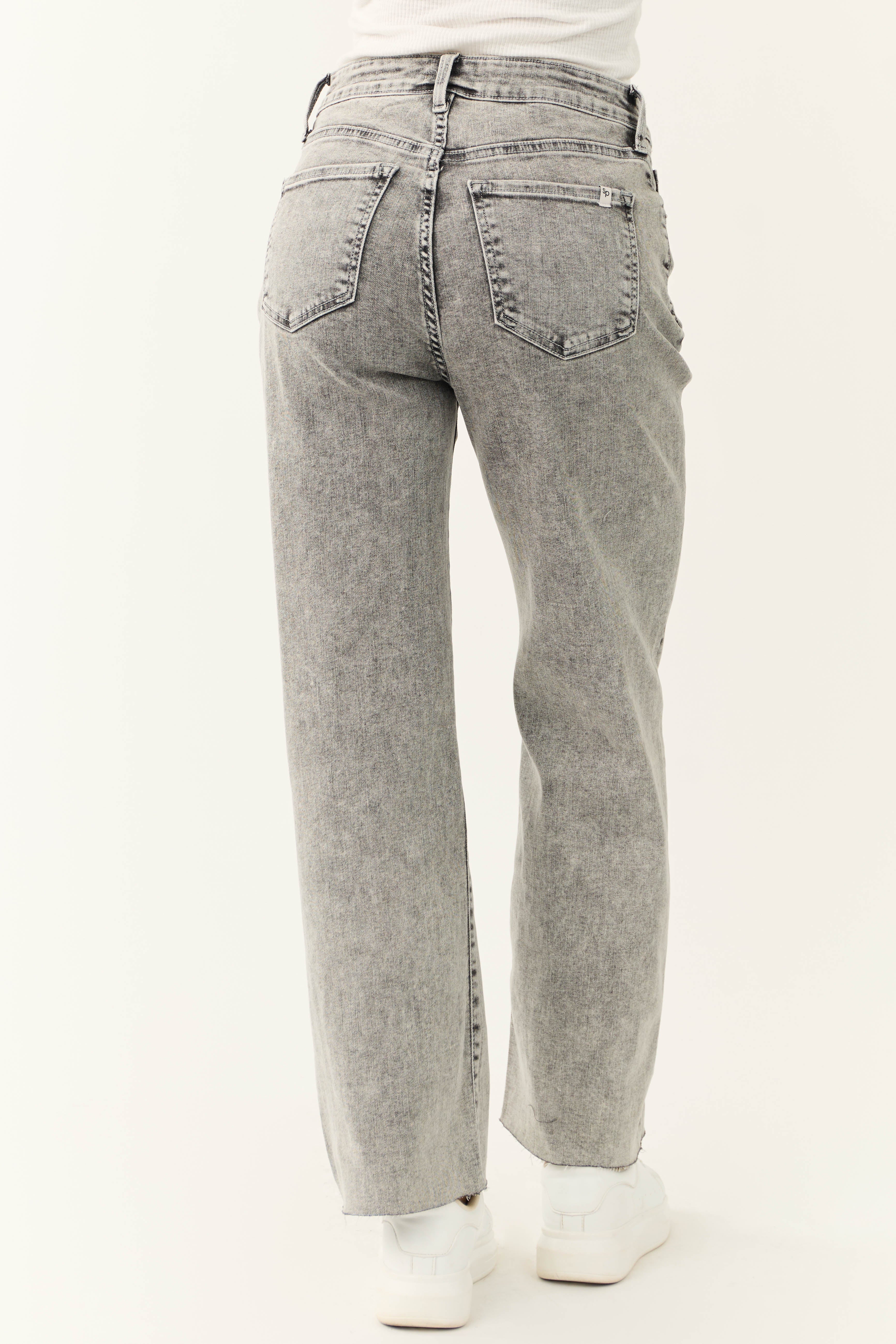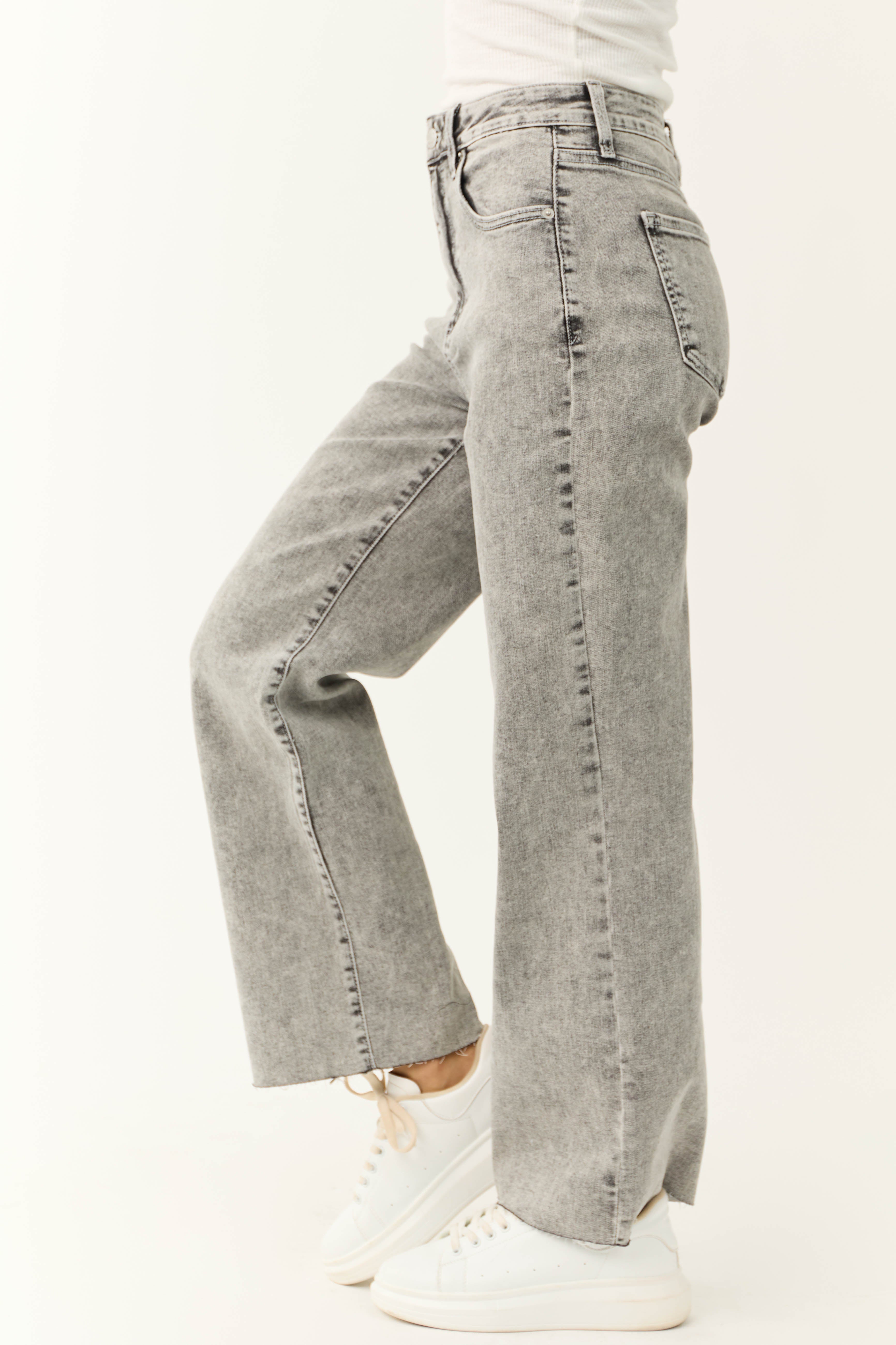 Discover the perfect pair of Light Grey Acid Wash Wide Leg Jeans with a high rise, ankle-length design. Made from semi-stretchy denim with 77% Cotton, 12% Polyester, 9% Rayon, and 2% Spandex for ultimate comfort. The Waistband fits large and allows for 1-3″ extra in waist. Featuring a raw hem, zipper fly with button closure, belt loops, and 5 pockets. Front rise: 11″ Back rise: 15″ Inseam: varies from 27 – 27.5″. Imported. Model is wearing a size 25. Your go-to choice for a trendy and stylish denim look.