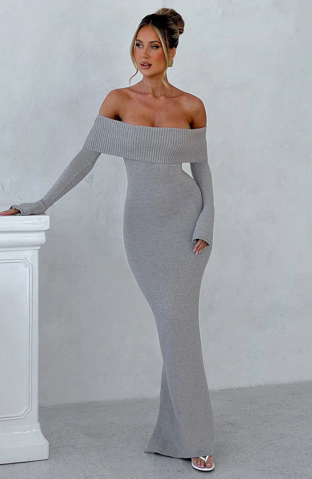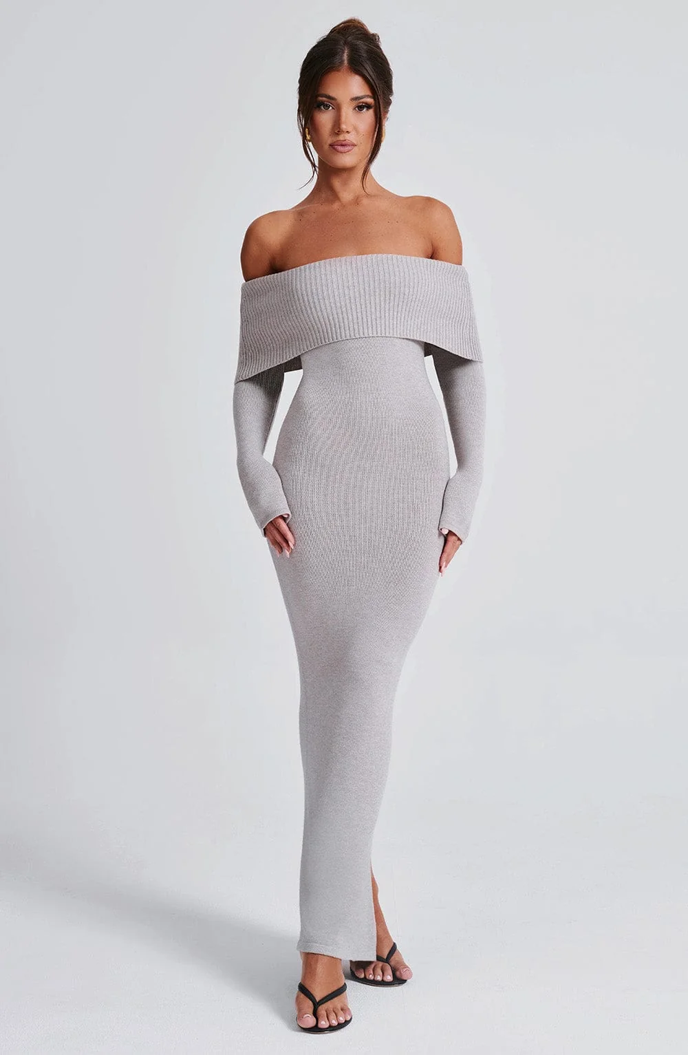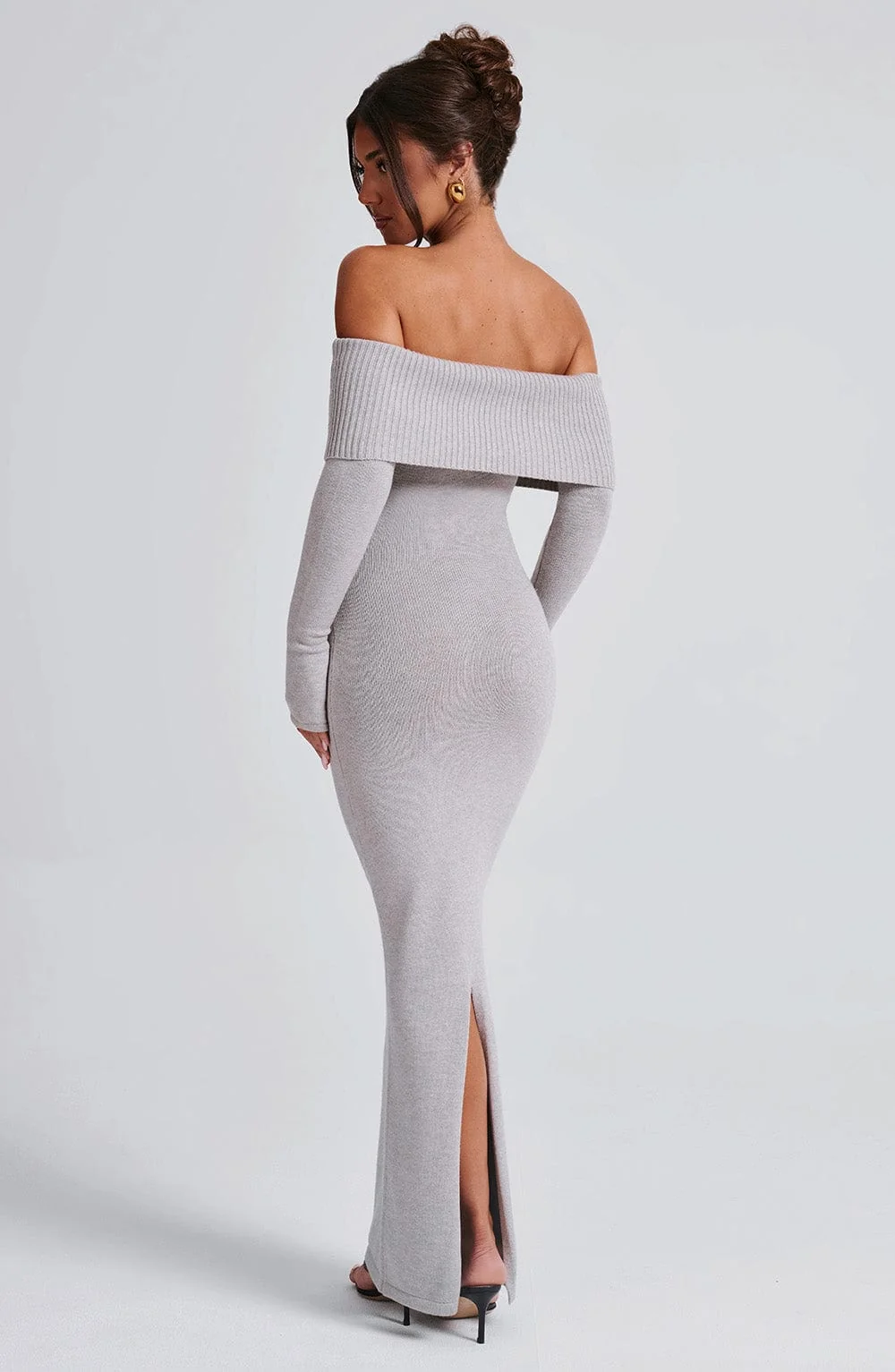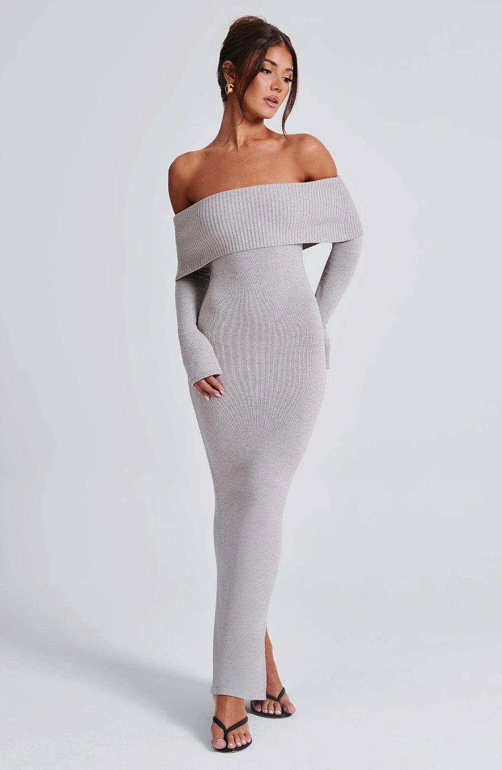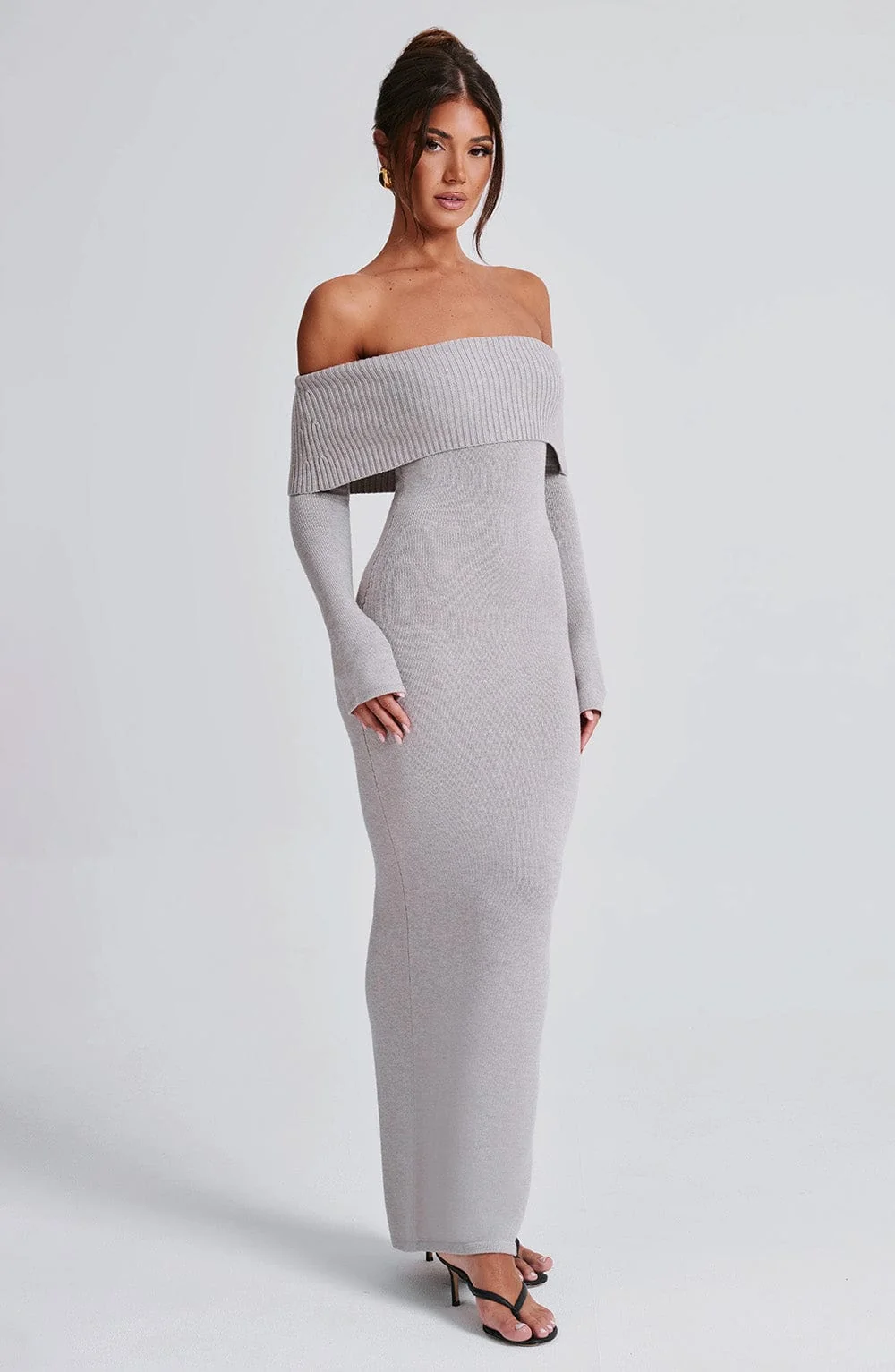 Light Grey Marl Knit Maxi Dress – Premium Off-Shoulder Style