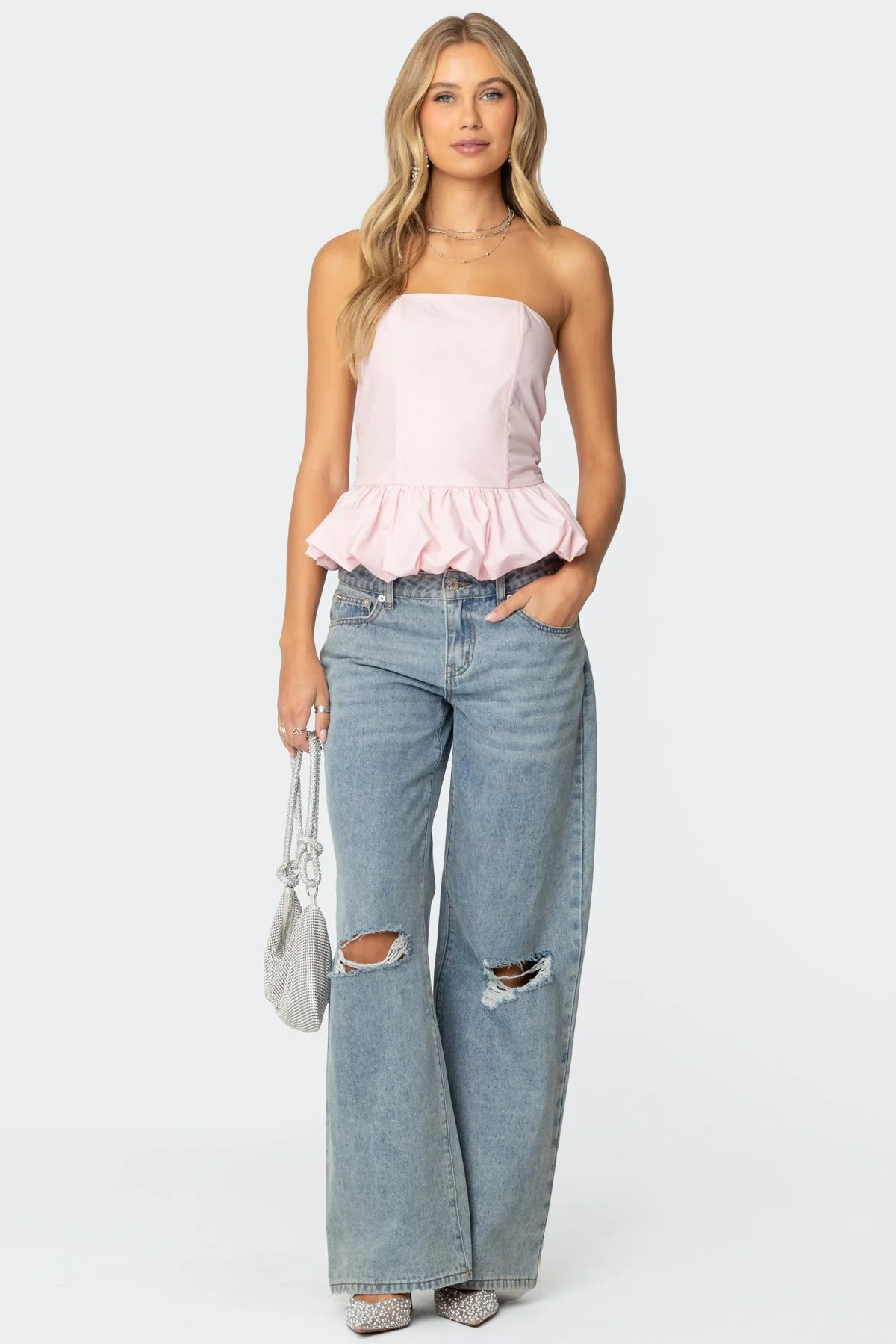 This Light Pink Bubble Hem Corset Dress features a boned bodice for structure and support. Made of Polyester and Cotton, it offers a flattering silhouette with a bubble hem design and structured stitching. Ideal for various occasions, the strapless style adds an elegant touch. Machine washable for easy care. Available in multiple sizes for a perfect fit.