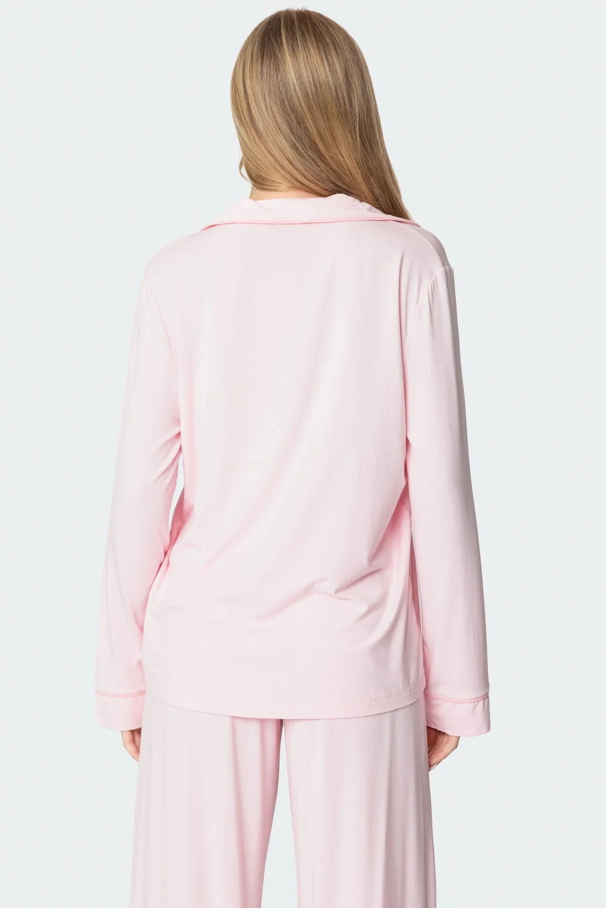 This light pink button up shirt is perfect for lounging in style and comfort. Featuring long sleeves, a collared design, front pocket detail, and piping detailing, this shirt is made of high-quality rayon and spandex. The model wears size S and is 58 tall. Care instructions: Wash with similar colors for lasting quality.