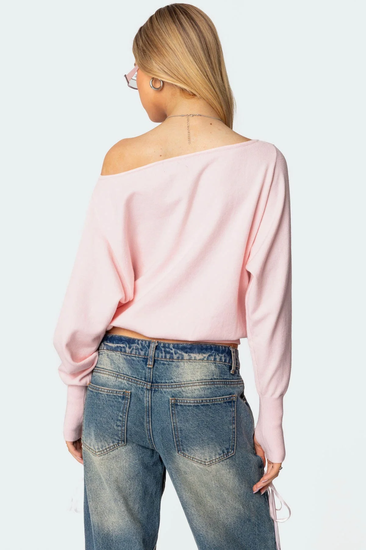 This light pink off shoulder sweater offers an oversized fit with elastic stretch hem & cuffs, thumb holes, and is made of acrylic for a cozy yet stylish look. Perfect for any occasion. The model wears size S, standing 57 tall. Easy care instructions: machine wash at max 30ºC, avoid bleach and tumble dry, iron at max 110ºC, and no dry clean needed. Stay fashionable and comfortable with this chic sweater!