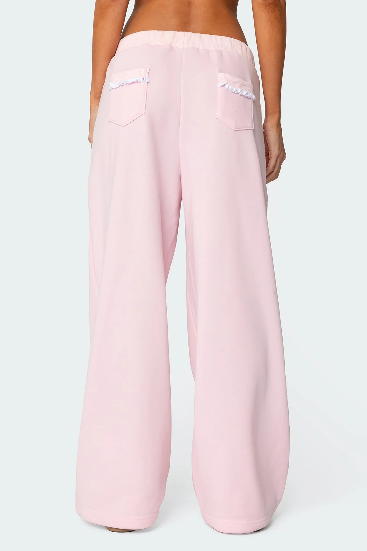 Indulge in comfort and style with our light pink ruffle trim sweatpants for women. Featuring an adjustable tie waist, wide leg design, contrast ruffle detailing, and convenient back pocket, this matching set made of polyester and cotton offers both fashion and function. Feel confident in our loungewear thats perfect for any casual occasion. Elevate your wardrobe with these chic sweatpants. Model wears size S. Height: 59. Care Instructions: Machine wash cold, gentle cycle. Wash with like colors. Do not bleach. Tumble dry low. Iron low heat. Do not dry clean.